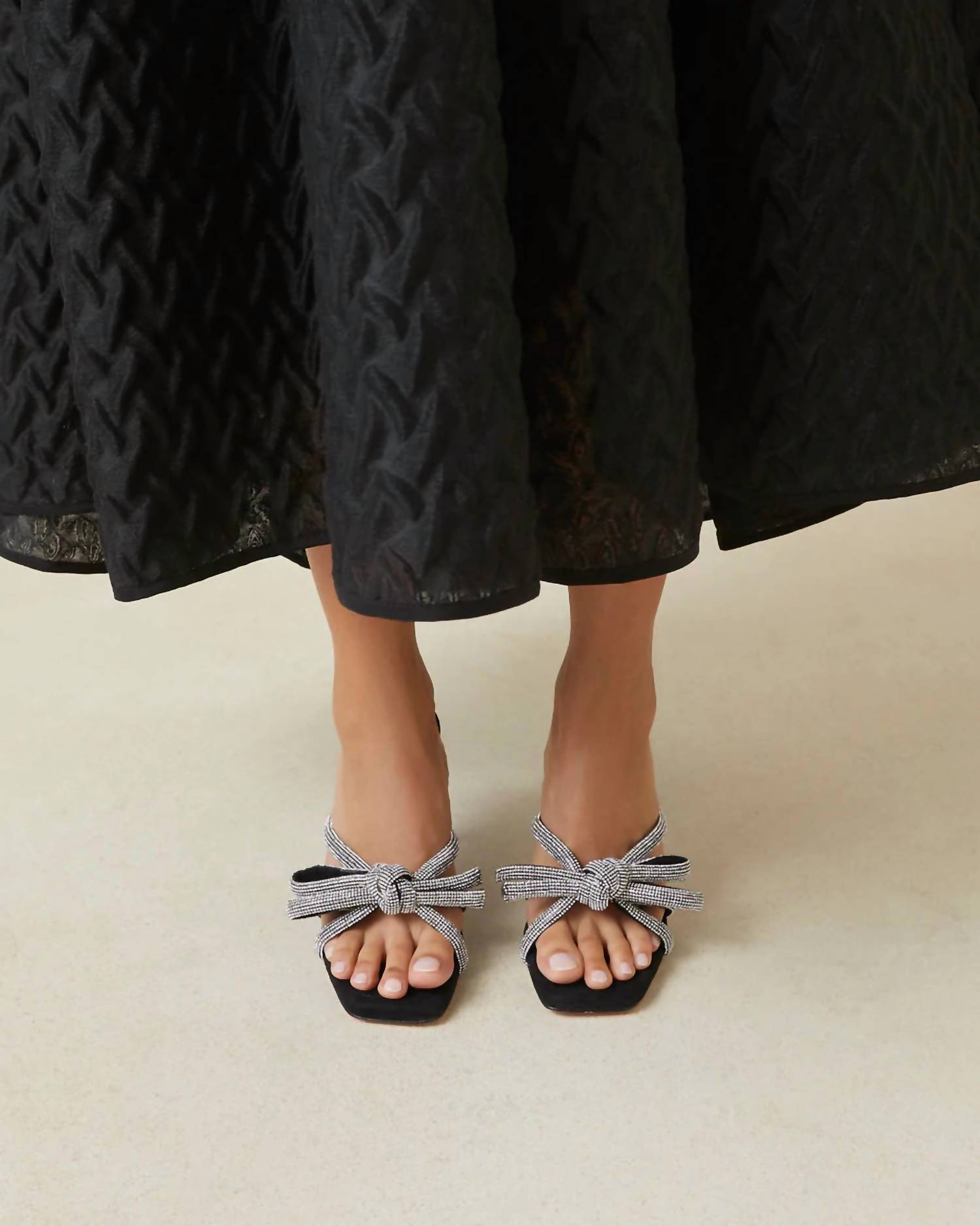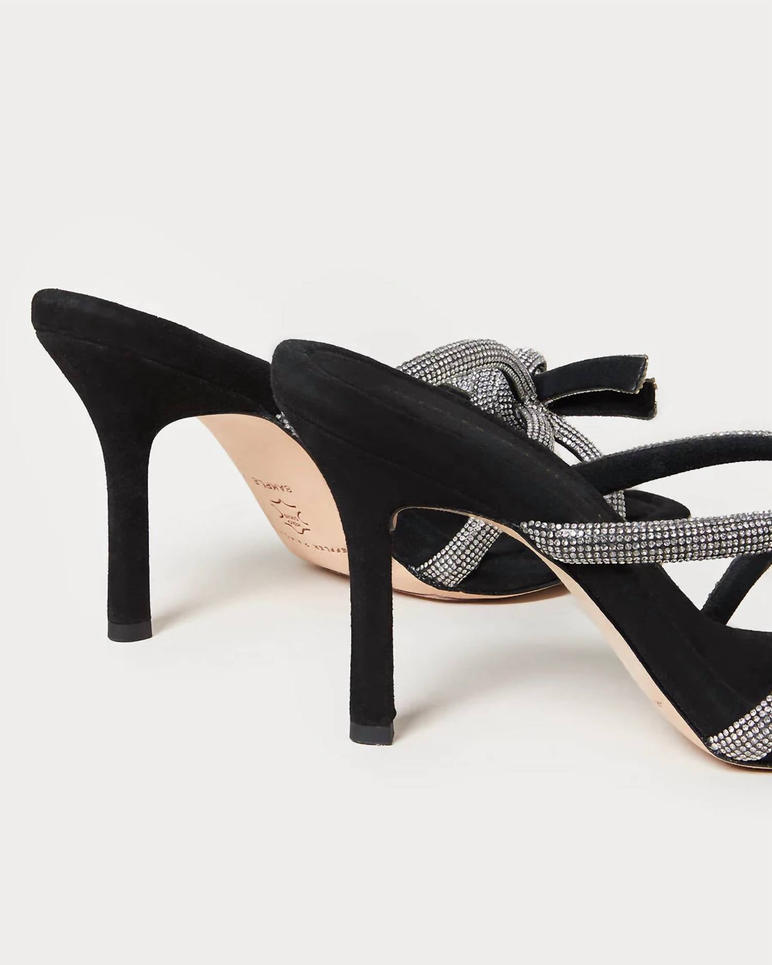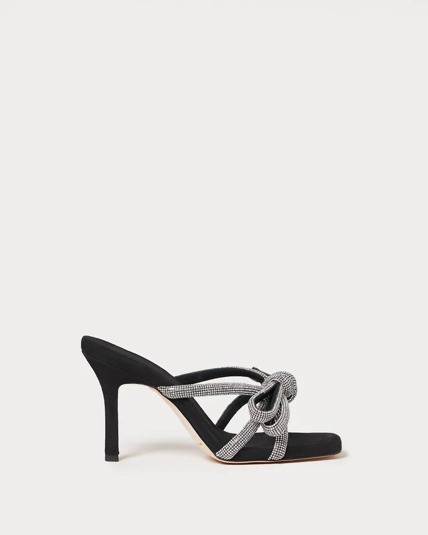 Heeled sandal with knotted bow detail. Padded footbed with gold logo. Open, squared toe. 3.5-inch heel. Upper: 50% goat kid suede, 50% glass rhinestones. Outsole: 100% bovine leather. True to size. Water repellent recommended. Avoid water. Professional cleaning only.