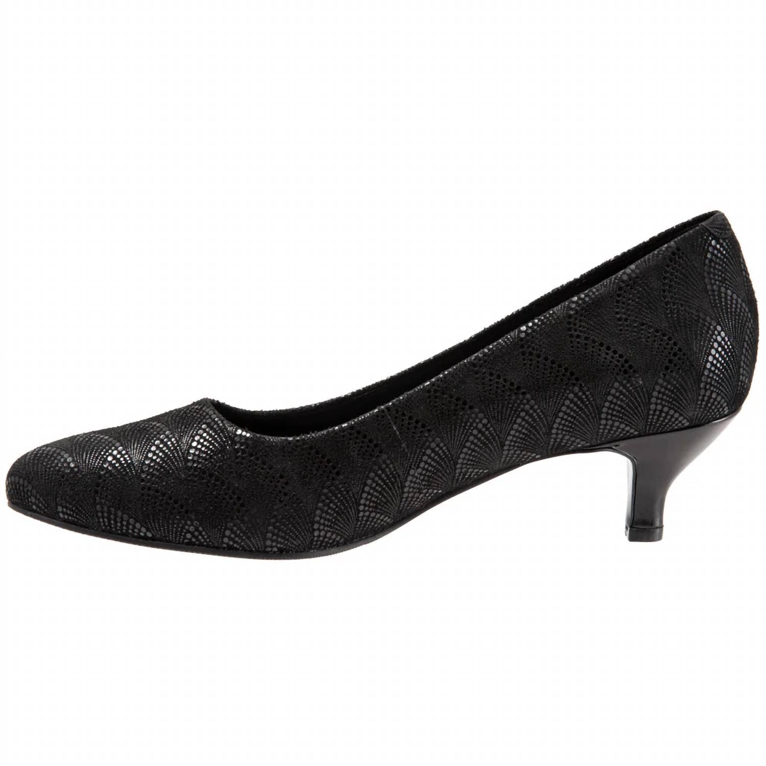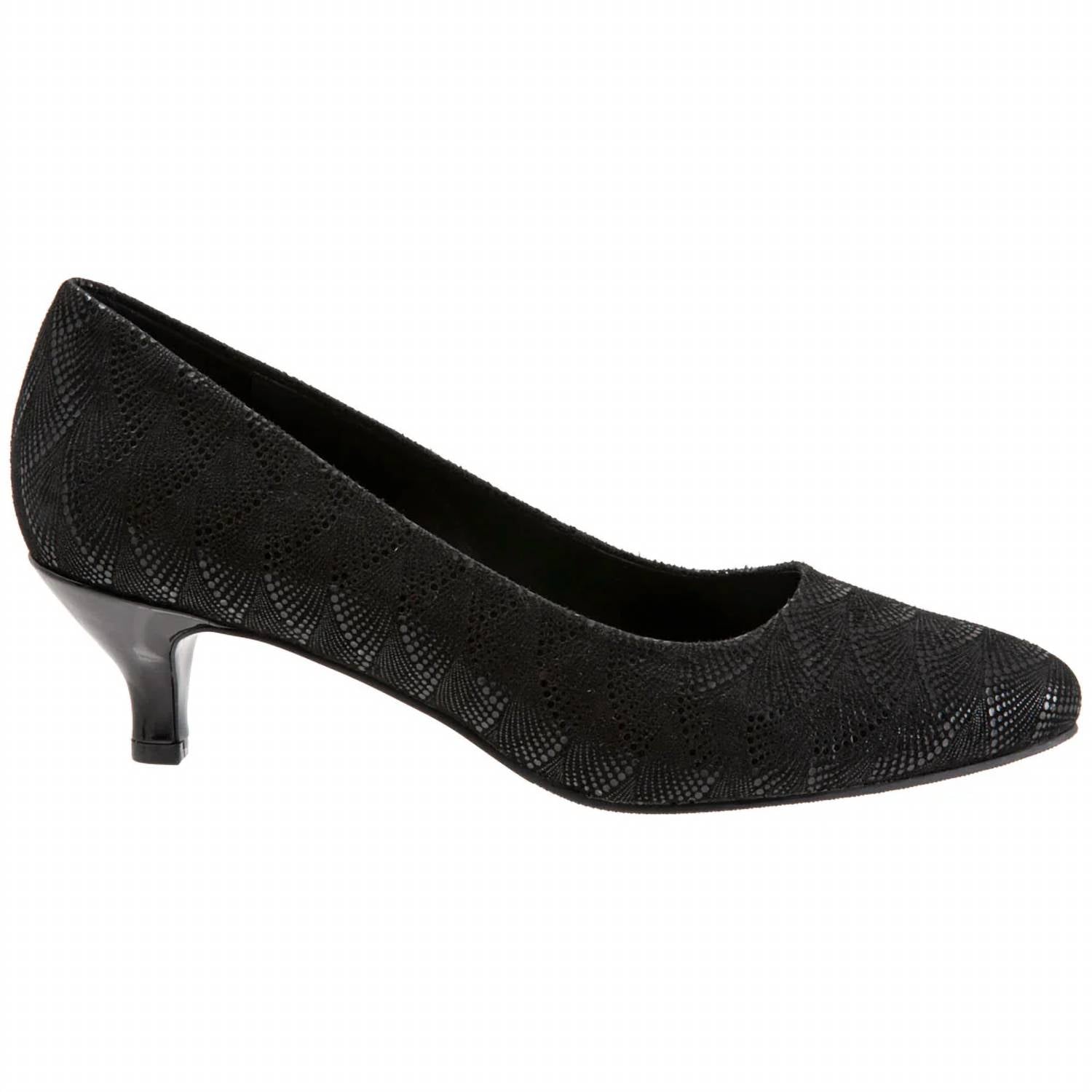 The perfect height for day to night. Introducing the Kiera Leather Heel by Trotters, a sophisticated choice with an elegant almond toe in chic Black Waves. This women's heel features a soft antimicrobial lined and cushioned insole and a removable cushioned footbed with arch support for enhanced comfort. The leather upper is complemented by a soft man-made Nappa lining, while a lightweight flexible rubberized sole supports the 2-inch kitten heel. Effortlessly stylish and designed for comfort, these heels are perfect for elevating any outfit.