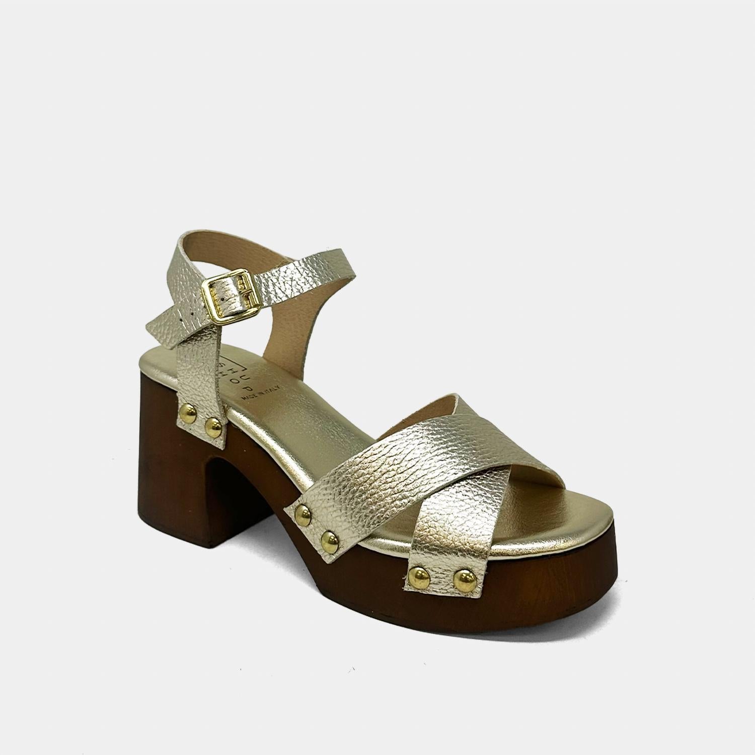 Don't be deceived, these heels are comfy as can be. Elevate your style with the Giovanna Sandal by SHU SHOP, a stunning platform heel in metallic gold. Crafted in Italy, this shoe features an open-toe design, a sculptural wooden sole, and crisscross leather straps for '70s-inspired glam. Highlighted with gold-tone rivet accents and a secure ankle strap, it promises both elegance and stability. Ideal for women seeking a bold, versatile piece that complements both day and evening looks.