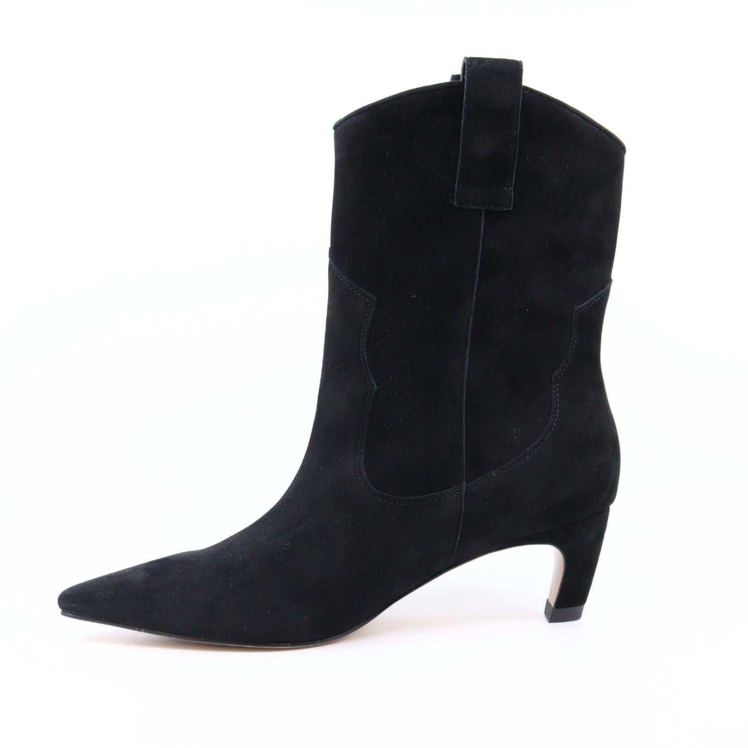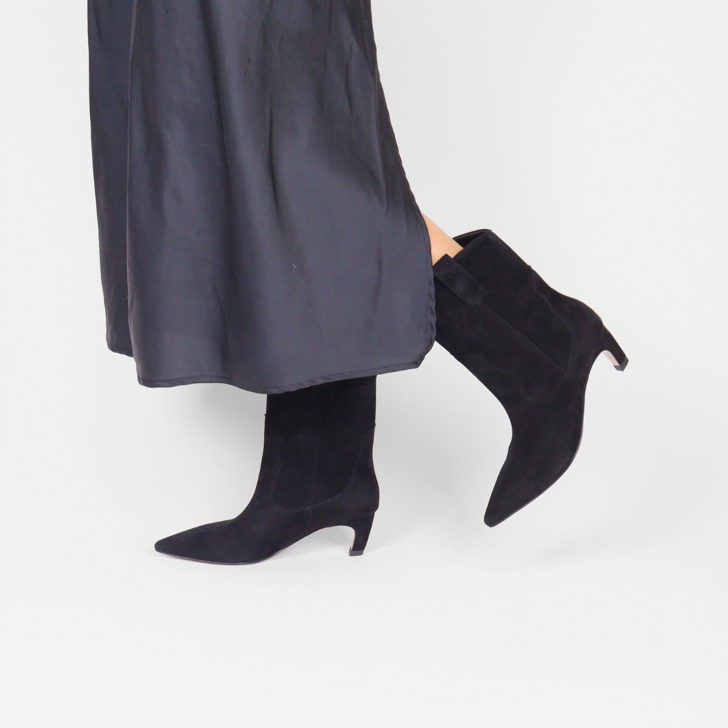 Don't be deceived, these heels are comfy as can be. Step into style with the Dicte Suede Boots by Shoe the Bear, crafted from 100% certified suede leather for a luxe touch. These western-inspired boots in classic black feature a pointy toe and a mid-high shaft height. Heel height is 2 inches, shaft height is 8.2 inches, and shaft width measures 5.5 inches. Effortlessly blend authenticity and function with the convenient pull tab and modest heel.