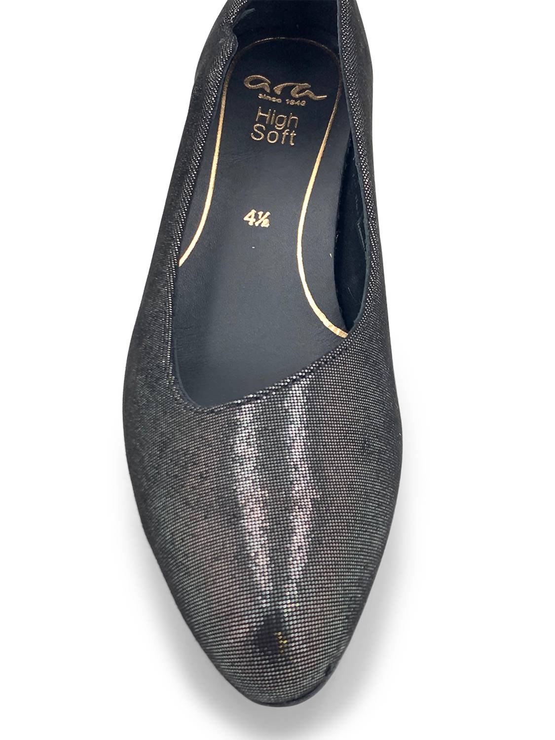 Don't be deceived, these heels are comfy as can be. Step into elegance with Women's Kat Heels by Ara, featuring a charming 1.5" kitten heel in a sophisticated black metallic print. This heel boasts an almond toe and an asymmetrical vamp, perfect for enhancing your workwear or adding a touch of glam to a dinner party. Enjoy all-day comfort with Ara's signature HiSoft padded arch support. For those with narrow feet, consider a fit pack for a snug fit.