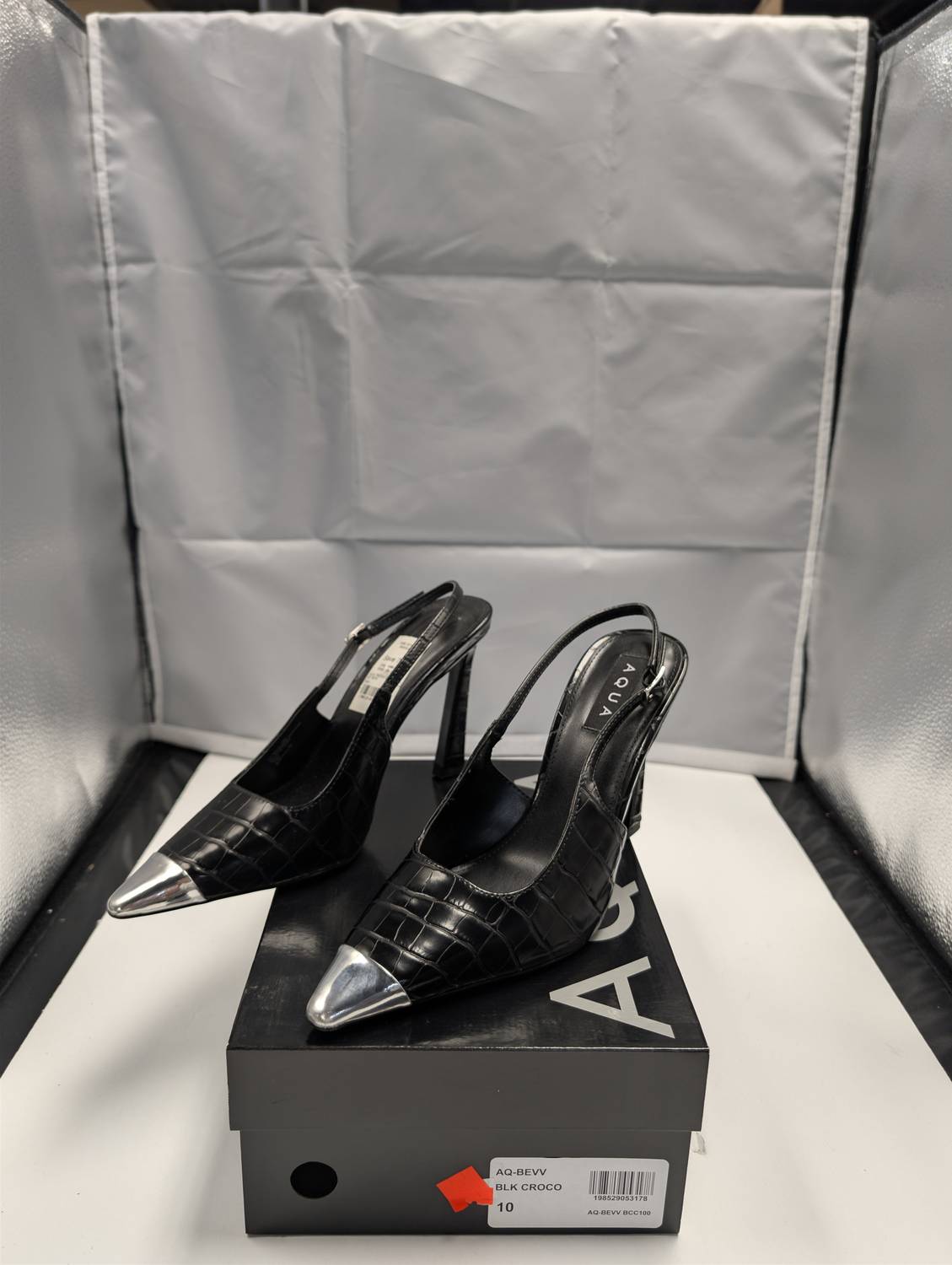 Don't be deceived, these heels are comfy as can be. The Bevv slingback pumps by Aqua feature a leather upper, polyurethane lining, and synthetic sole. These heeled pumps have a pointed toe and showcase a croc effect.