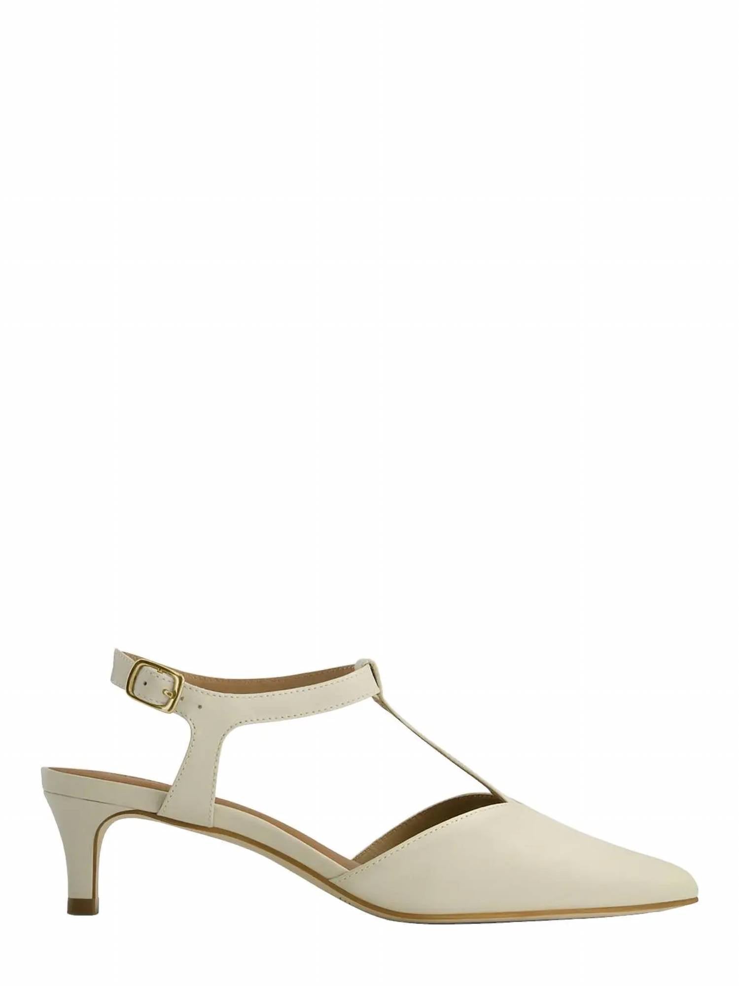 The perfect height for day to night. Step into elegance with the Malta Slingback Kitten Pumps by Bernardo, a sophisticated choice for your next dinner party. Crafted from premium leather, these minimalist heels in a graceful Eggshell Antique Calf feature a chic T-strap and intricate cut-out detailing. The design is completed with a pointed toe and a comfortable 1.75-inch (45 mm) kitten heel, resting on a leather outsole and lining. Expert craftsmanship from Brazil, with professional cleaning recommended to maintain their pristine appearance.