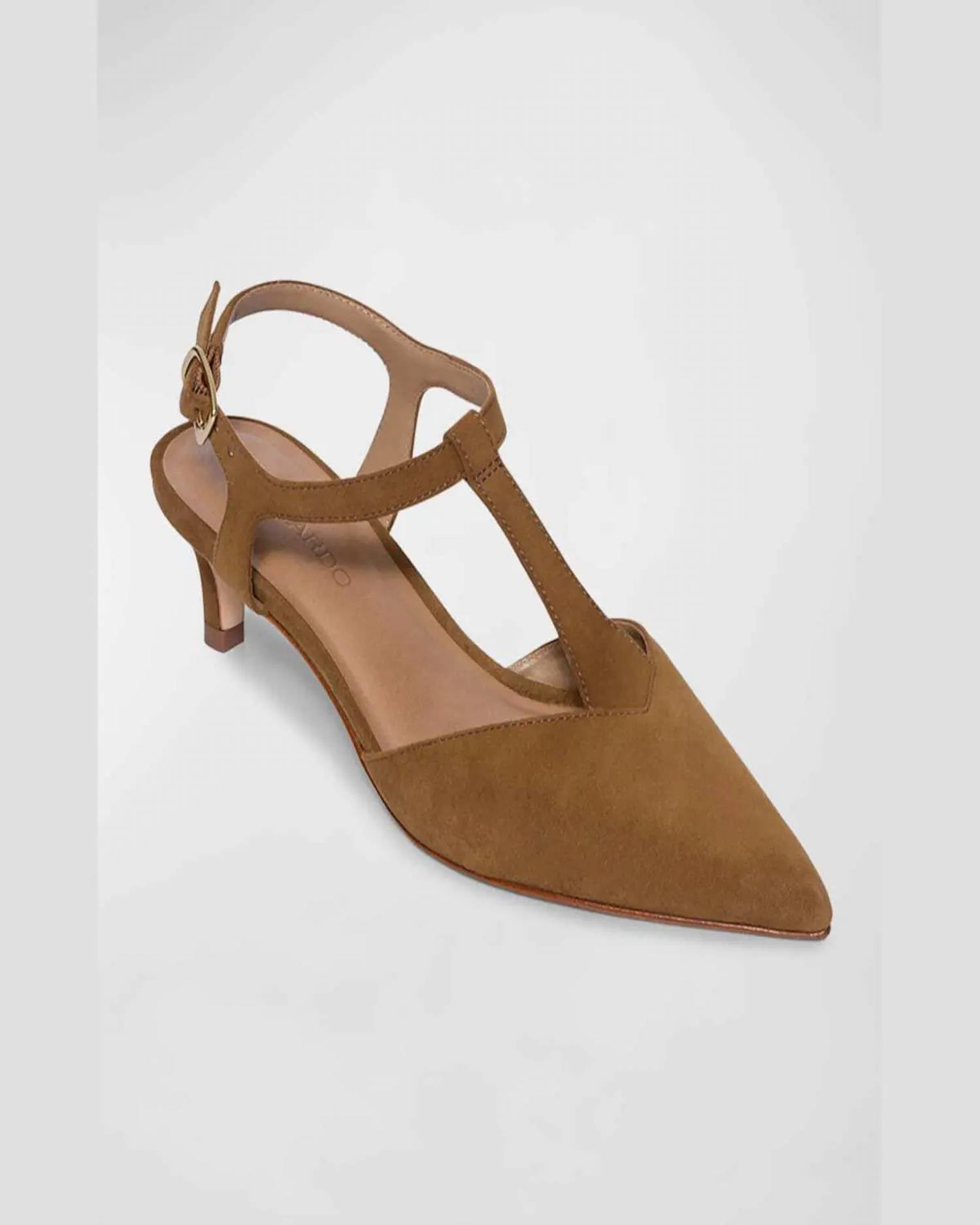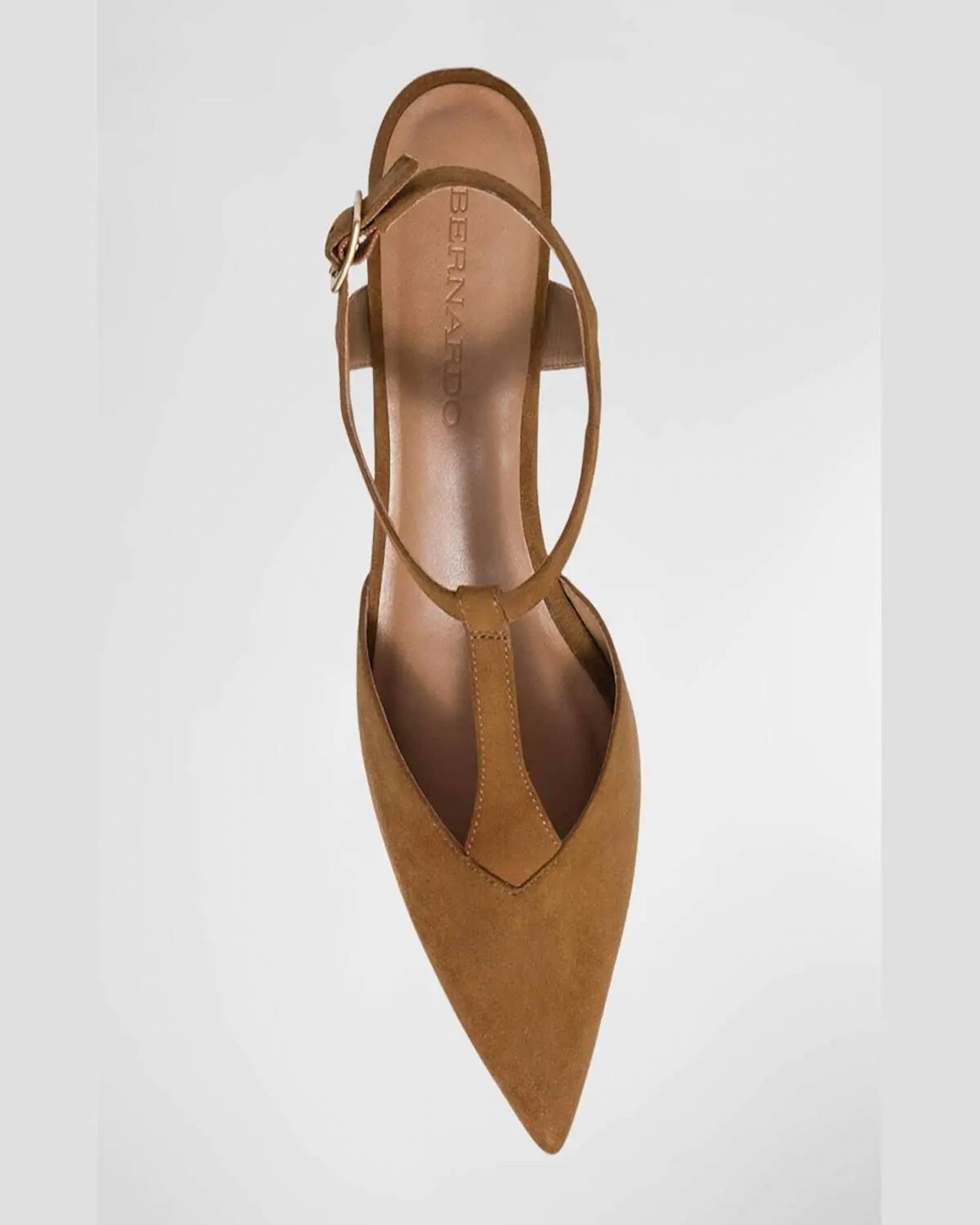 The perfect height for day to night. Introducing the Malta Slingback Kitten Pumps by BERNARDO, a sophisticated choice for any dinner party. These pumps feature a suede upper with a stylish t-strap and cut-out details, set on a low 1.75" kitten heel. The Safari Kid Suede lends a chic, minimalist touch, while the pointed toe shape adds elegance. Perfect for spring occasions, these shoes are crafted for the modern woman who appreciates understated style.