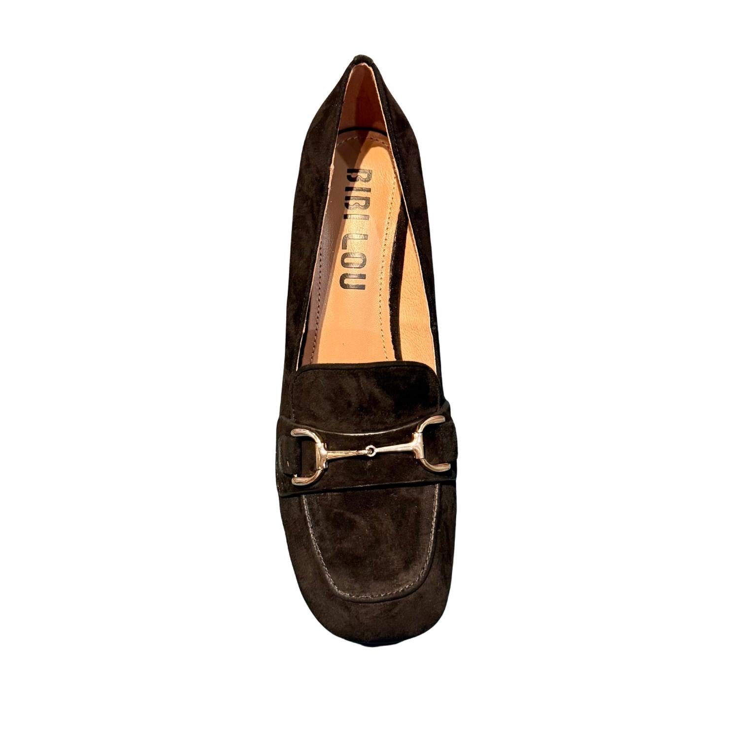 The perfect height for day to night. Introducing the Women's Ashe Horse Bit Pumps by Bibi Lou, a striking footwear piece in classic black suede. Designed for a sophisticated look, these pumps feature a squared toe and a stylish block heel with a height ranging from 1 1/4" to 2". The luxurious suede material ensures a soft and comfortable fit, perfect for a dinner party. Ideal for the maximalist trend this spring, it's a refined choice for any elegant occasion.