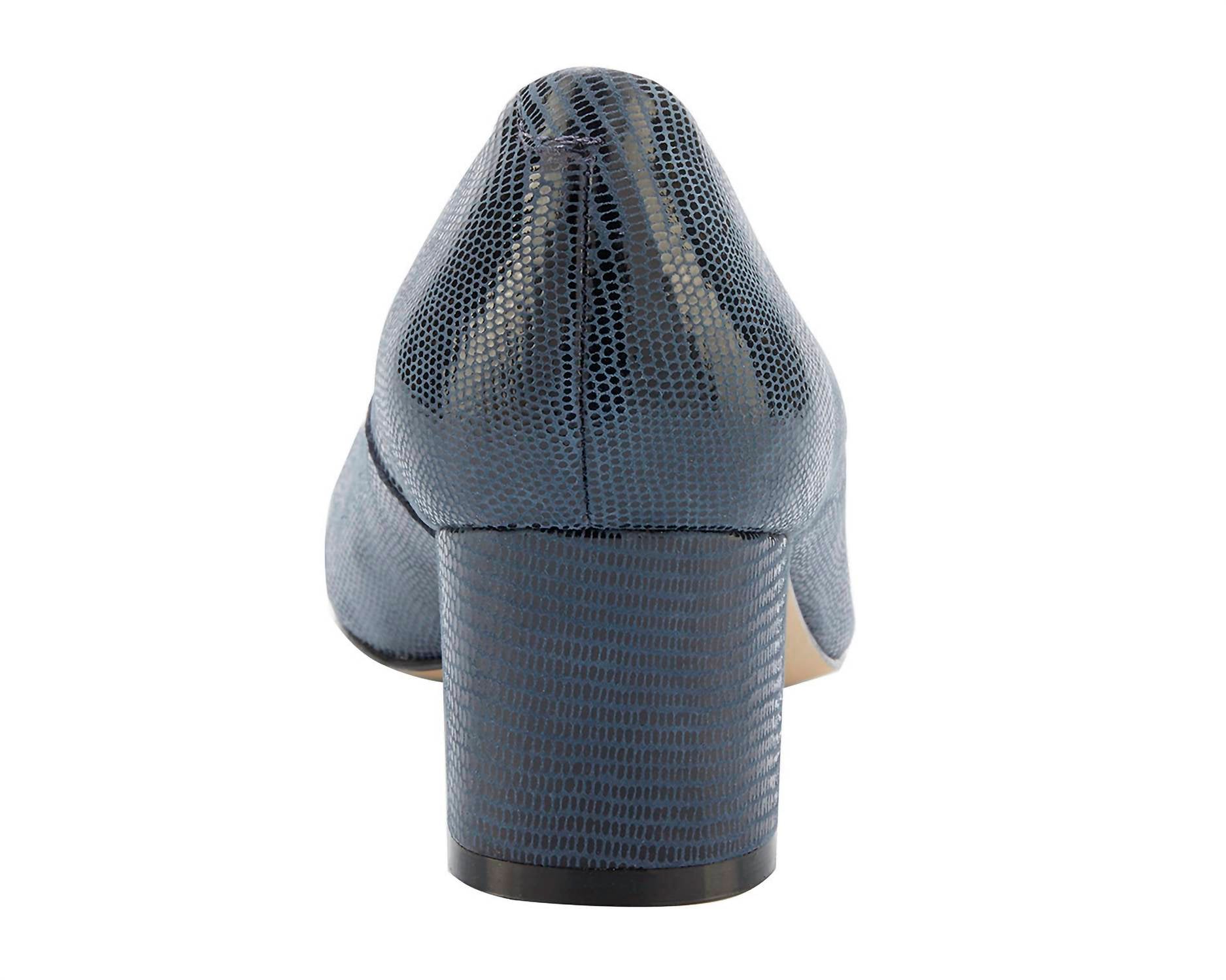 Don't be deceived, these heels are comfy as can be. Step into timeless elegance with the Women's Jessica Heeled Shoes by Ros Hommerson. Crafted in Brazil, these pumps feature a smooth or lizard print patent leather upper in a sophisticated navy shade. The design includes a round toe and a comfortable two-inch block heel, perfect for all-day wear. Enjoy the added comfort of cushioned, removable Tiny Pillows insoles and a supportive knit fit lining, set atop a skid-resistant rubber outsole.