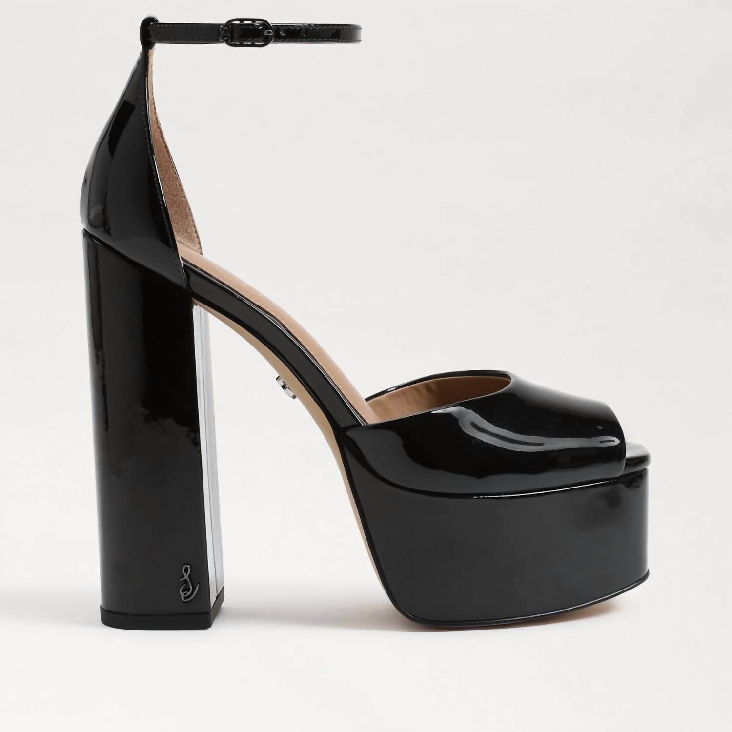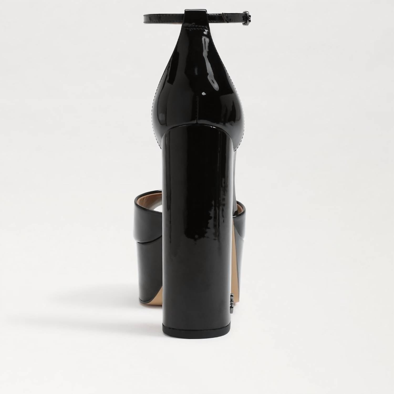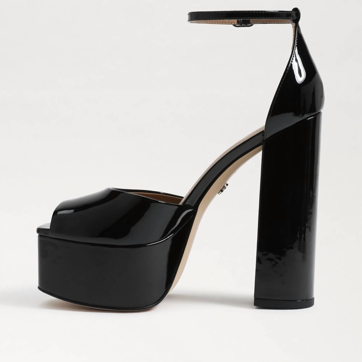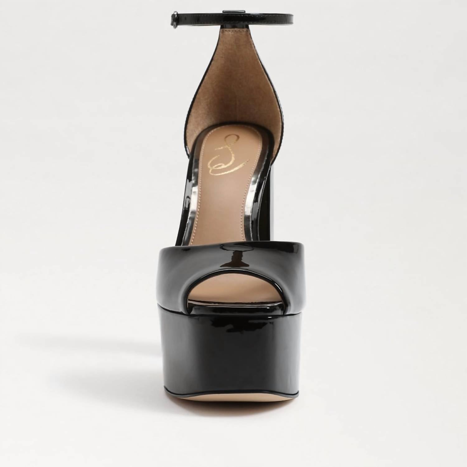 The perfect height for day to night. Elevate your style with the Sam Edelman Kori Platform Heel, designed in sleek black patent leather for a minimalist touch. This standout heel boasts a 4.29-inch chunky platform and a peep toe, complemented by a stabilizing buckle ankle strap to keep you comfortable all night. Composed of leather, synthetic, fabric, and other materials, with a synthetic insole, these heels are perfect for New Year's Eve or a dinner party occasion. Ideal for the fall season, these high heels redefine chic with every step.