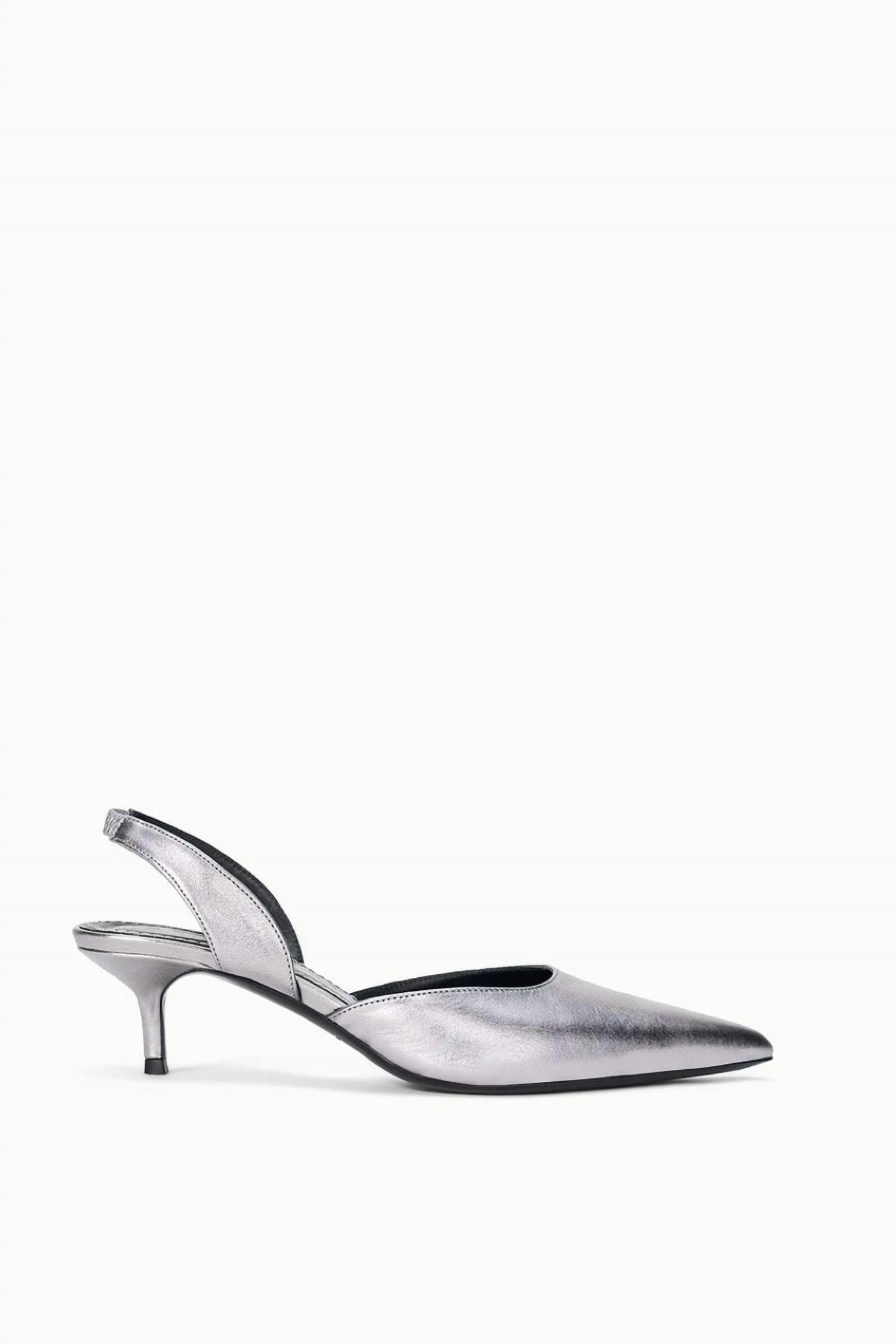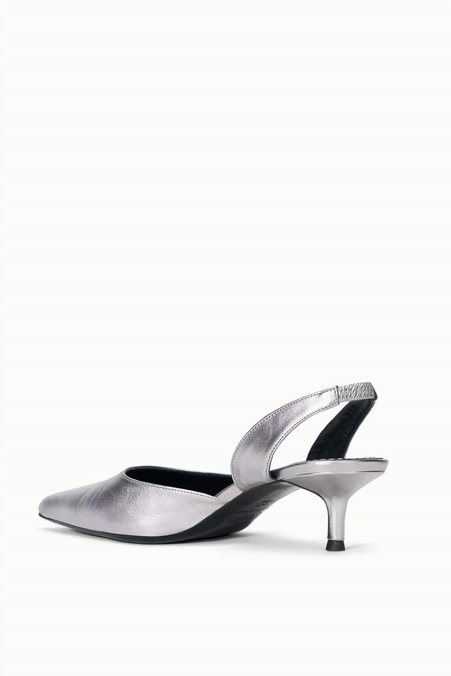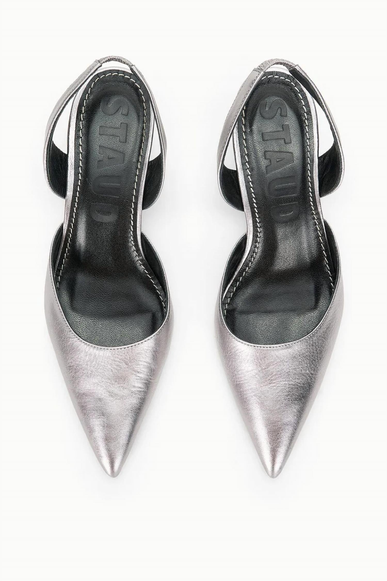 Don't be deceived, these heels are comfy as can be. Step into quiet luxury with the Women's Sebastian Slingback Pumps by STAUD, a perfect choice for your next evening event. These Pewter metallic leather heels feature a sophisticated pointed toe and a stylish slingback design. Made with 100% cow leather upper and a durable sole consisting of 95% cow leather and 5% rubber, these pumps offer both elegance and comfort. With a 2.2-inch mid kitten heel, you'll enjoy a chic aesthetic ideal for the spring season.