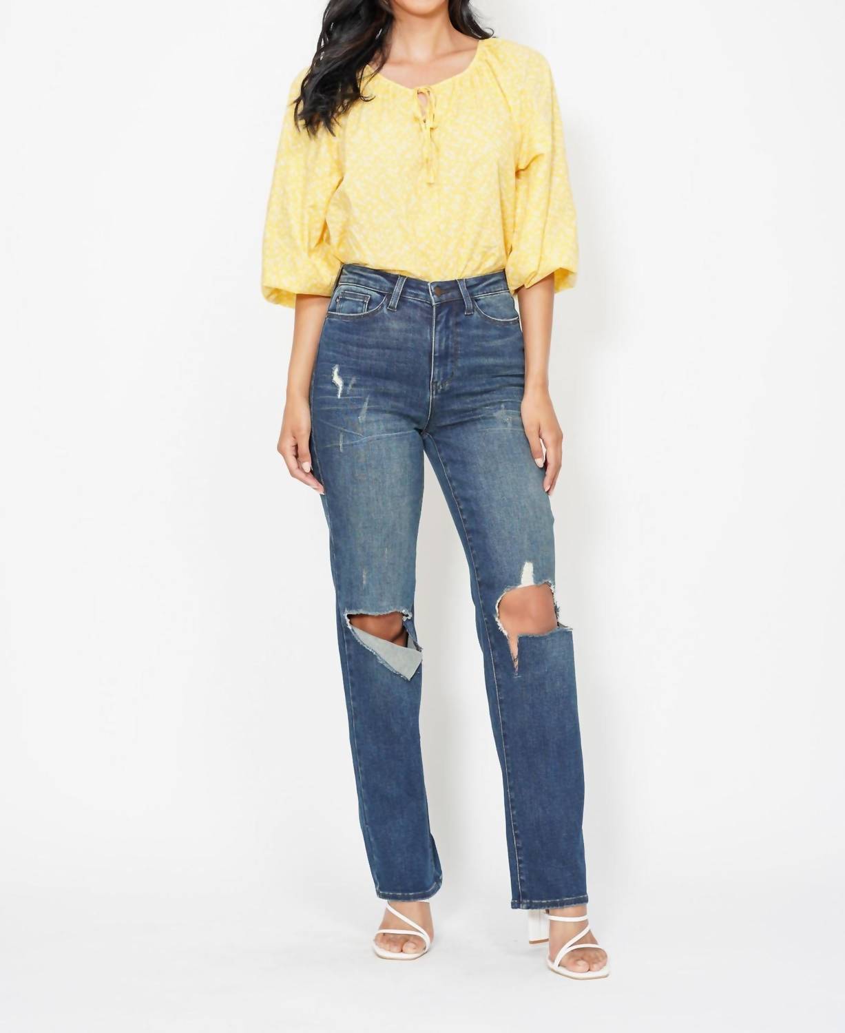 Tuck your favorite tee into these high-waist jeans for a more casual-cool feel. Elevate your denim collection with Judy Blue's High Waist Knee Ripped Denim Jeans, available in classic blue. These jeans boast a high-rise design with a 12" front rise and 30.5" inseam, ensuring a flattering fit for every silhouette. Made from a cotton blend with 67% cotton, 22.5% polyester, and 1.3% spandex, they promise comfort and flexibility. Featuring a button closure and straight leg style, they are easy to care for—simply machine wash in cold, and tumble dry on low. Ideal for regular sizing, though it is advised to size up.