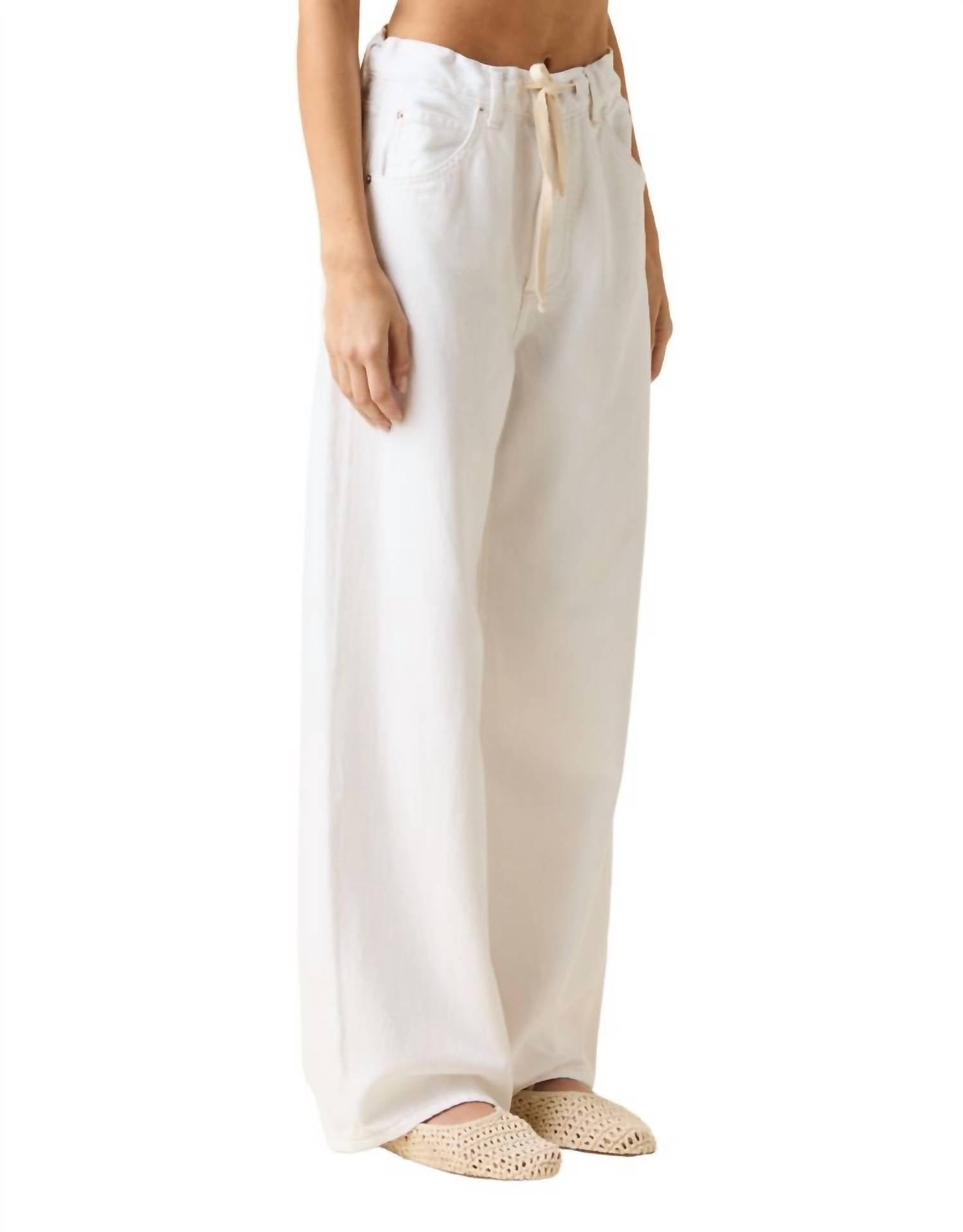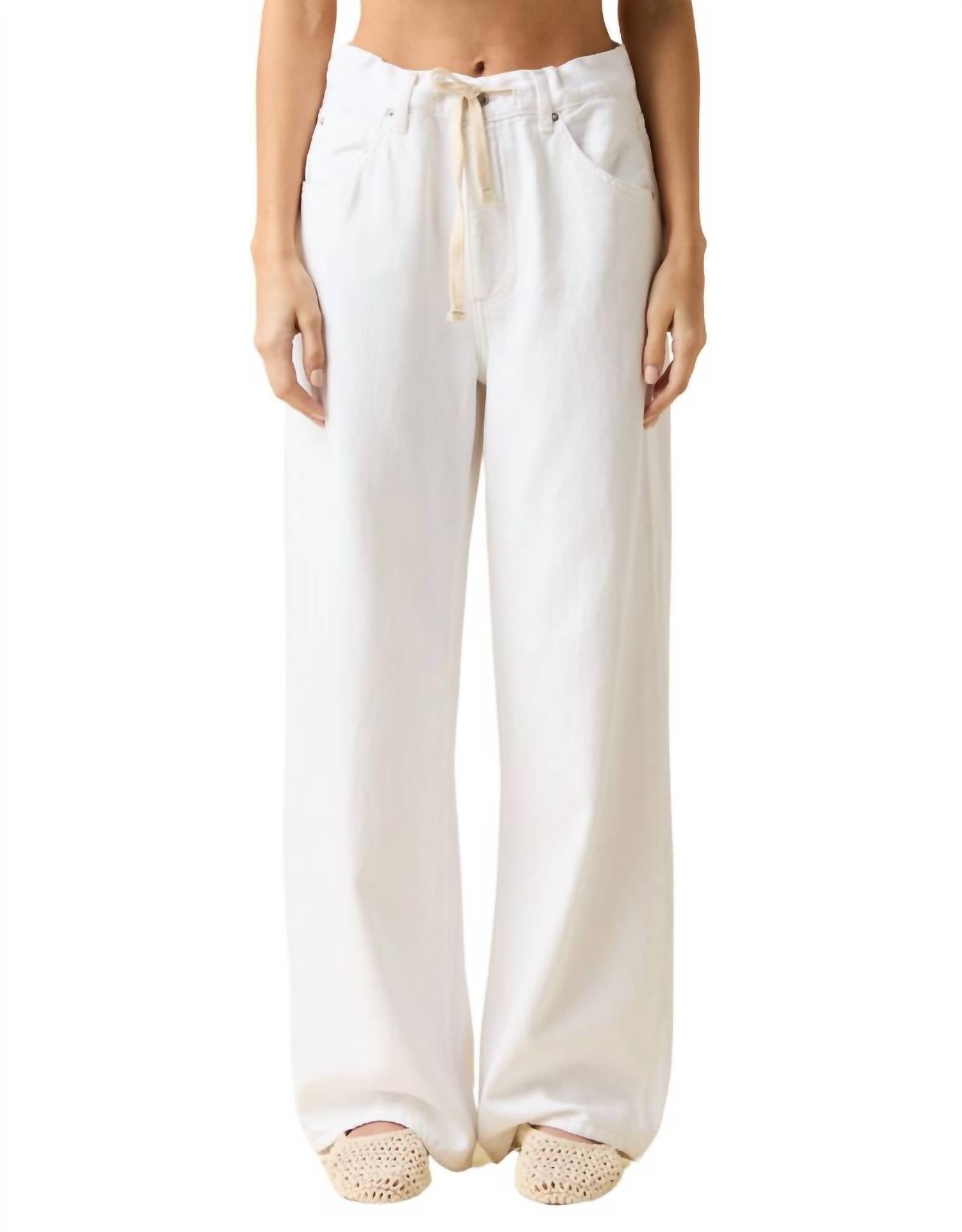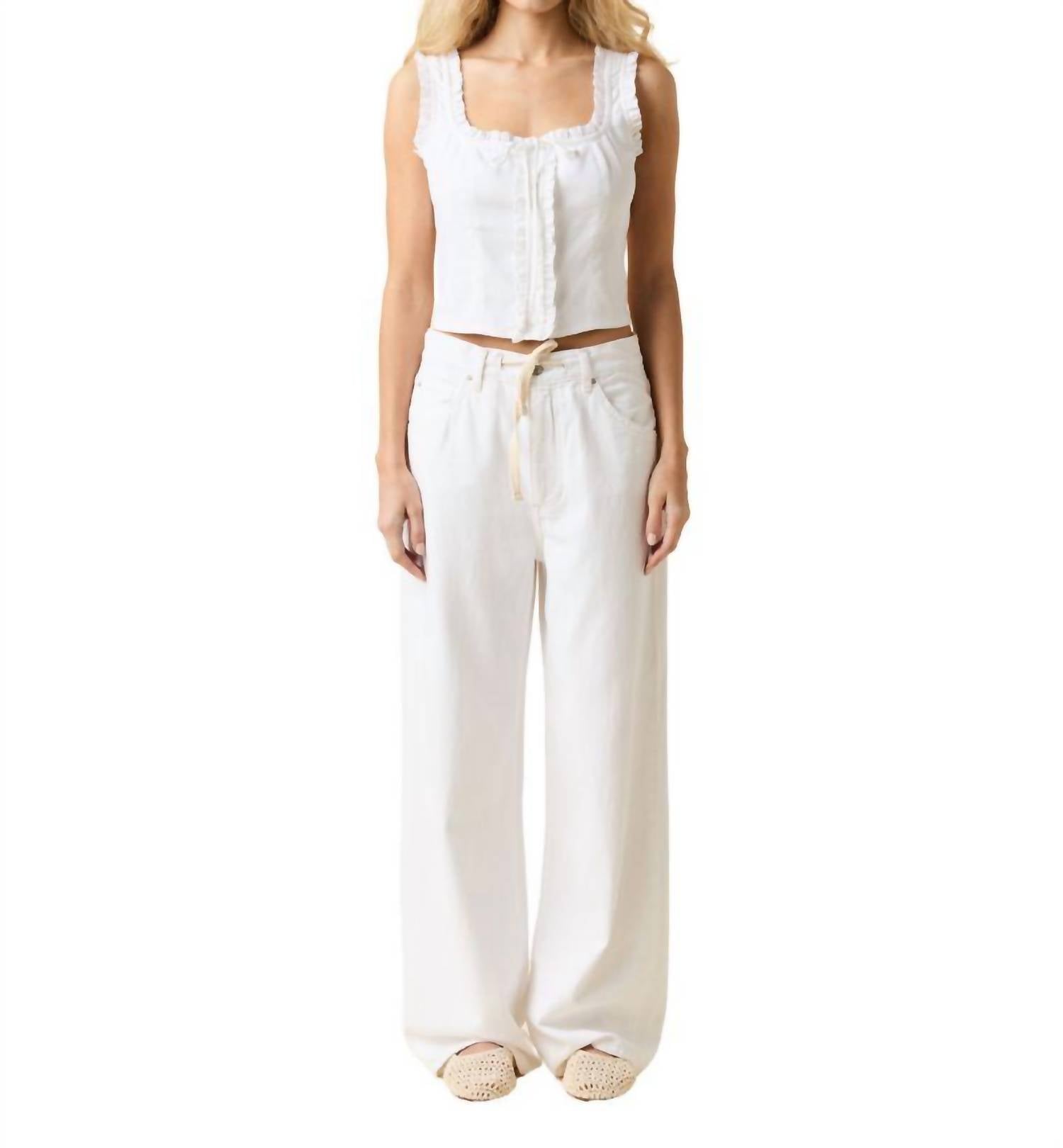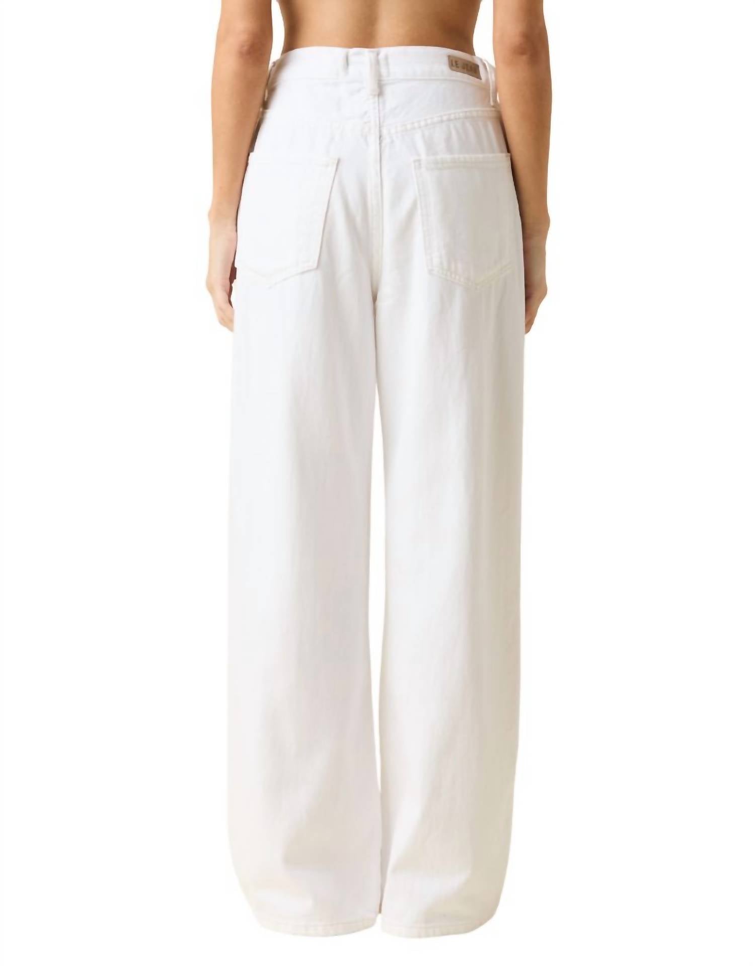 High-waist is here to stay and we especially love this style. Introducing the Luna Relaxed Jean by Le Jean, a stylish addition to your wardrobe designed for ultimate comfort and trendsetting fashion. These high-rise, wide-leg jeans in solid white feature a relaxed fit complemented by a convenient zip closure and practical pockets. The jeans are crafted from 100% cotton, offering both breathable comfort and durability. Care is simple with machine wash instructions, making them perfect for vacation and streetwear style. Rise: 12 inches, Inseam: 31 inches, tailored for women.