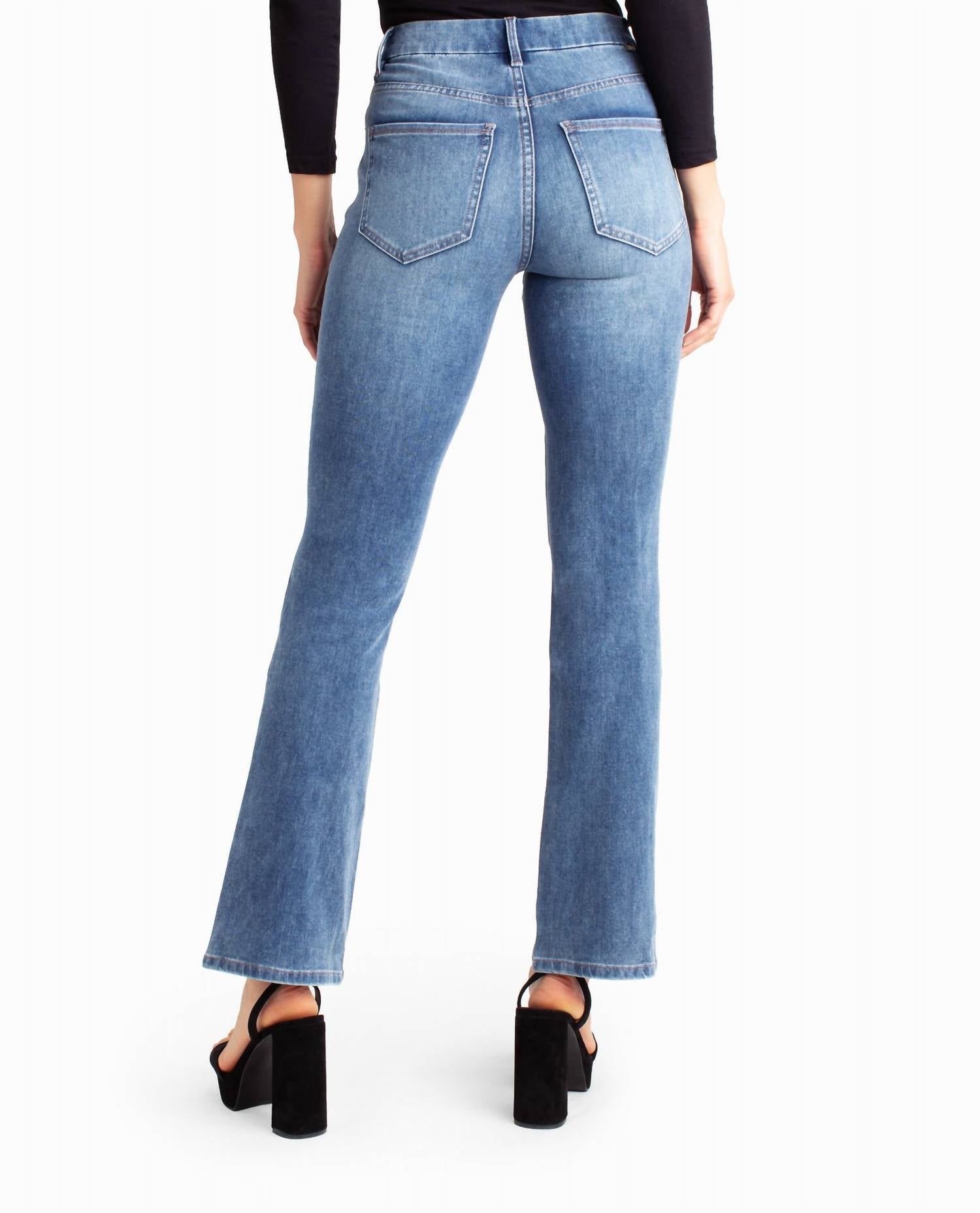 This High Rise Boot Jean is crafted from a 57% Cotton, 39% Rayon, 3% Spandex, 1% Polyester. It features a medium blue hue, high-rise waist, button closure with zip fly, belt loops, and a bootcut leg with a textured pattern.