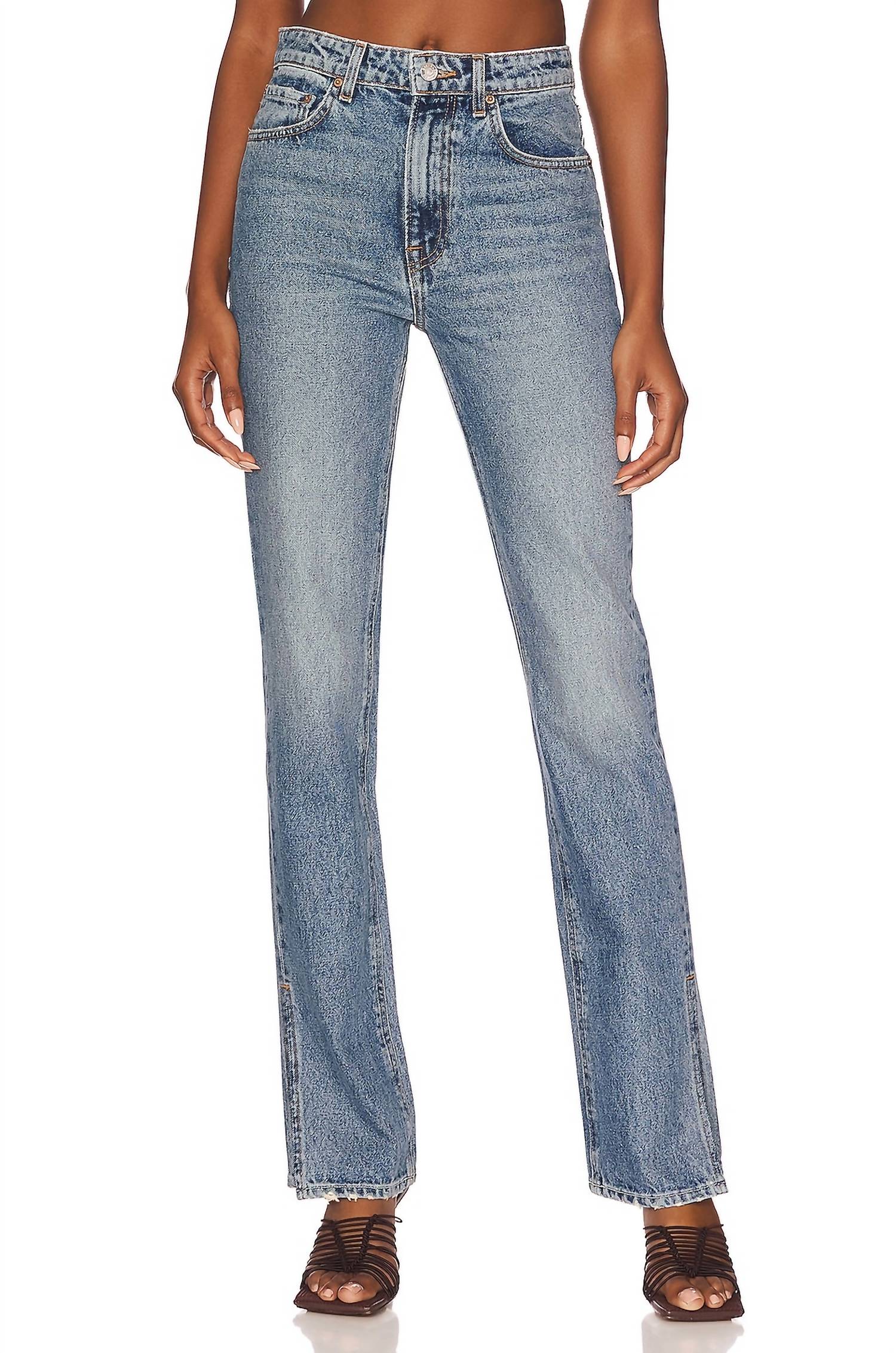 Zip fly with button closure. 5-pocket styling. Light whiskering and fading at front. Split hem. Fabric: 100% Cotton. Machine wash. Made in USA. Model is 5'9" and is wearing a size 24. Measurements - Inseam: 32", Rise: 13", Knee Opening: 14.5", Leg Opening: 14".