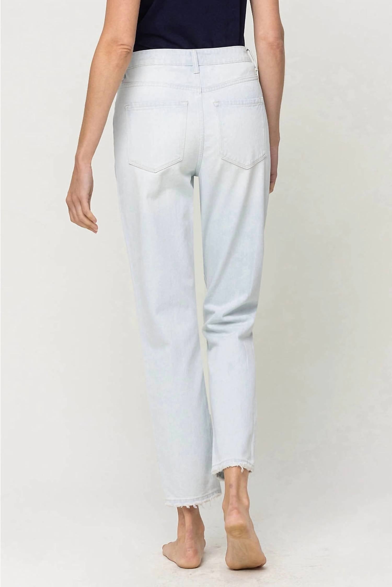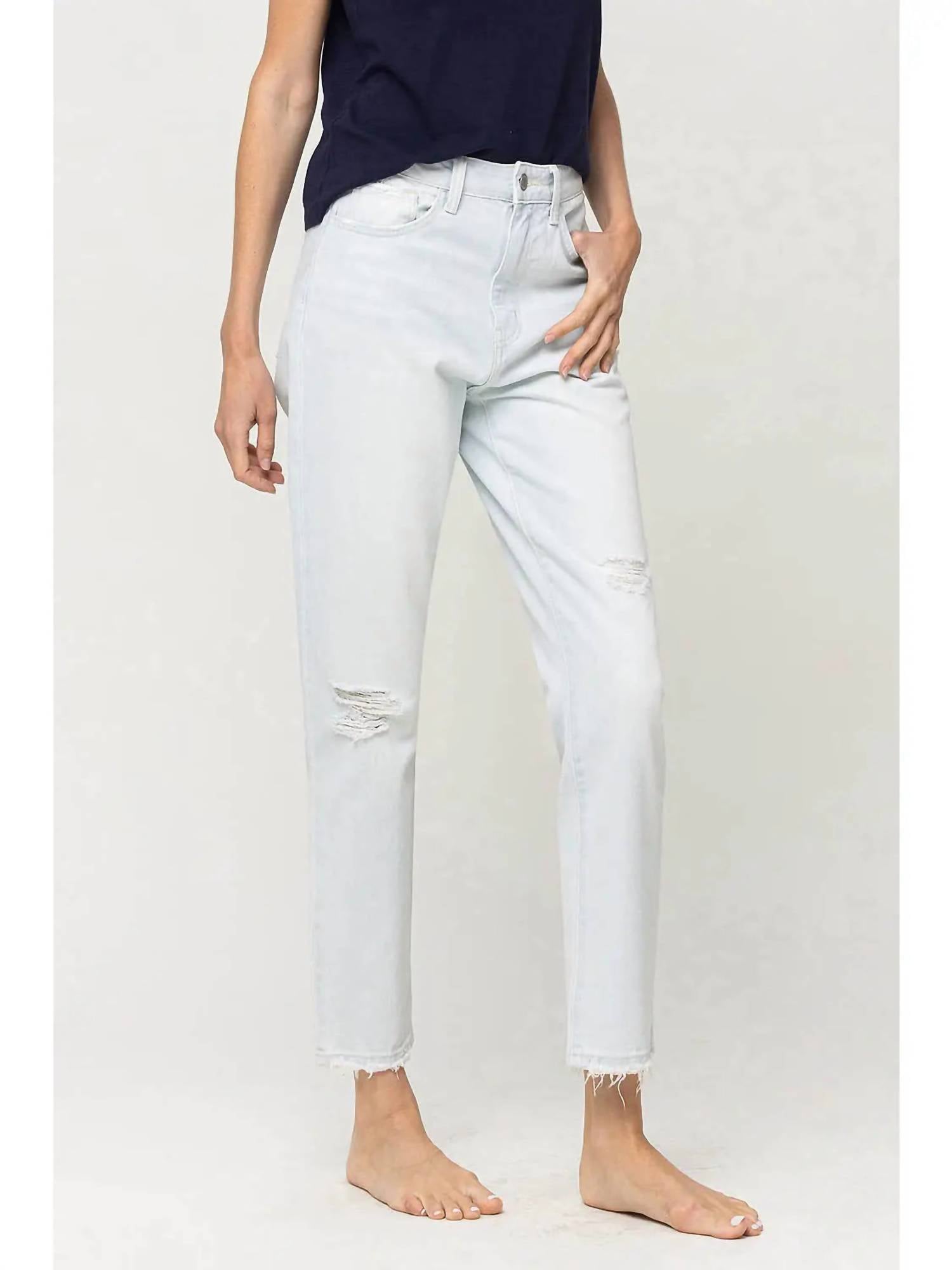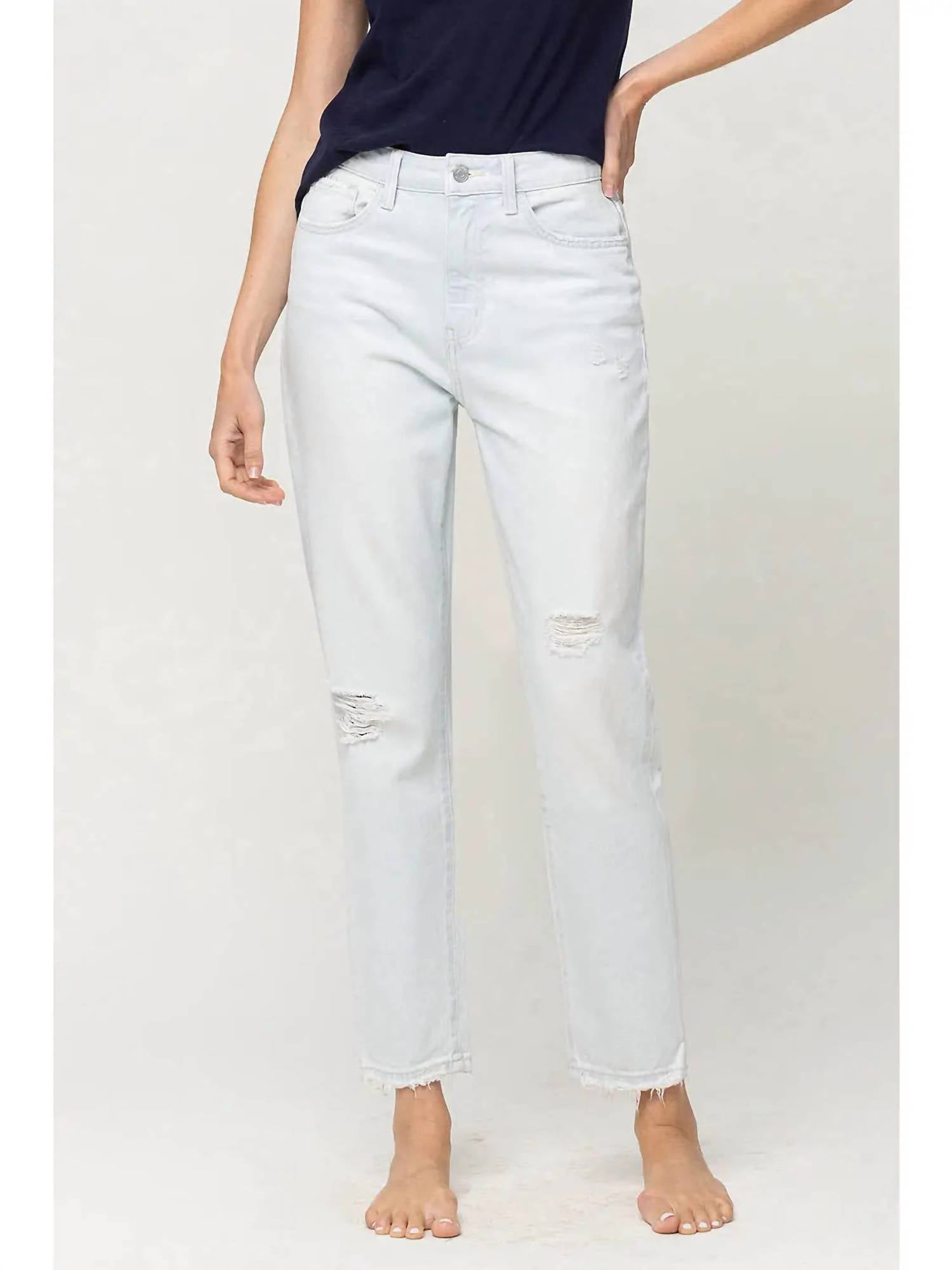 These trendy high-rise jeans feature a solid pattern, crafted from 100% cotton for an effortlessly relaxed fit with tapered legs. With an 11" rise and 27" inseam, these jeans boast a distressed detail and button closure that adds a touch of edge to your look. Care for them easily with a machine wash and tumble dry, ensuring they remain a staple piece in your collection.