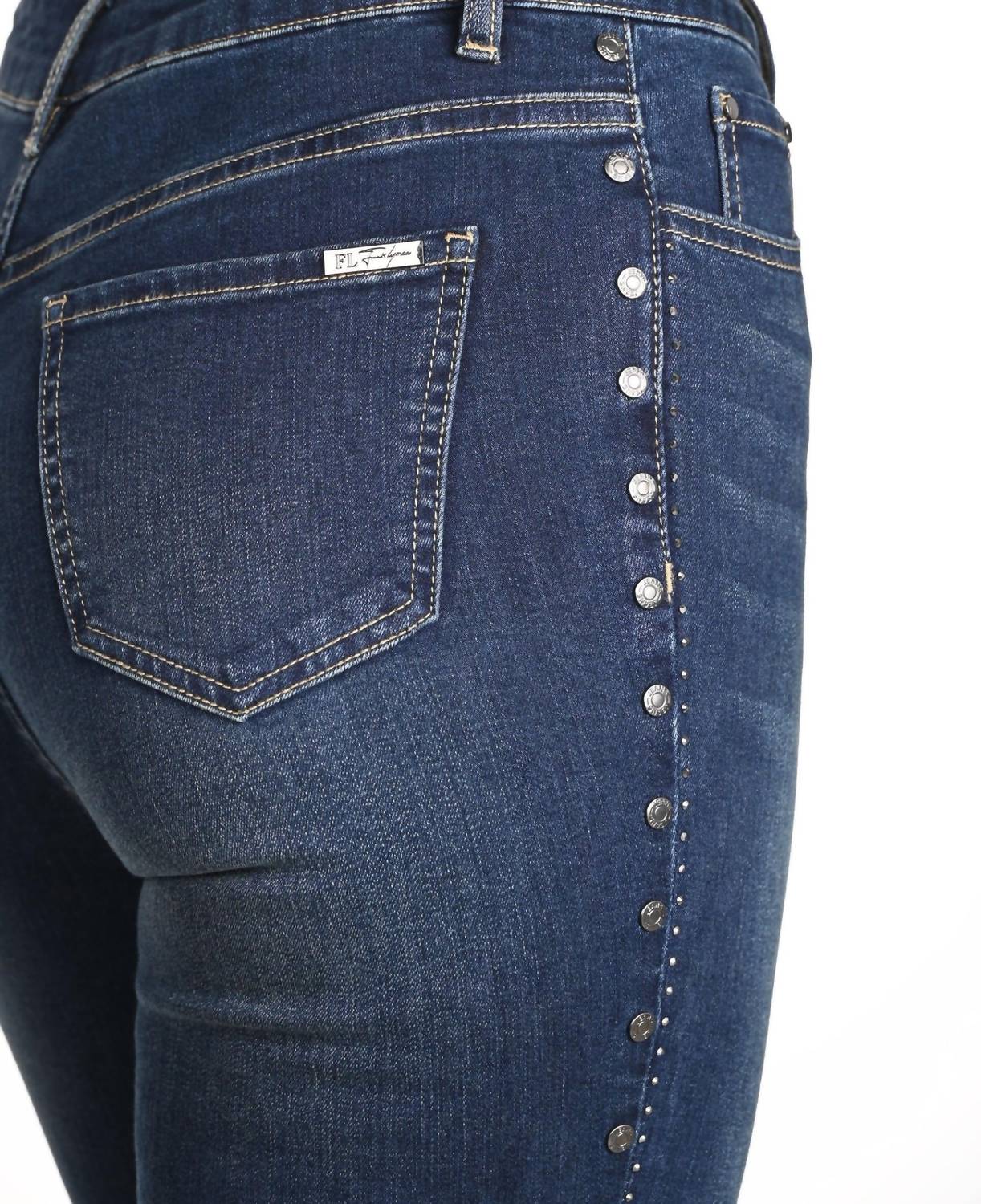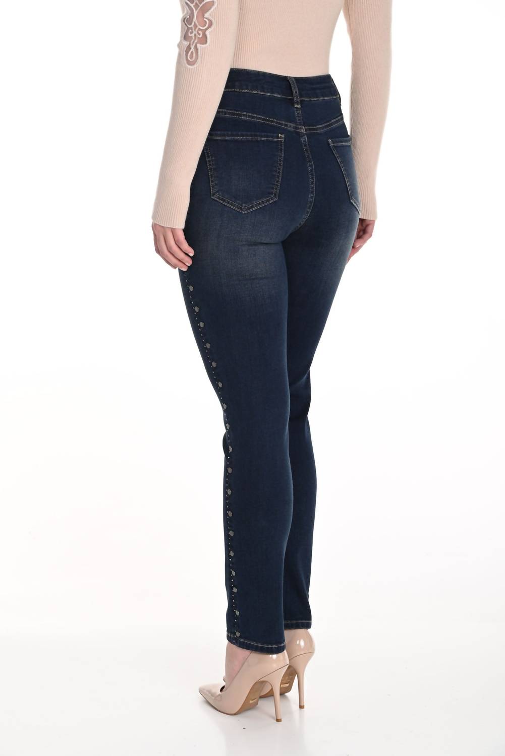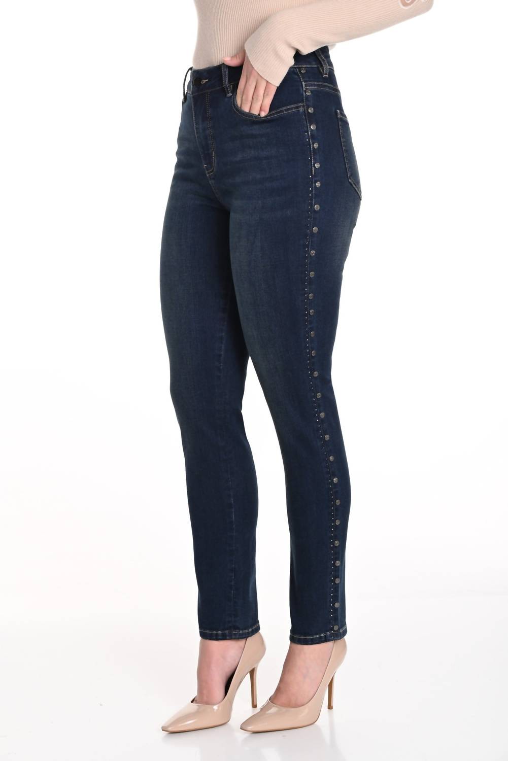 Fit to perfection, we love these high-waist jeans and you will too. These dark denim pants feature rhinestone and button detailing, blending casual comfort with subtle sophistication for versatile everyday wear. The intricate embellishments add a touch of sparkle, elevating the classic jeans silhouette into a chic, modern statement. Made from 73% cotton, 23% polyester, 3% rayon, and 1% spandex.