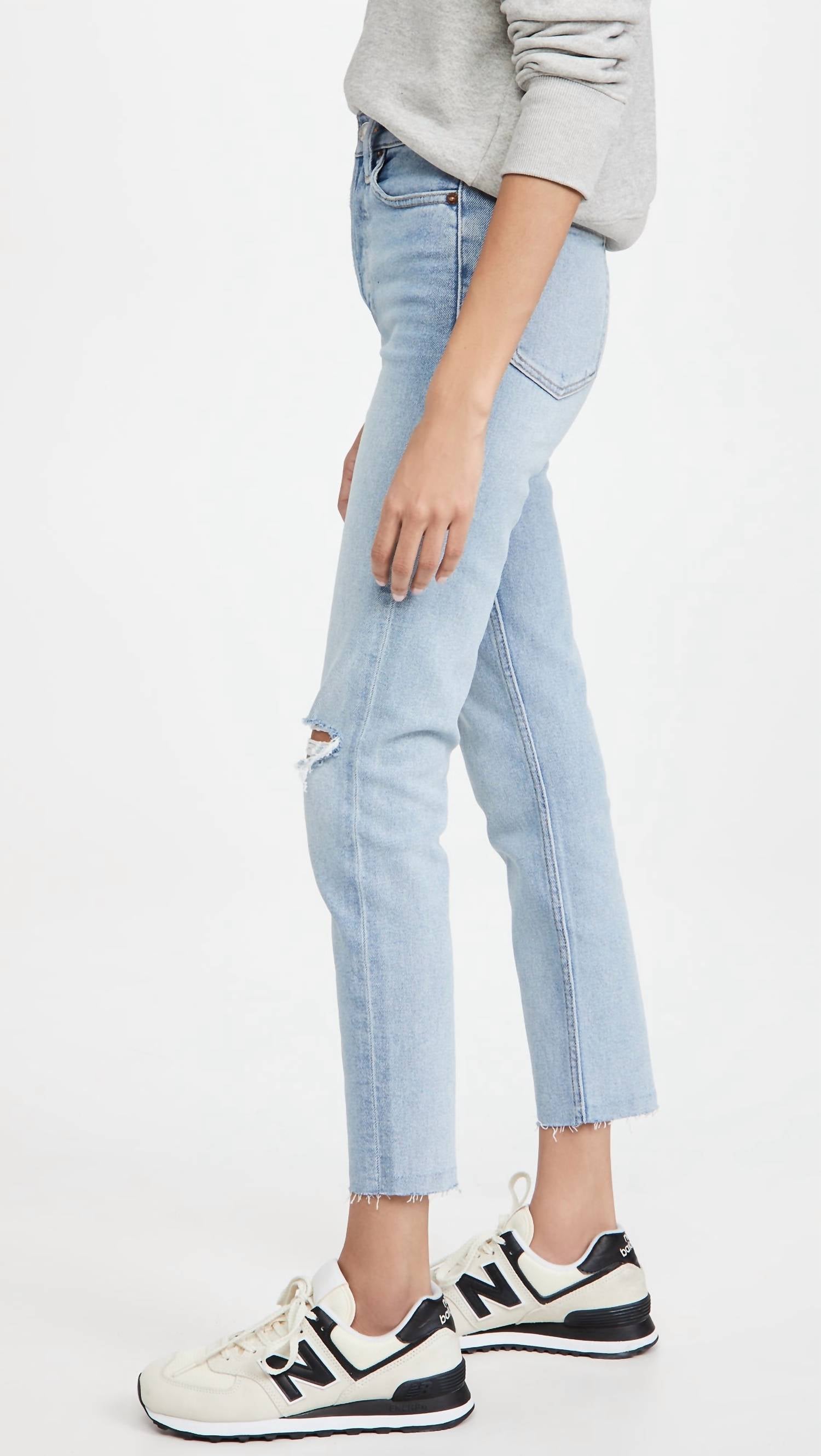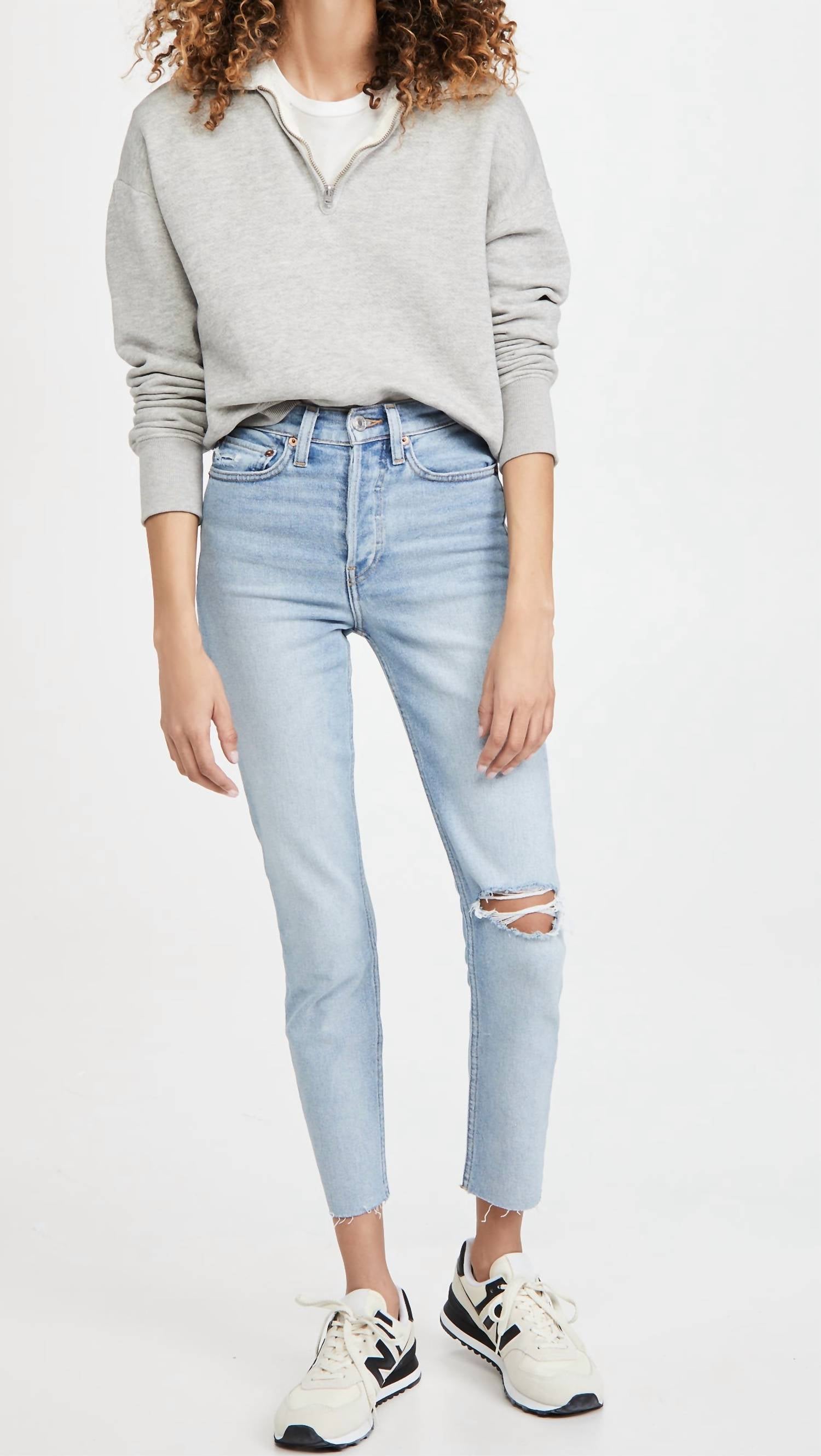 High-waist is here to stay and we especially love this style. Embrace the effortlessly chic aesthetic with the 90s High Rise Ankle Crop Jeans by RE/DONE. These women's jeans feature a trendy high-rise waist and a flattering skinny leg in a timeless light wash. Crafted from a durable cotton blend(77% Cotton, 22% Lyocell, 1% Elastane) with a solid pattern, they ensure a snug fit that breaks in perfectly over time, although you may prefer to size up for instant comfort. Closure is secured with a button, and caring for them is hassle-free with machine wash and tumble dry instructions. Perfect for minimalist trends and summer vacations.