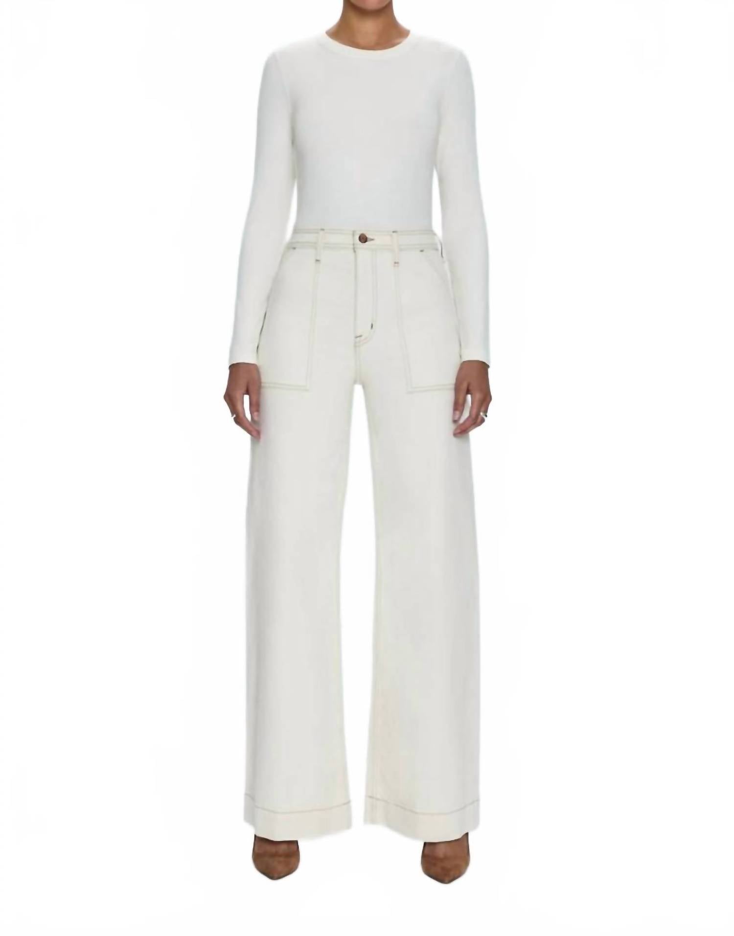 Tuck your favorite tee into these high-waist jeans for a more casual-cool feel. Step out in style with the Penny Utility High Rise Jeans by PISTOLA, featuring a high-rise waist and a comfortable wide-leg silhouette. These ecru pants are crafted from a cotton blend, 99% cotton and 1% elastane, ensuring a gentle stretch for everyday comfort. Designed with front patch pockets, a full-length 32" hemline, and accented with contrasting brown stitching and copper hardware details, these jeans are the perfect minimalist addition to your wardrobe. Closure: Button closure. Care: Machine wash cold, tumble dry low.