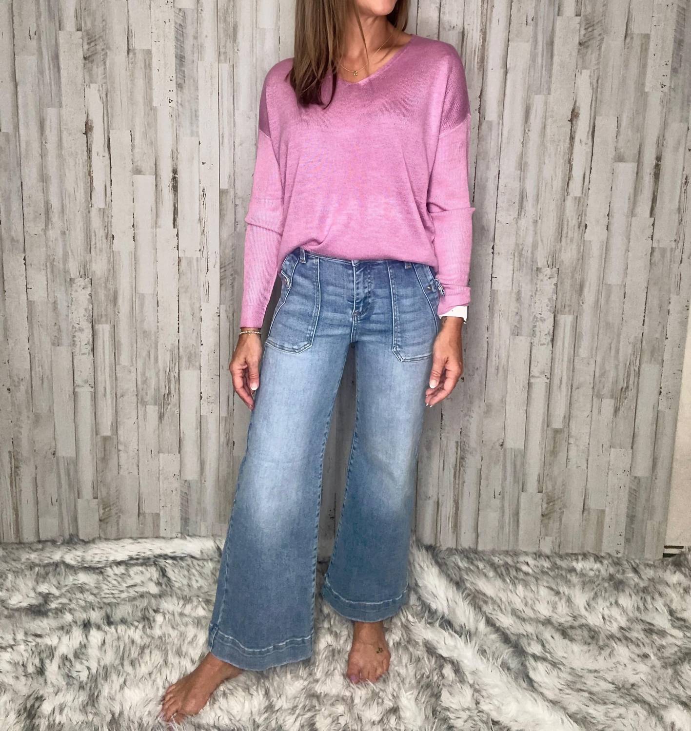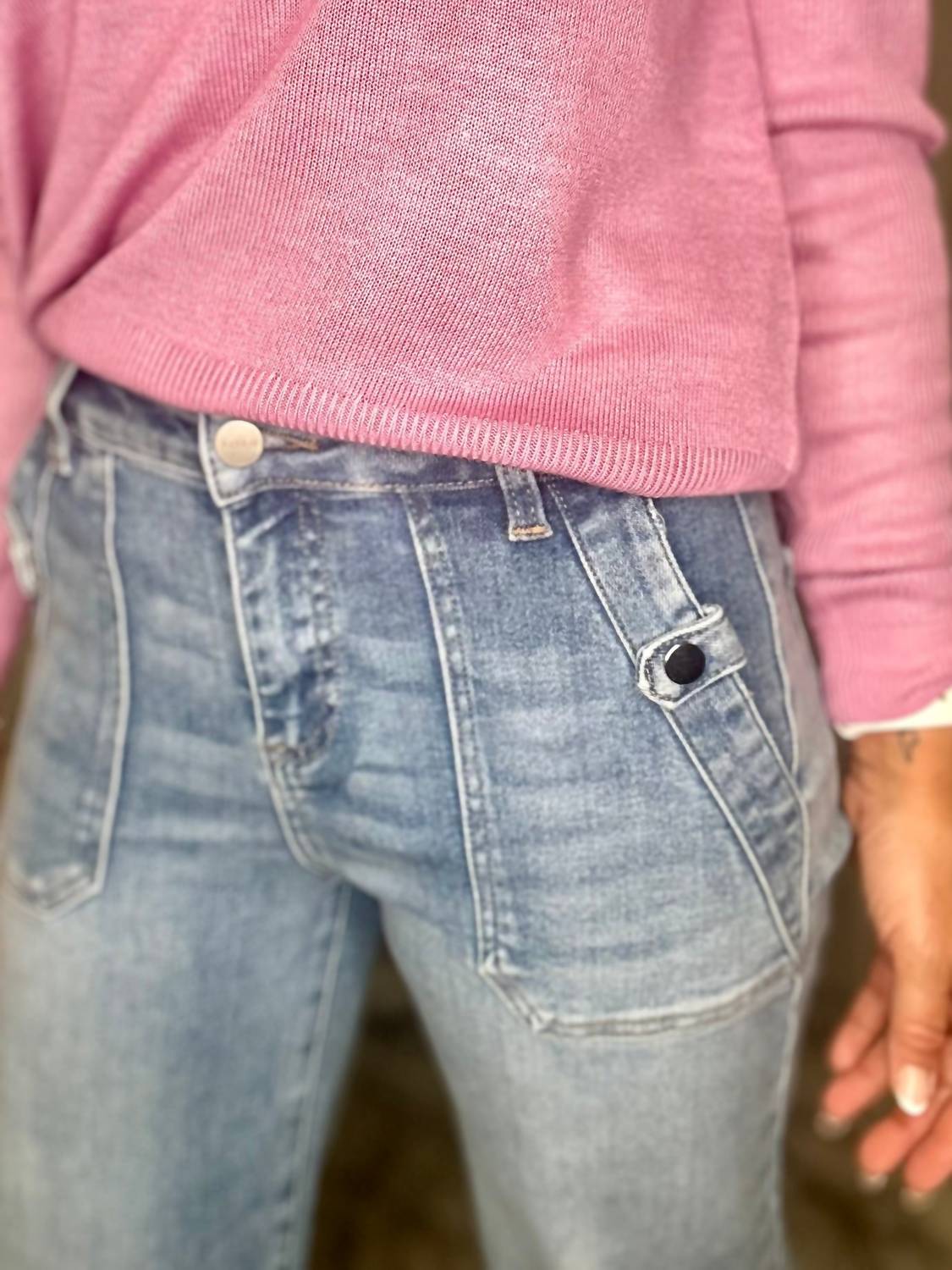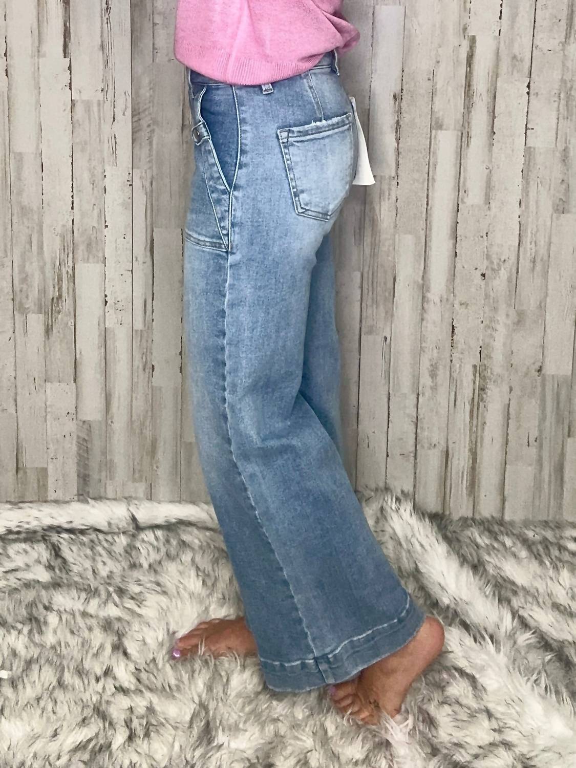High-waist is here to stay and we especially love this style. Introducing the RISEN Sophie High Rise Ankle Wide-Leg Jean in a versatile blue, perfect for streetwear trend enthusiasts. These solid pattern jeans feature a high-rise waist and a relaxed, wide-leg silhouette for effortless style and comfort. With a button closure and convenient pockets, they are ideal for vacation wear. This medium wash denim is machine washable and can be tumble dried for easy care.