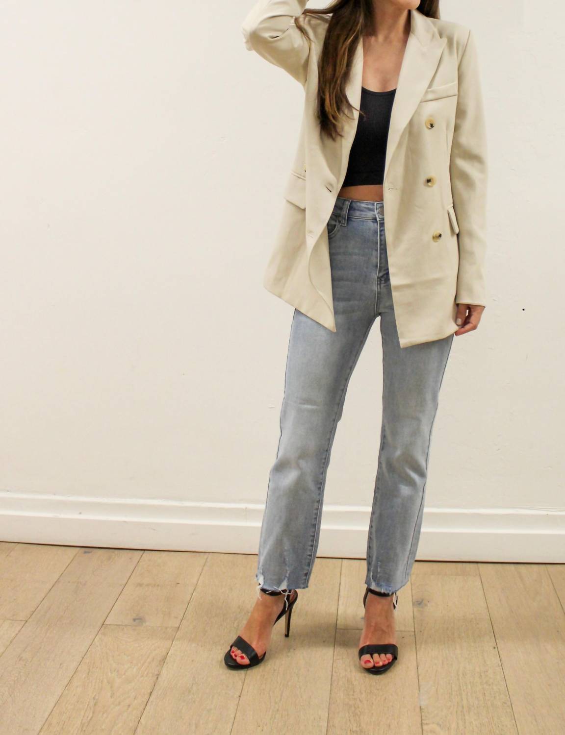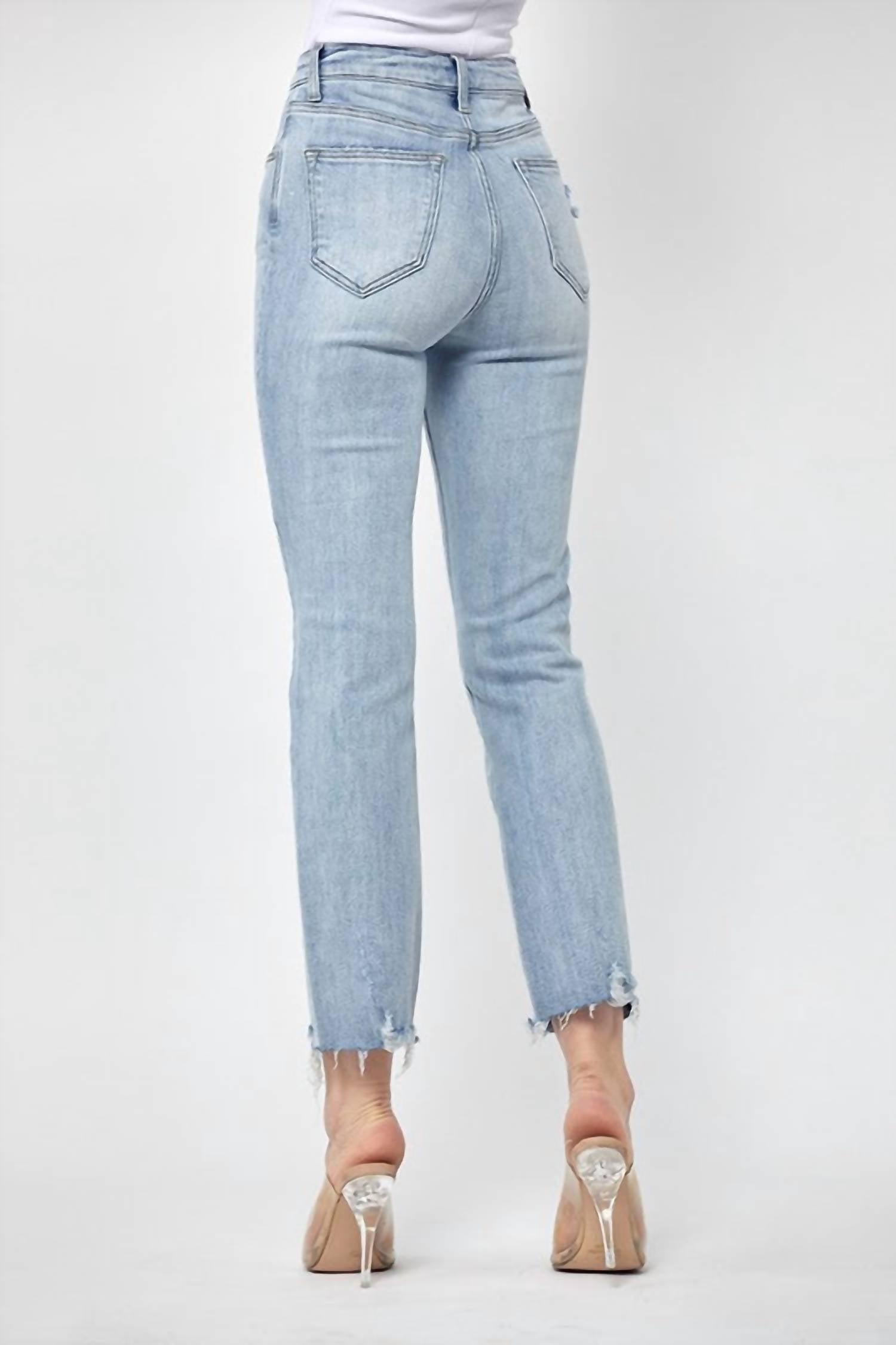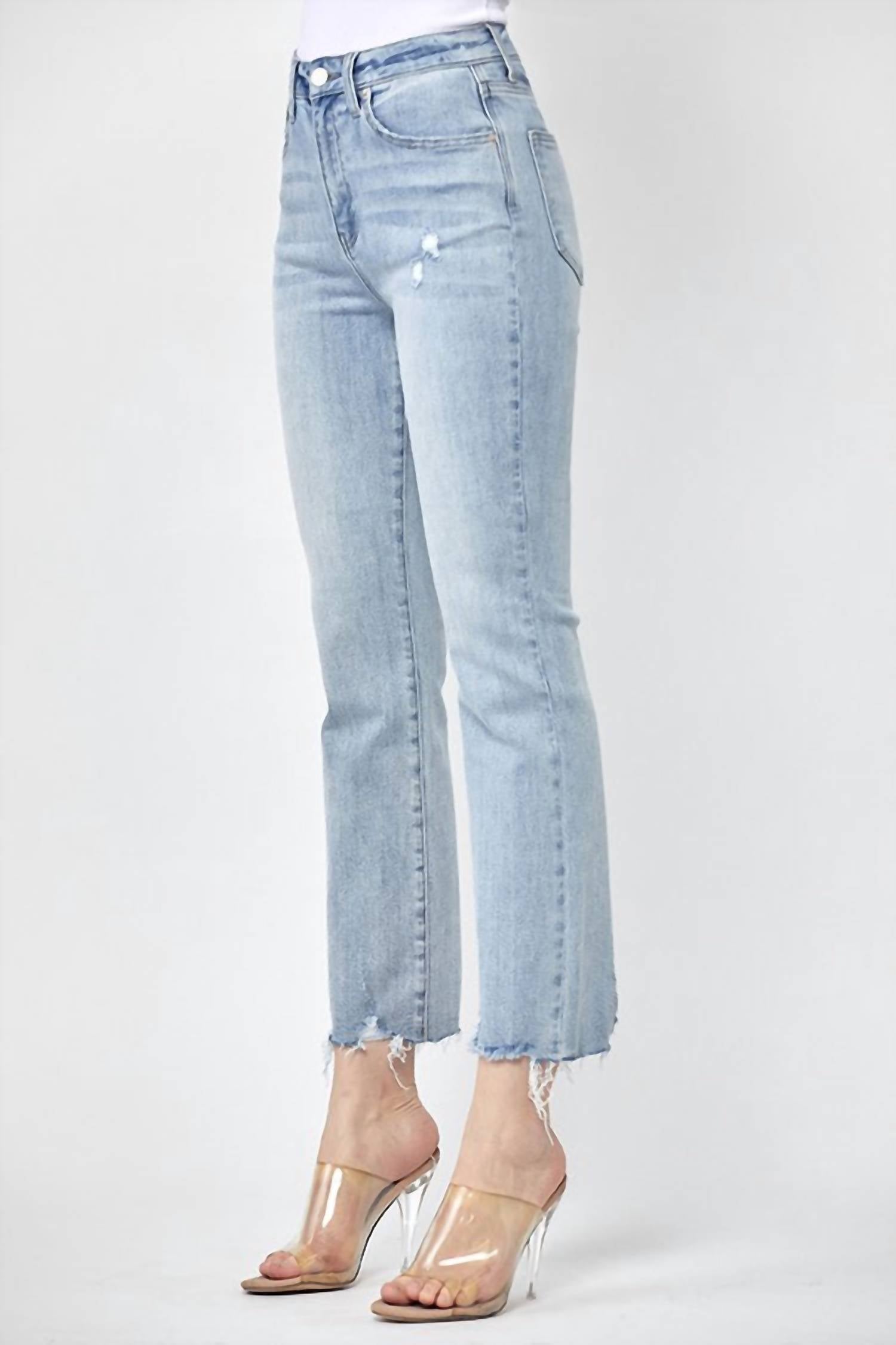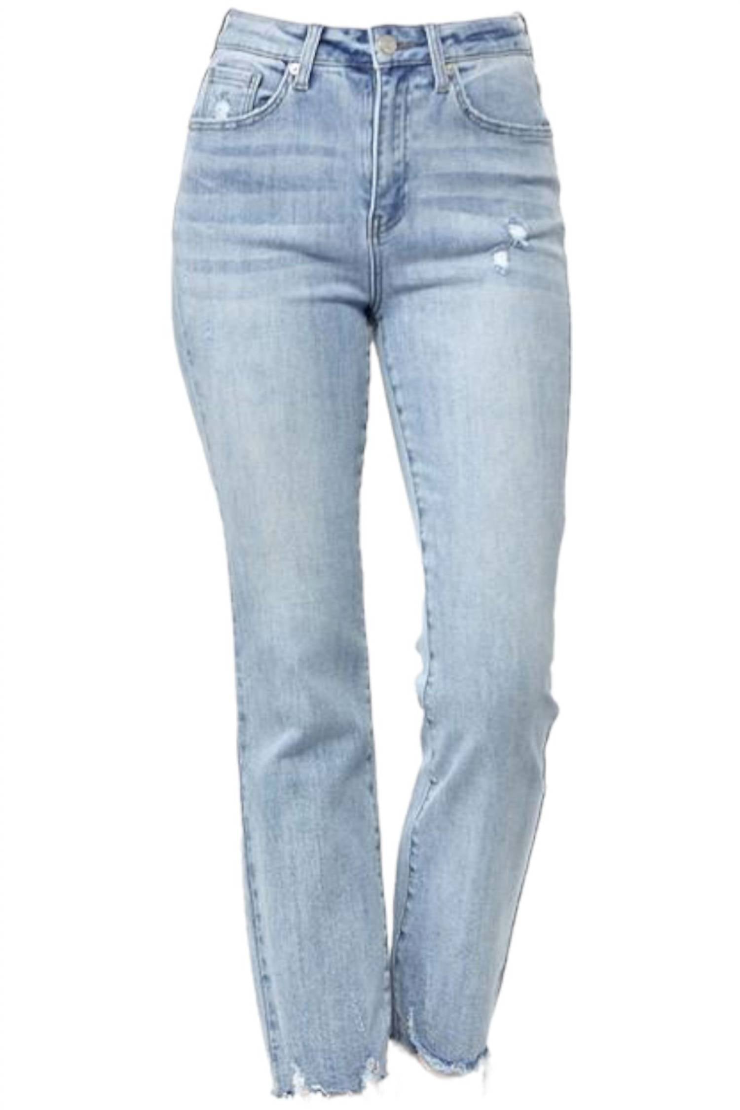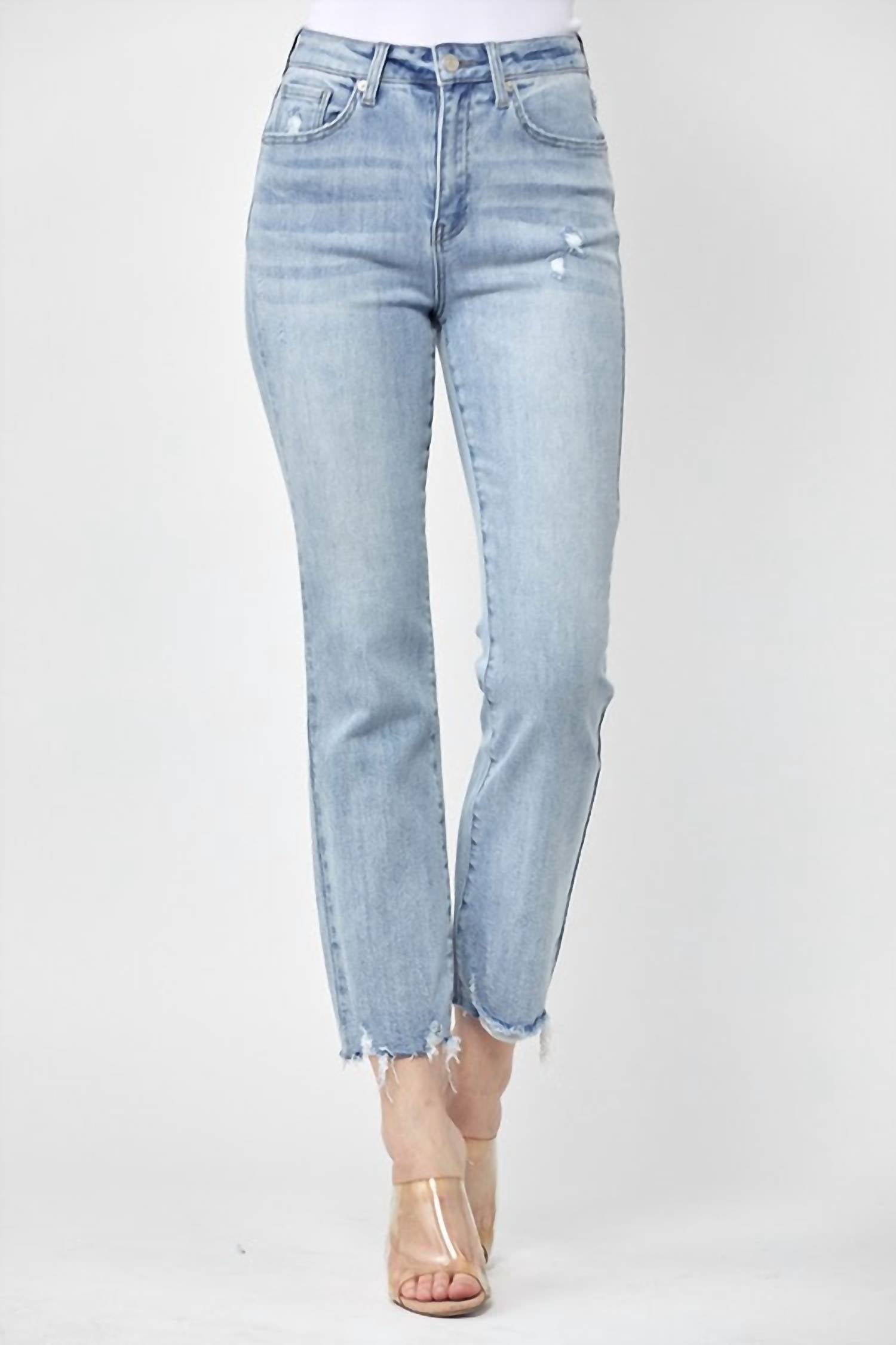 Tuck your favorite tee into these high-waist jeans for a more casual-cool feel. Elevate your denim collection with the Women's High-rise Straight Leg Jeans by RISEN in a trendy light wash, perfect for streetwear. These jeans feature a high-rise waist with a slim fit and offer comfort and style with their straight leg, raw hem, and just enough stretch. Constructed from 95% Cotton, 3.5% Rayon, and 1.5% Spandex, they ensure easy movement and comfort. Closure: Zip closure. Care: Machine wash and tumble dry for effortless maintenance. With dimensions of a 10.75" rise and a 27" inseam, these jeans are ideal for music festivals and casual summer outings. Model is 5'7" with a 24" waist and 35" hips.