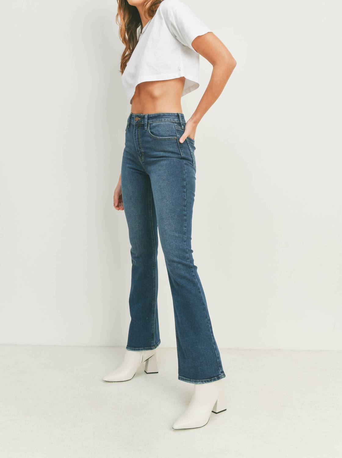 High-waist is here to stay and we especially love this style. Elevate your streetwear wardrobe with the JBD. High-rise 90's Slim Fit Flare Jeans in Dark Denim. Featuring a high-rise waist with an 11" rise and a sleek slim fit, these jeans boast a subtle ankle flare and an ultra-long 32" inseam for a runway-worthy look. Crafted from a comfortable cotton blend of 95% Cotton, 4% Elasterell-P, and 1% Spandex, they offer both style and stretch. Highlighted by a solid dark wash, these jeans include functional pockets and a secure button closure. Care: Machine wash and tumble dry for easy maintenance.