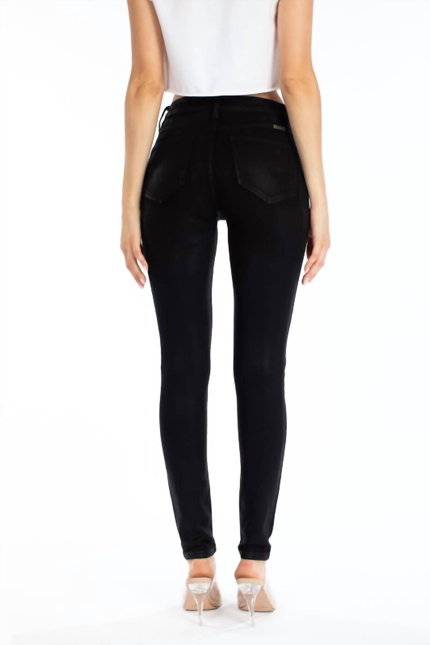 High-waist is here to stay and we especially love this style. Introducing the High Rise Faux Leather Button Jean by KanCan, an embodiment of contemporary edge and classic fit. This skinny leg jean comes in a sleek black color, meticulously designed with a solid pattern. With a garment length of 38.5" and an inseam of 28.5", it promises a flattering fit. The high rise and 10" rise enhance its modern silhouette, while the button closure adds a functional detail.