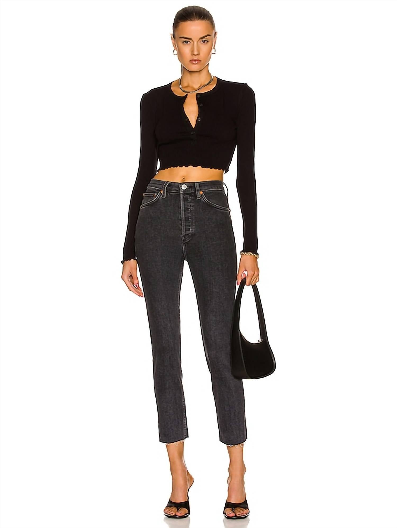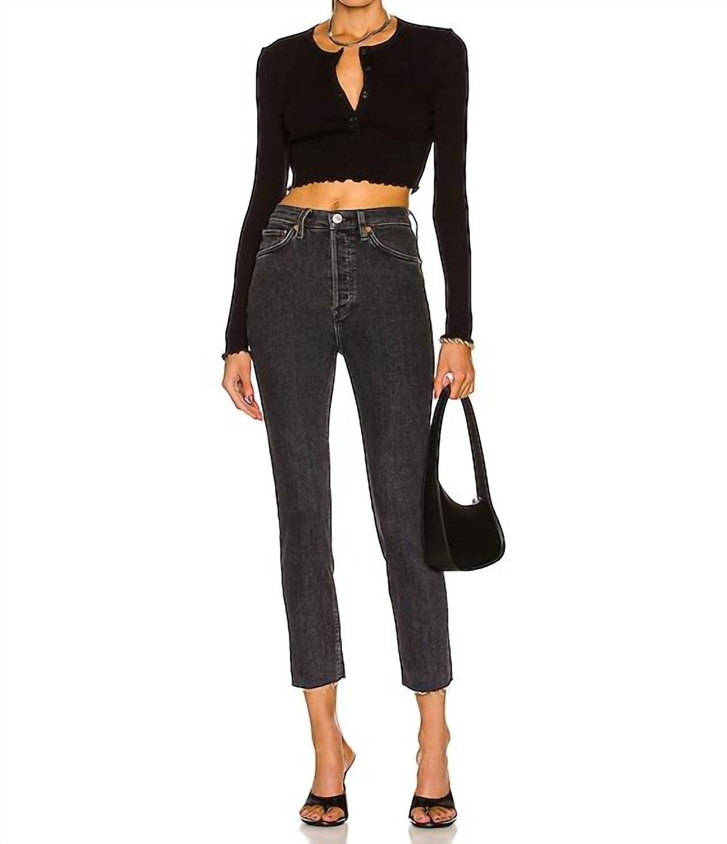 Tuck your favorite tee into these high-waist jeans for a more casual-cool feel. Introducing the Women's High Rise Ankle Crop Jeans by RE/DONE, your ultimate streetwear staple for vacation vibes. Crafted from durable denim in a textured Stoned Noir, these jeans feature a slim fit with a skinny leg silhouette. Designed with a high rise and dark wash, they're equipped with pockets and a convenient zip closure for style and practicality. Perfect for spring, these jeans blend seamlessly into your wardrobe, offering both comfort and fashion-forward appeal.