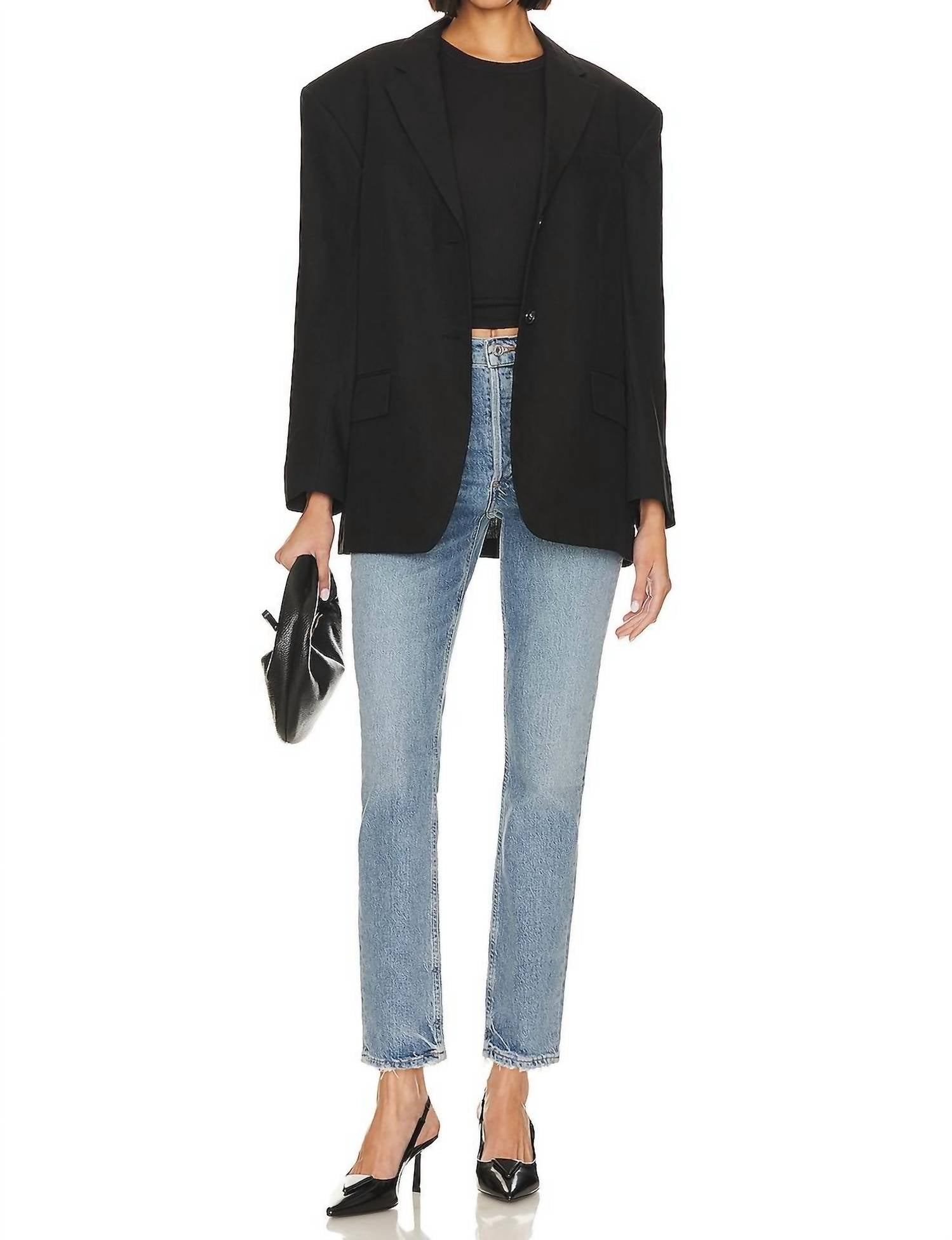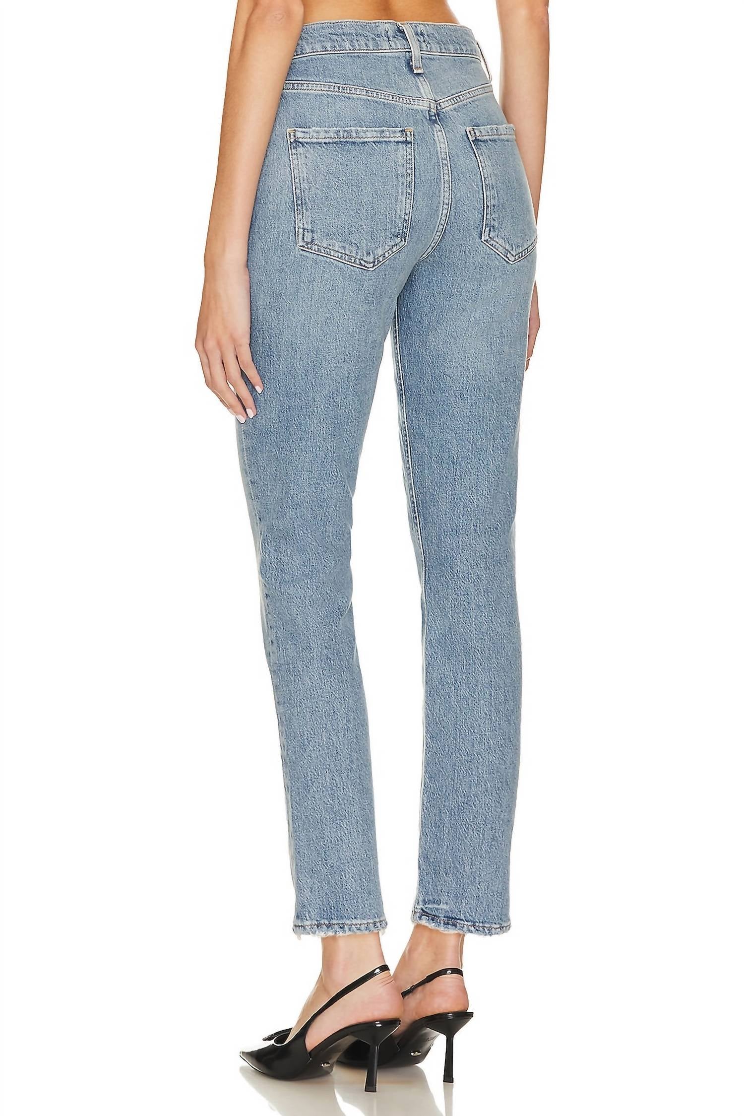 High-waist is here to stay and we especially love this style. Discover AGOLDE's Riley Long High Rise Straight Jeans in the captivating Quiver shade, ideal for fall evening events. These women’s denim jeans offer a medium wash and feature a high-rise, slim fit with a timeless straight leg, complete with a 27.0" inseam and a 10.0" rise. Crafted from a sustainable blend of 88% cotton, 11% post-consumer recycled cotton, and 1% elastane, these jeans are made in Turkey and designed with a button fly and 5-pocket style. Enjoy the vintage look of intentionally distressed trim, and keep them looking fresh with machine wash and tumble dry care instructions.