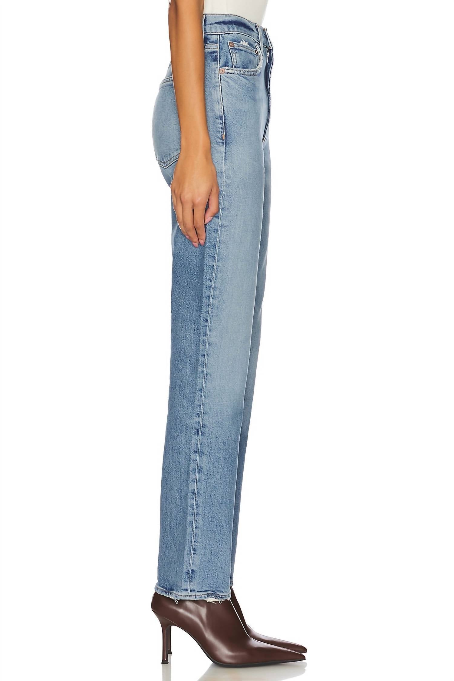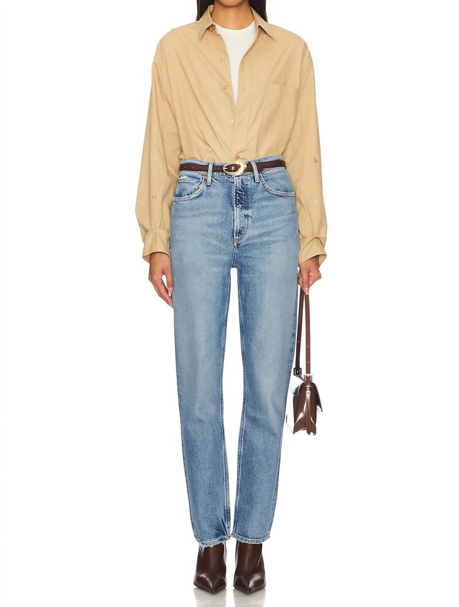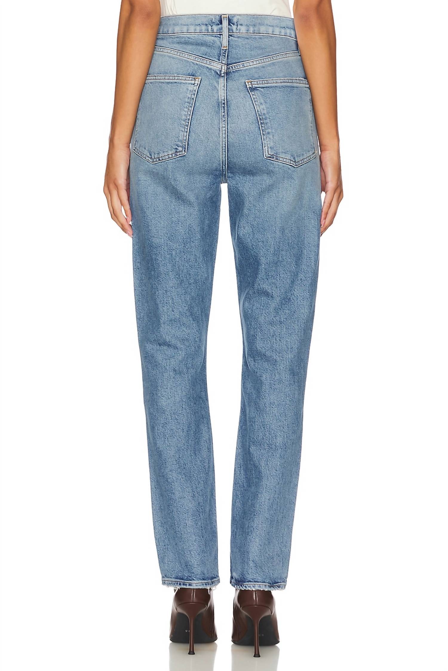 High-waist is here to stay and we especially love this style. Experience the chic appeal of the AGOLDE High Rise Stovepipe Straight Cotton Jean in the melody color, an ideal choice for your evening events with a vintage trend flair. These jeans feature a 59% organic cotton, 40% viscose, and 1% elastane blend, designed for comfort and style with its high-waisted, relaxed fit. Made in Türkiye, this solid pattern denim offers a medium wash with a distinctive straight leg style. Closure: Zip and button. Care: Machine wash and tumble dry. Dimensions: 30" inner seam, 12" rise, 14" knee circumference, and 14" leg opening.
