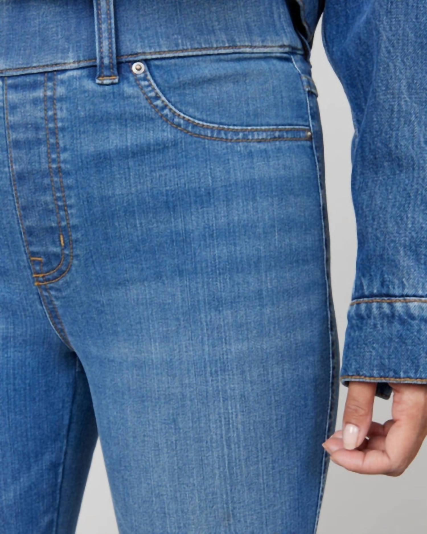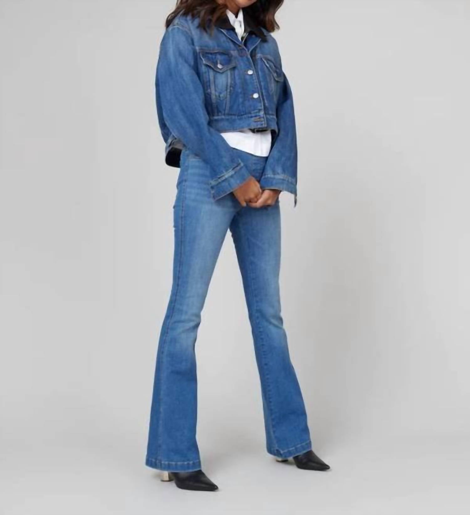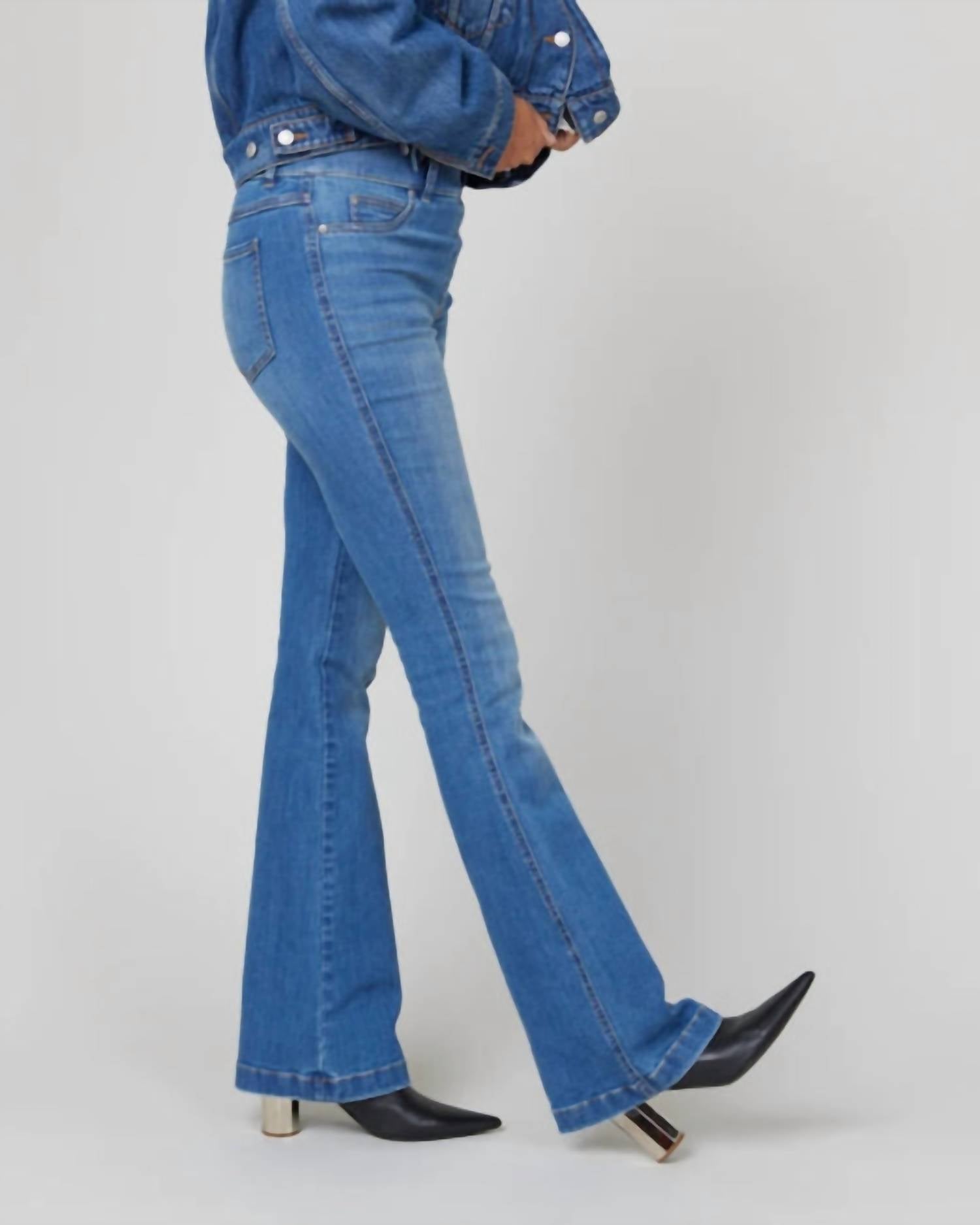 Tuck your favorite tee into these high-waist jeans for a more casual-cool feel. Introducing the Spanx High Rise Flare Jeans, a perfect blend of style and comfort for any wardrobe. Made from solid vintage indigo denim, these jeans boast a relaxed fit with a high-rise waist and a classic medium wash. With a flattering flared leg design, these jeans are a nod to 90s fashion and ideal for spring outings. Featuring a convenient pull-on closure, they include pockets for added functionality, and are suitable for machine washing and tumble drying. Rise of 10" and inseam of 33" cater to plus sizes, making them perfect for festive occasions like Thanksgiving or vacations.