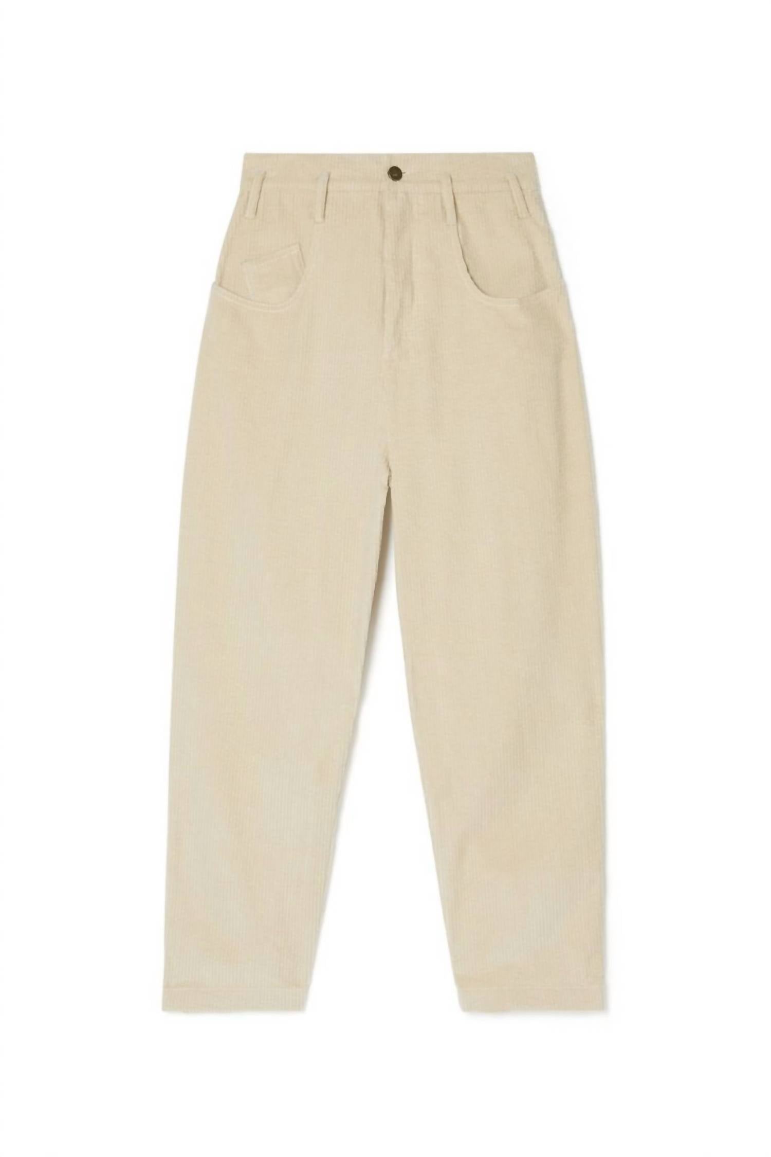 Corduroy. Vintage inspired high waist jeans. High waist cut and roll-up ankles. Zipped opening at the front and metal aged button. Dropped loops for a nice pleated effect with a belt. Two front pockets and a small ticket pocket. Two patch pockets at the back. Small tone-on-tone Louise Misha embroidery at the back. Slim fit. Composition: 100% cotton. Machine wash at 30°. Do not tumble dry, natural flat dry.