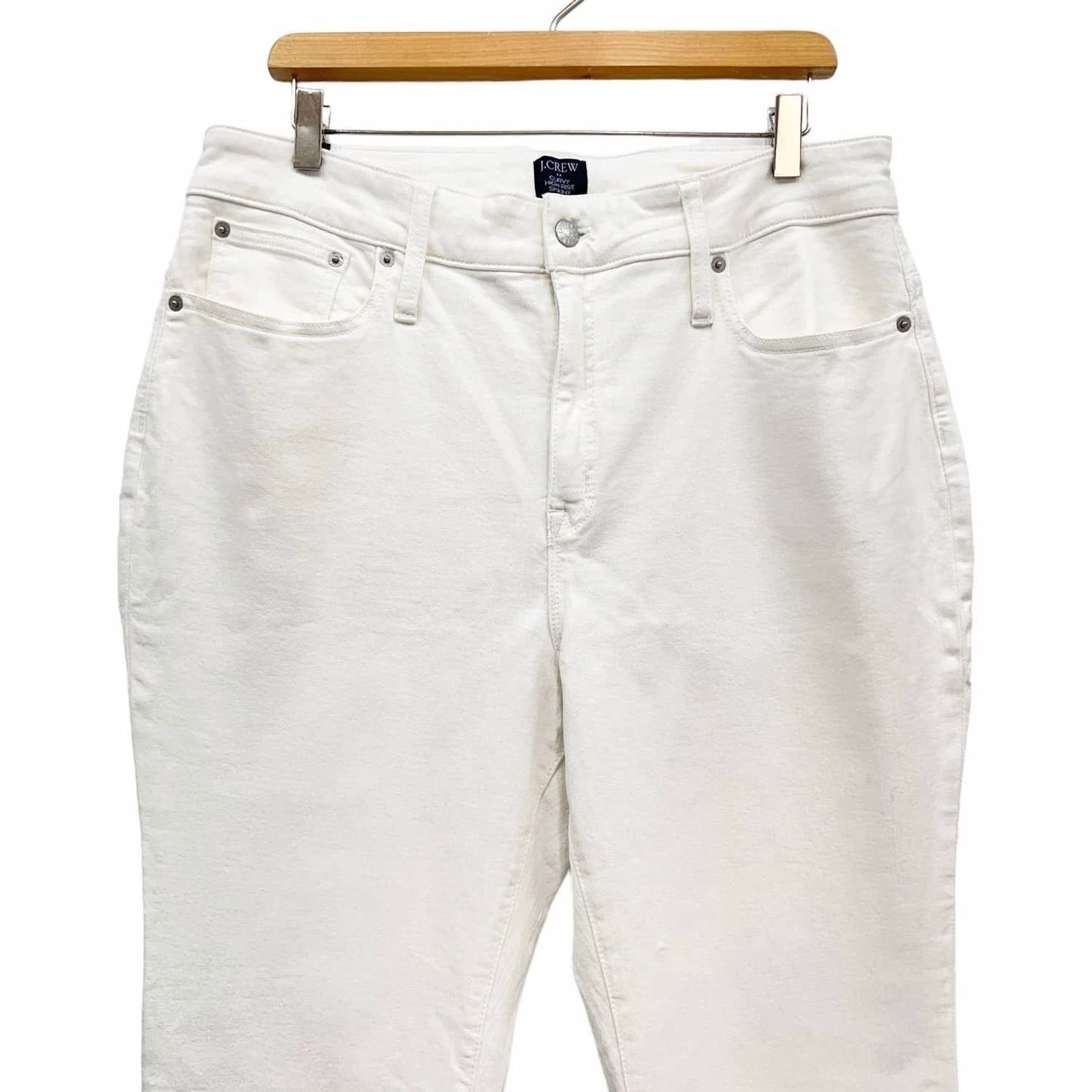 Fit to perfection, we love these high-waist jeans and you will too. Introducing the Curvy High Rise Skinny Jean by J.Crew, a sleek addition in crisp white, ideal for a stylish silhouette. This denim piece is crafted from 90% cotton, 8% recycled polyester, and 2% elastane, offering a fitted design through the hip and thigh with a superskinny, straight leg. The high-rise style sits comfortably at the waist and features a traditional 5-pocket styling with a zip closure. Care for these jeans is simple with machine wash and tumble dry instructions. Dimensions: Waist 17”, Rise 12”, Inseam 27”.