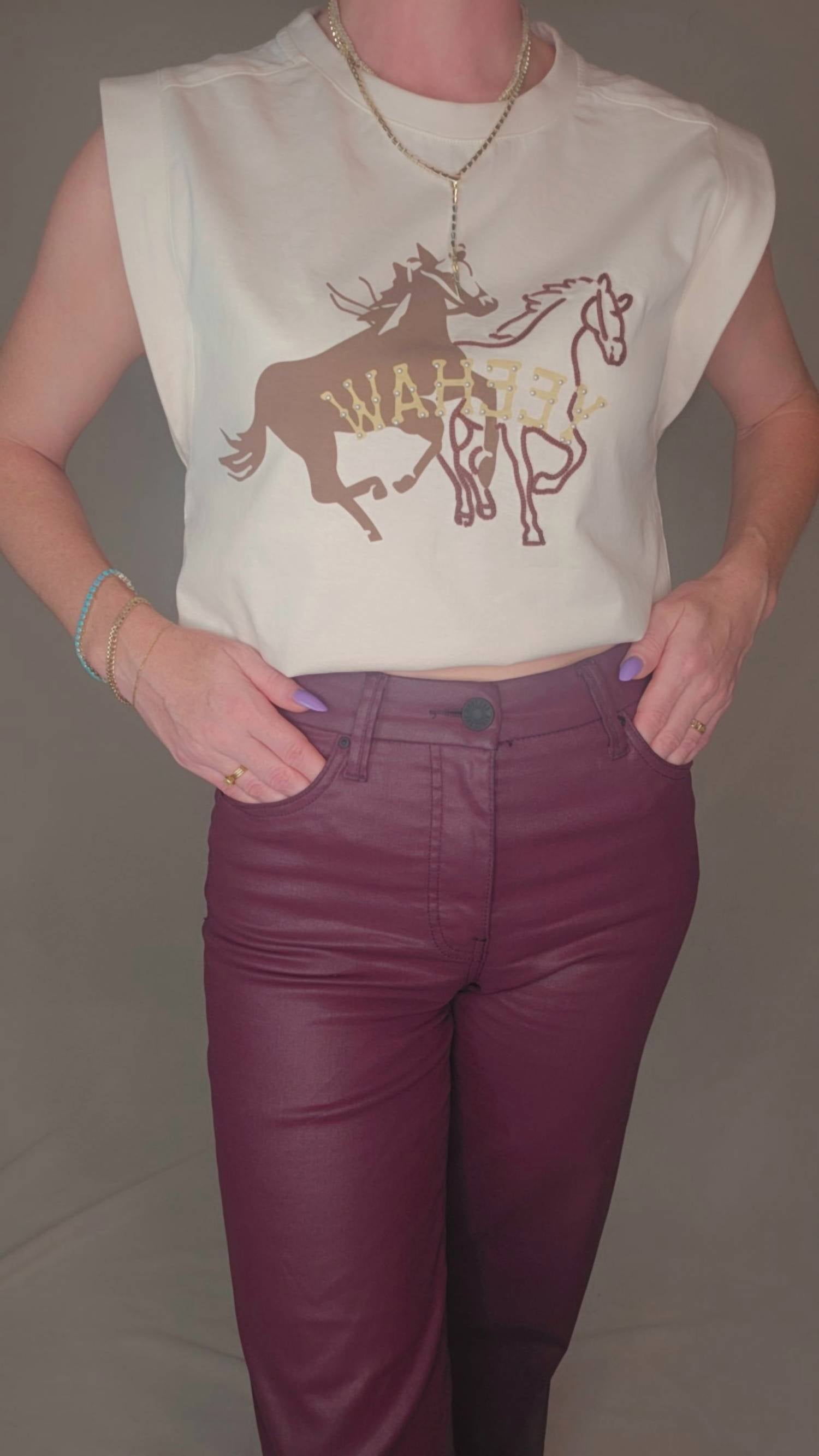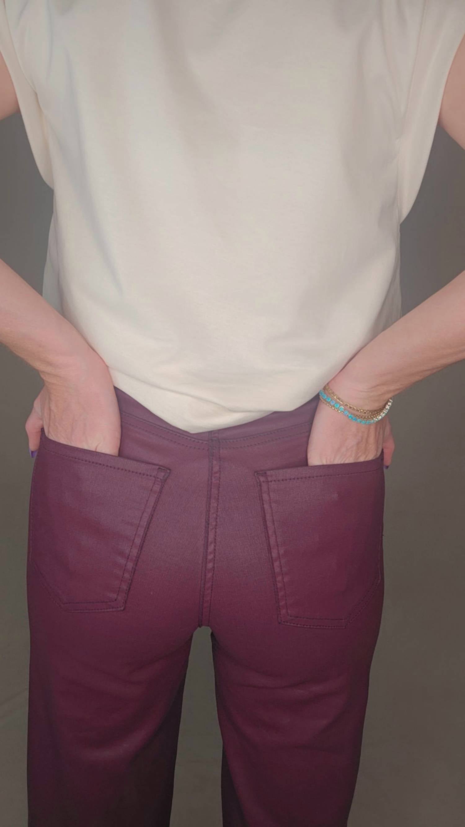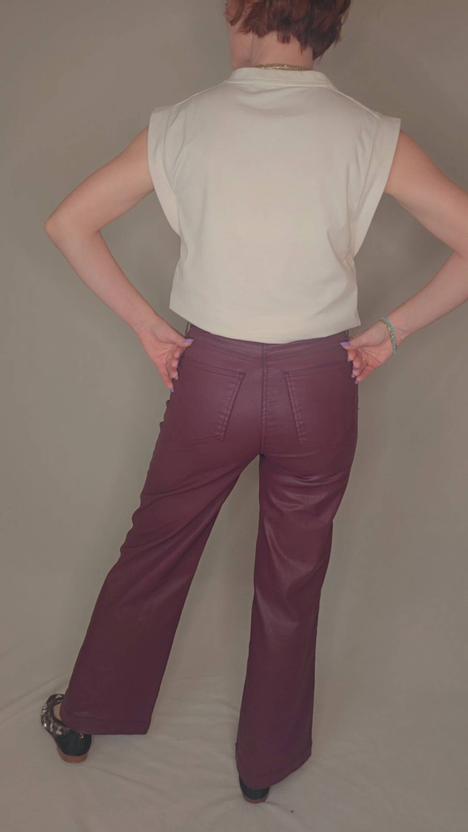 Fit to perfection, we love these high-waist jeans and you will too. Elevate your style with the Meg Coated High Waist Wide Leg Jeans by KUT FROM THE KLOTH in a striking blackberry hue. Crafted from luxe waxed leather, these jeans feature a classic high-rise design with a modern straight leg cut that's both flattering and versatile. Composition: Modal. Closure: Button closure. Care: Hand wash and line dry. Perfect for transitioning from work to weekend or for those special holiday gatherings.