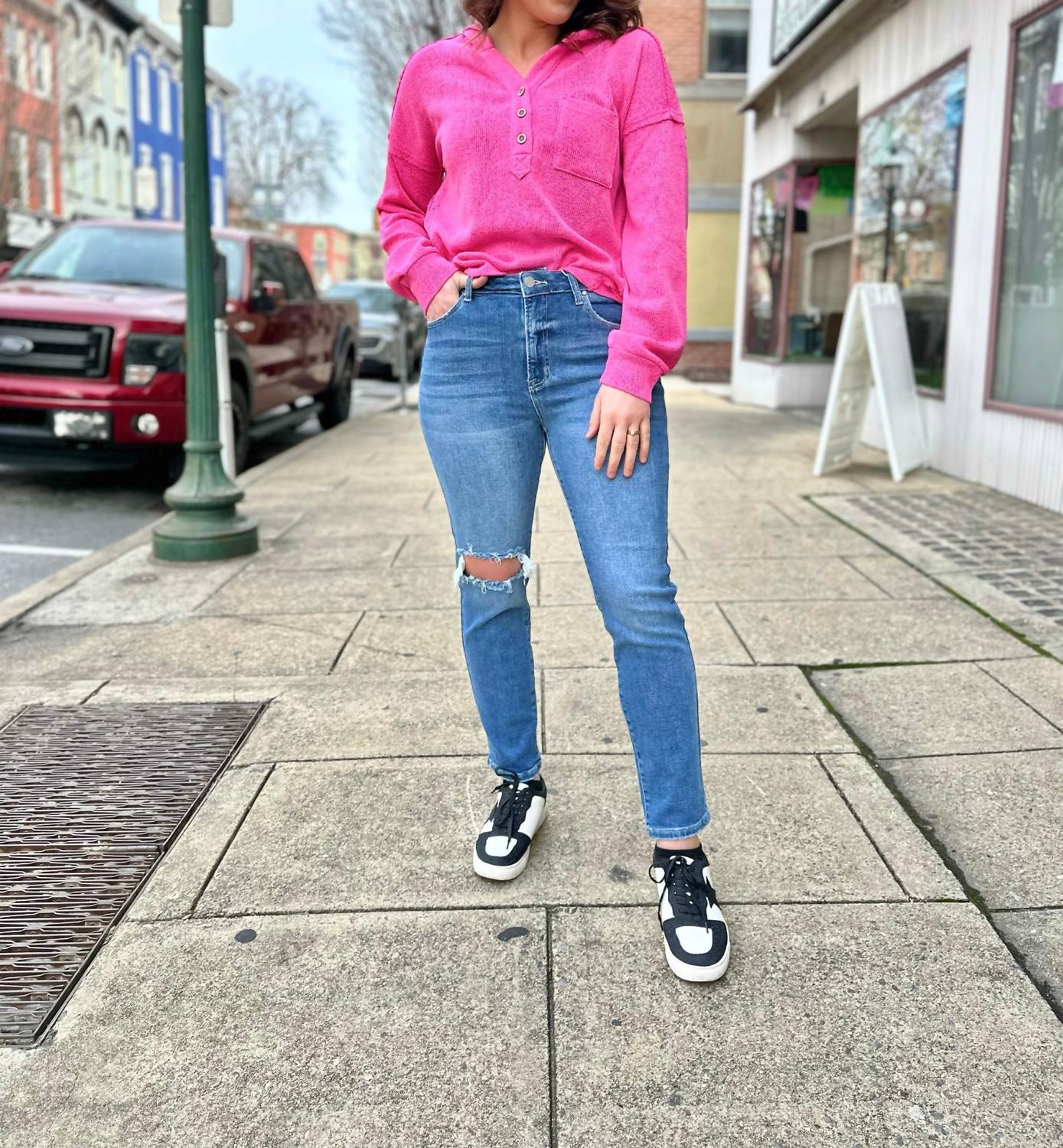 Tuck your favorite tee into these high-waist jeans for a more casual-cool feel. Introducing the Paisley High Rise Distressed Slim Skinny Jeans by Risen, designed for a flattering fit and a grunge-inspired edge. These jeans feature a high waist rise and a trendy skinny leg style, complete with a convenient button closure. They are crafted from a material blend of 91% Cotton, 6% Polyester, and 3% Spandex, ensuring comfort and flexibility. Perfect for spring vacations, the light wash and distressed details enhance their casual-chic appeal. Inseam measures 28.5" with a rise of 10.5", catering to the curated size guide of 1X to 3X for a range of curvy fits.