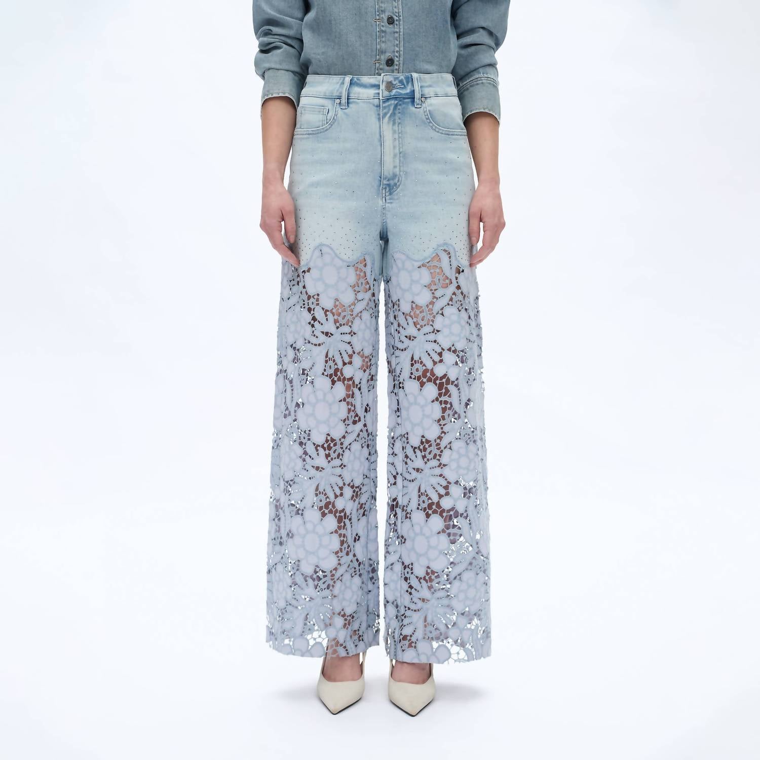 High-waist is here to stay and we especially love this style. Introducing the Rhinestone Patchwork Wide Leg Jeans by Bayeas, expertly crafted for style and comfort. These light blue jeans feature a high rise with a front rise of 11.75 inches and an inseam of 31 inches. Made from a cotton blend, they are detailed with a five-pocket design, a button closure, floral style cutout embroidery, and rhinestones for added flair. Care instructions recommend using a washing bag and machine washing at 30 degrees for an eco-friendly approach. Perfect for holiday parties or casual wear, these wide-leg jeans add a boho chic touch to your wardrobe.