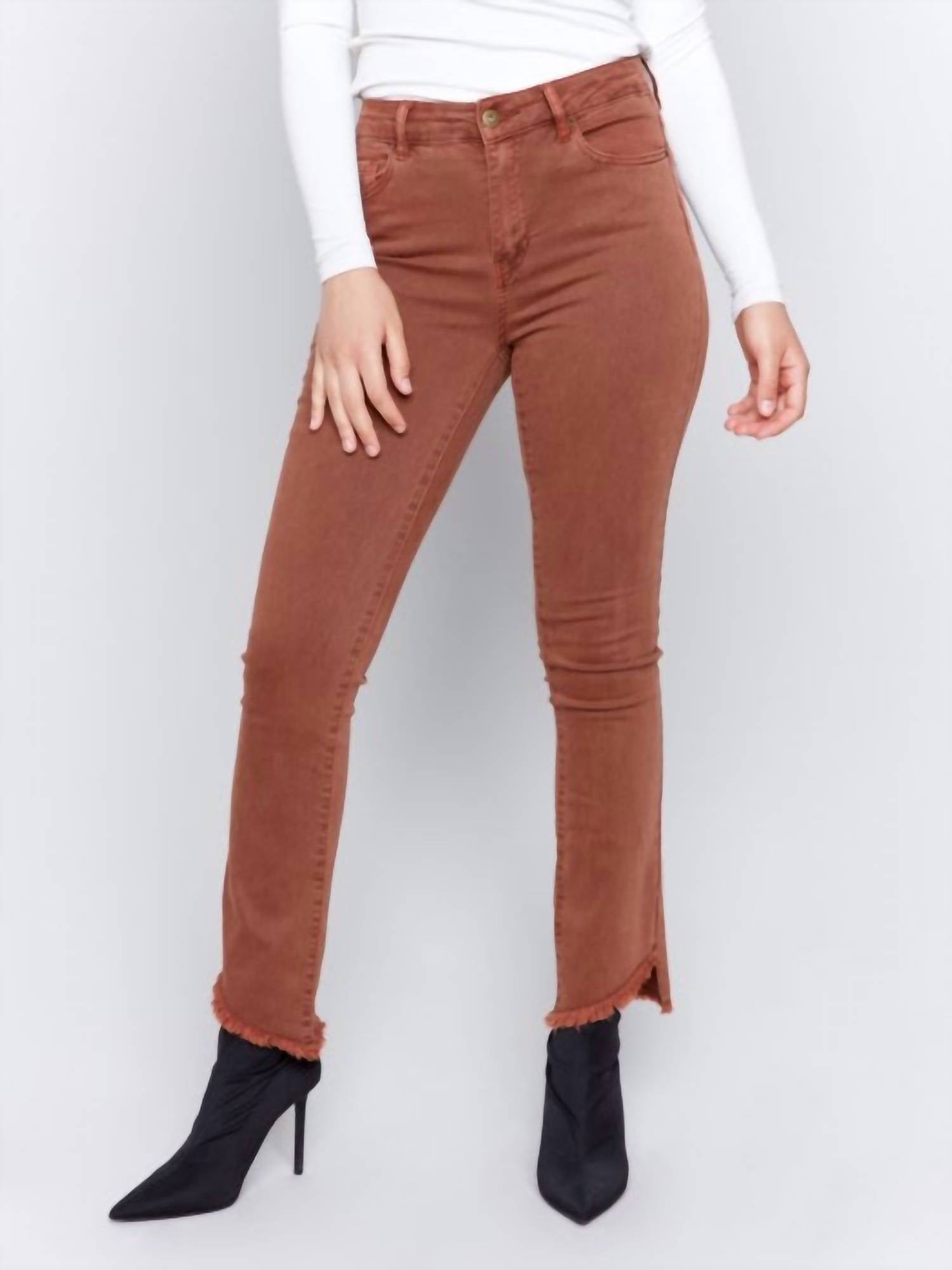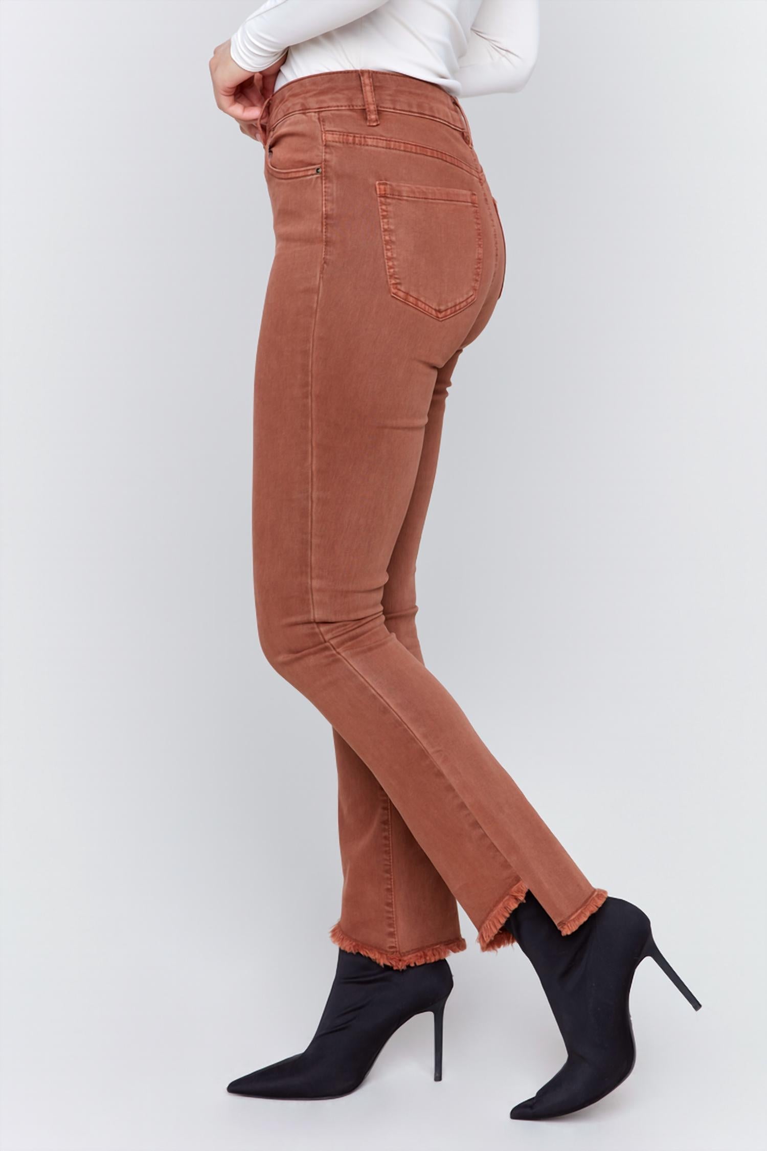 Tuck your favorite tee into these high-waist jeans for a more casual-cool feel. Introducing the Sugar Hill Twill Pant by CHARLIE B, perfect for making a statement with its bold terracotta hue. These women’s high-rise pants feature a flattering boot cut with an asymmetrical fringe hem, crafted from a comfortable cotton blend of 98% cotton and 2% spandex. Closure is secure with a button, and the garment includes convenient pockets. For care, machine wash in cold water, do not bleach, hang to dry, and iron at a low setting; dry cleaning is optional.