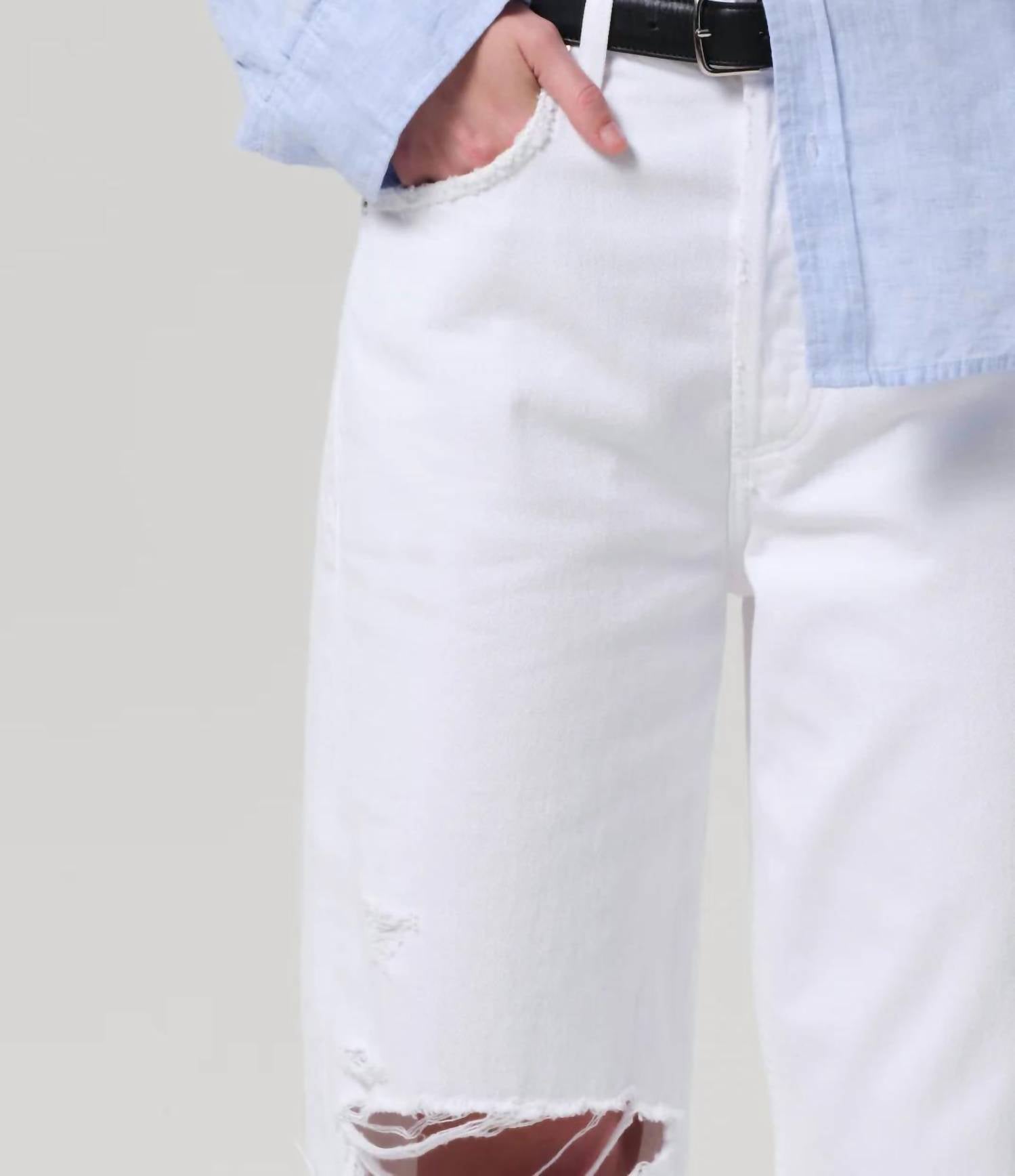 Fit to perfection, we love these high-waist jeans and you will too. Introducing the Ayla Baggy Jean by Citizens of Humanity, crafted for chic, casual style. These women's high-rise jeans feature a relaxed and oversized silhouette with wide legs, highlighted by their stark clean white denim in 'Zinc' with knee destruction. Made from comfortable 100% Cotton, they boast a button closure and offer an authentic, non-stretch feel. With a 12.75" rise and 32" inseam, these jeans are perfect for a minimalist look and are conveniently machine washable.