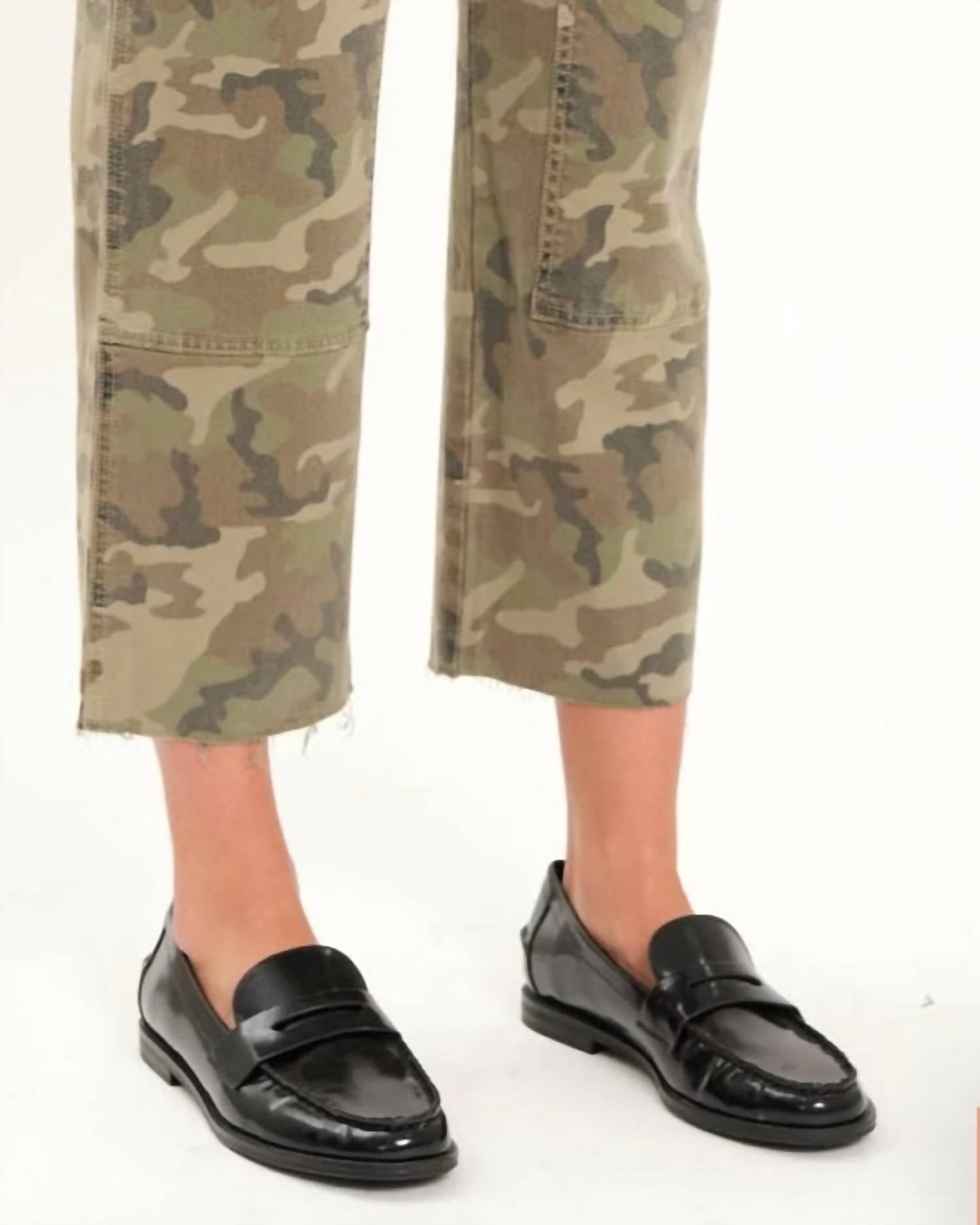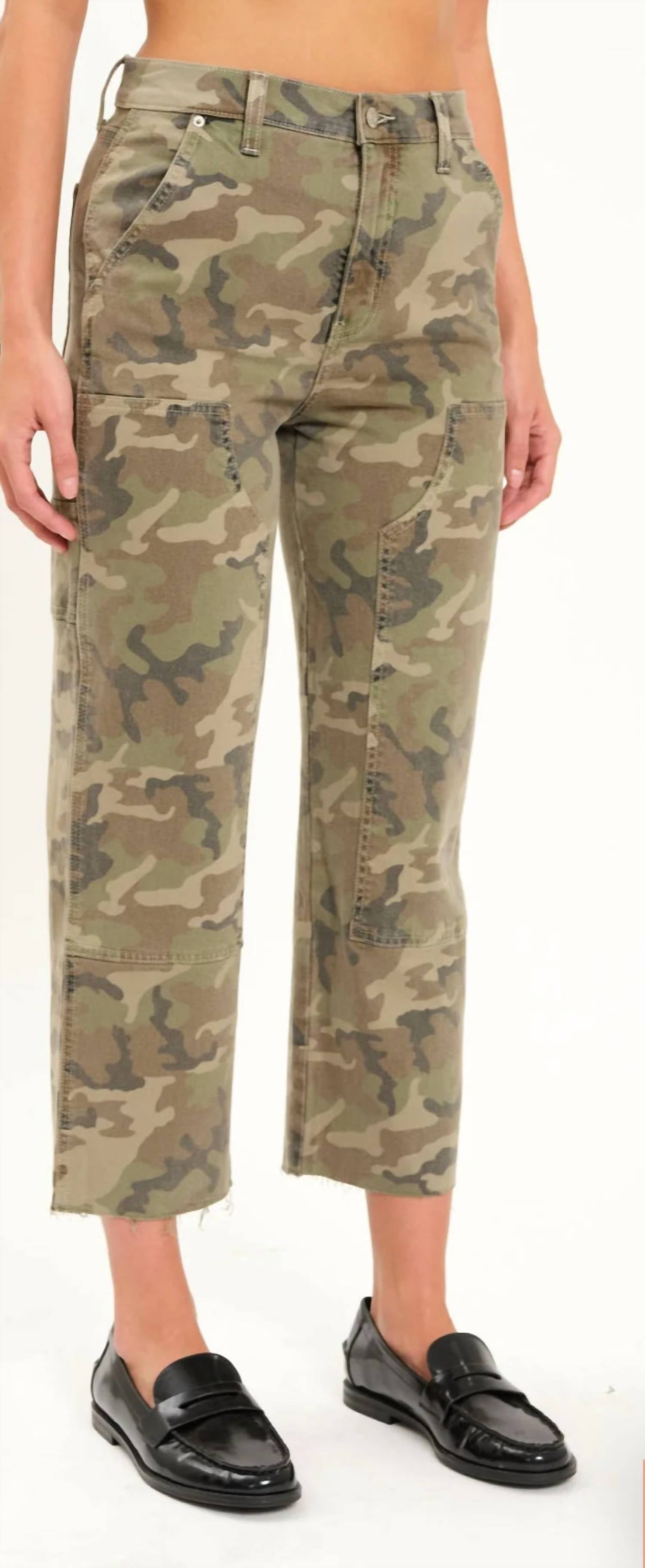 Tuck your favorite tee into these high-waist jeans for a more casual-cool feel. Discover the Sundaze Hideaway Cropped Pants by DAZE, offering a playful twist on utilitarian style in a classic camouflage print. These high-rise, relaxed-fit pants feature a comfy cotton blend with a hint of spandex and showcase patch-style pockets and visible stitching for added texture. With a straight leg and cropped length, they offer a casual comfort perfect for spring vacation outings. Composition: 61.6% Cotton, 37.3% Organic Cotton, 1.1% Spandex. Closure: Button closure. Care: Machine wash, tumble dry. Rise: 11.5", Inseam: 31".