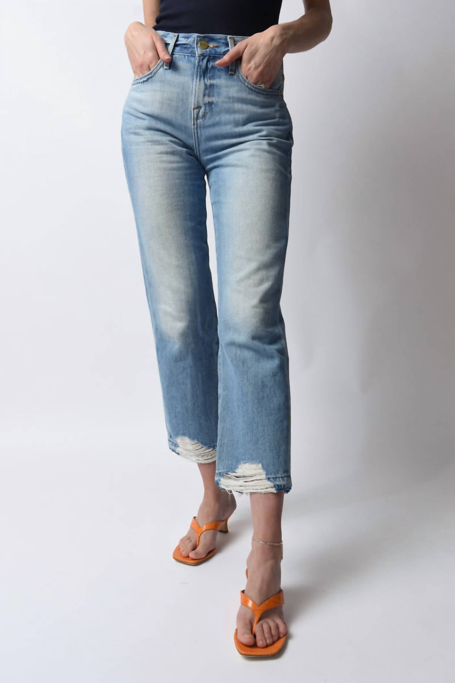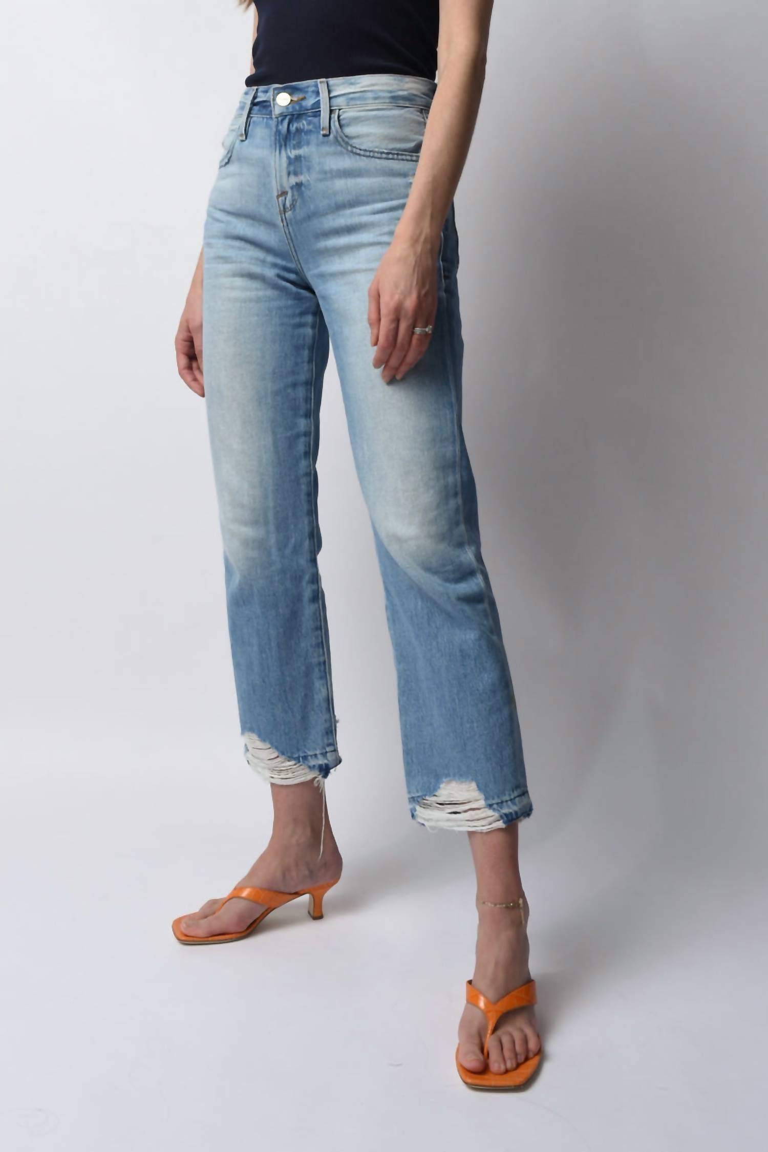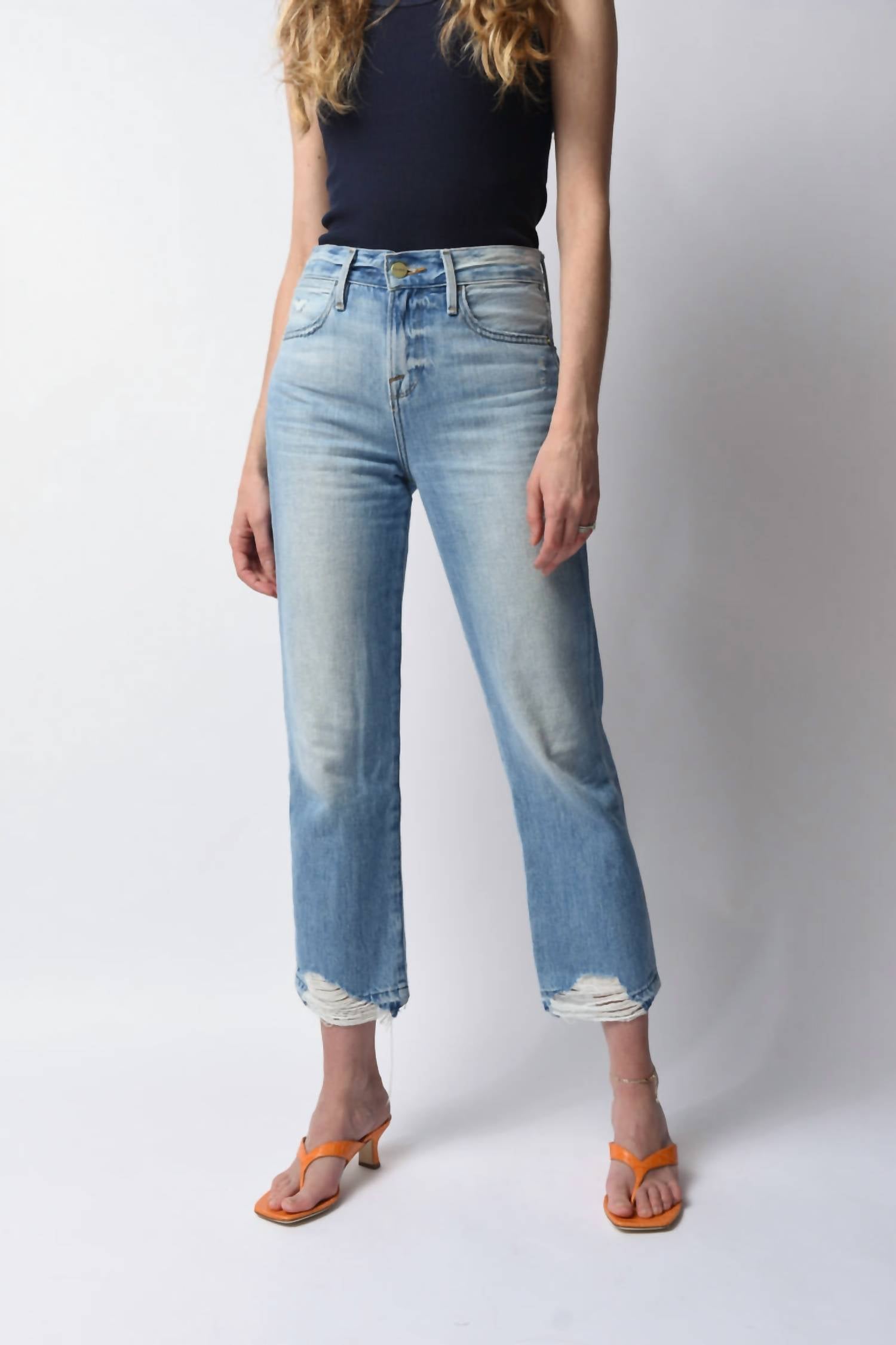 Tuck your favorite tee into these high-waist jeans for a more casual-cool feel. Step into effortless style with the Le Hollywood Crop Released Hem Jeans by FRAME in the chic Fullerton shade. Designed as high-rise jeans with a button closure, these offer a flattering relaxed fit throughout the hips and back, with straight legs and a slightly cropped length. Made from 100% rigid cotton denim, these jeans feature a distressed hem and five-pocket styling for added versatility. Imported and easy to care for, simply machine wash cold and tumble dry as needed, making them perfect for summer vacation ensembles.