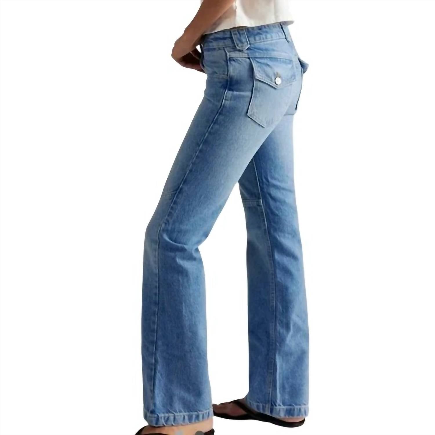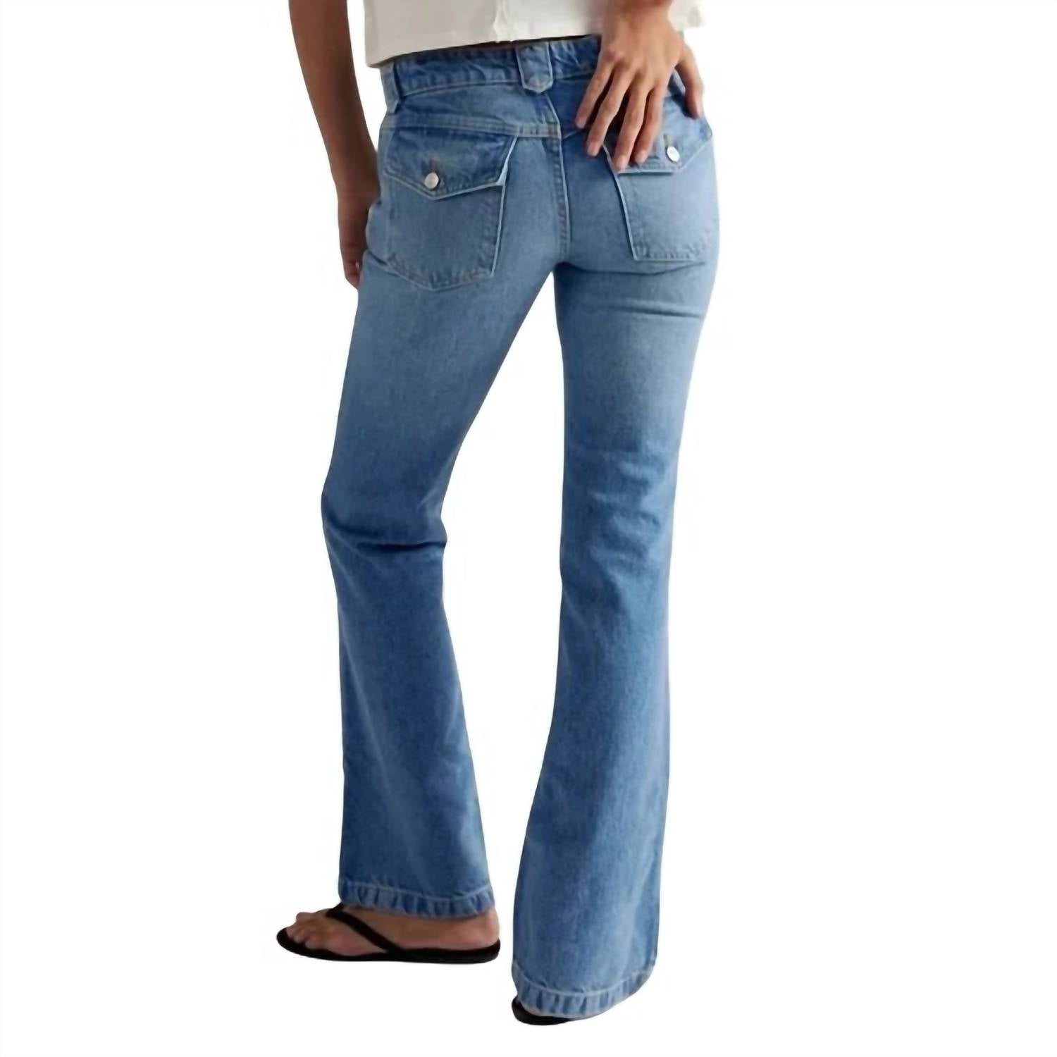 Fit to perfection, we love these high-waist jeans and you will too. Discover the Flora Low Rise Bootcut Jeans by Free People, a nod to timeless style with a modern twist. These full-length jeans are crafted in a soft denim blend of 57% Lyocell and 43% Cotton, featuring a regular fit with a low-rise waist and classic bootcut legs. Designed in the Mai Tai color, they offer a 32.5-inch inseam with practical 5-pocket styling and a button-fly closure. Care instructions: Machine wash. Measurements include a rise of 8.5 inches, a waist of 28 inches, and a length of 41 inches when laid flat.