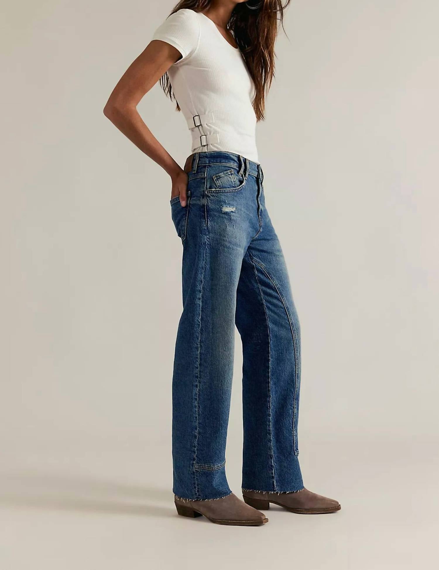 High-waist is here to stay and we especially love this style. Introducing the Risk Taker Mid Rise Jeans by Free People, a staple for your summer wardrobe. Crafted from solid blue denim, these medium-wash jeans feature a mid-rise waist and a true straight leg silhouette for understated elegance. Designed with a comfortable regular fit, they include a button closure, five-pocket design, and an ankle-length frayed hem for a stylish touch. Care for your jeans effortlessly with machine wash and tumble dry instructions, perfect for back-to-school and streetwear trends.