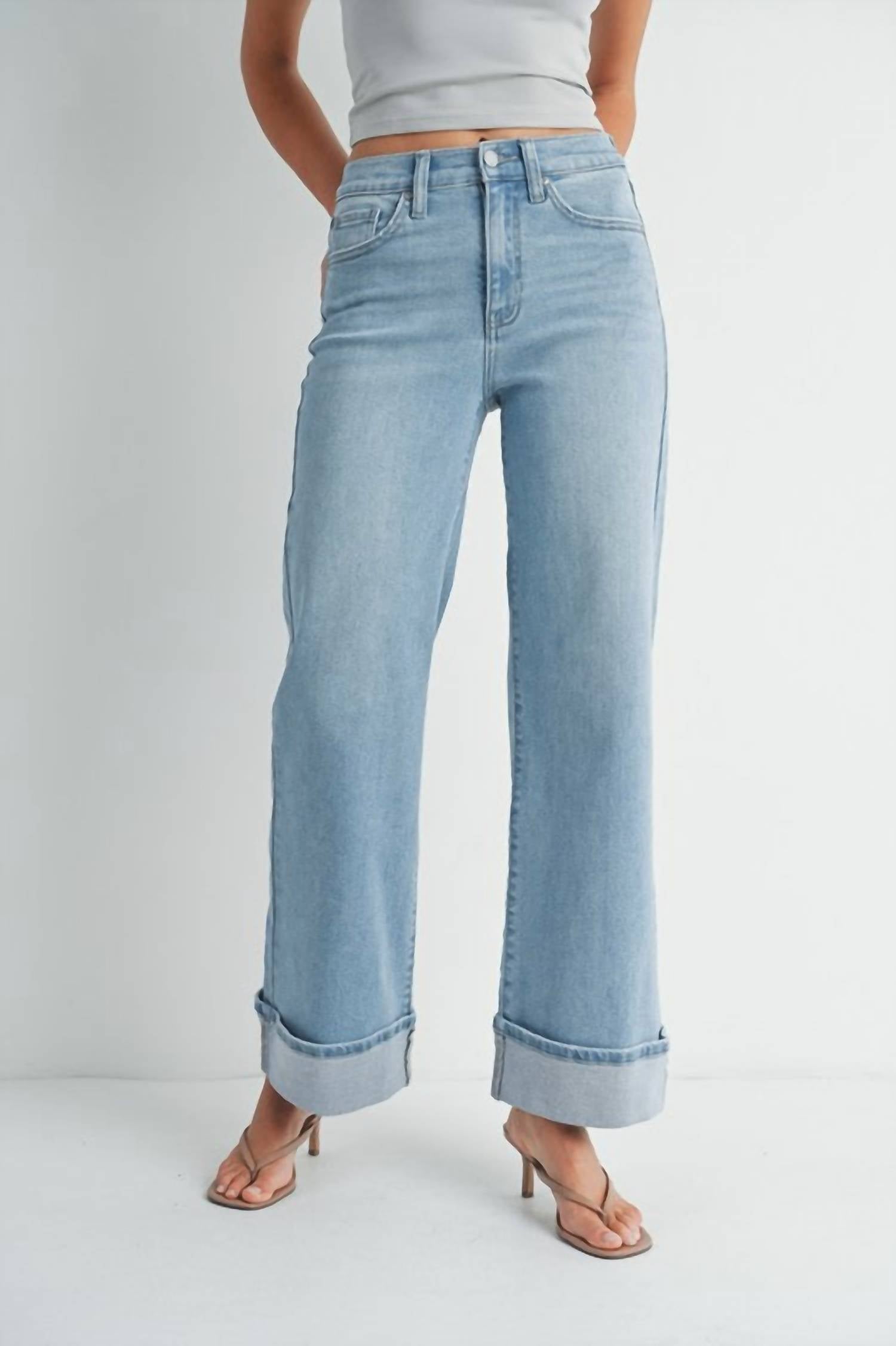 Tuck your favorite tee into these high-waist jeans for a more casual-cool feel. Elevate your wardrobe with the High Rise Cuffed Palazzo Jeans by JBD, crafted in a light denim for a chic look. These jeans are made from a cotton blend, featuring 93% Cotton, 5% Polyester, and 2% Spandex, promising both comfort and flexibility. They boast a wide-leg silhouette with a stylish cuffed hem and come equipped with a button and zip fly closure, functional pockets, and belt loops. Perfect for any occasion, these jeans are machine washable, ensuring easy maintenance.