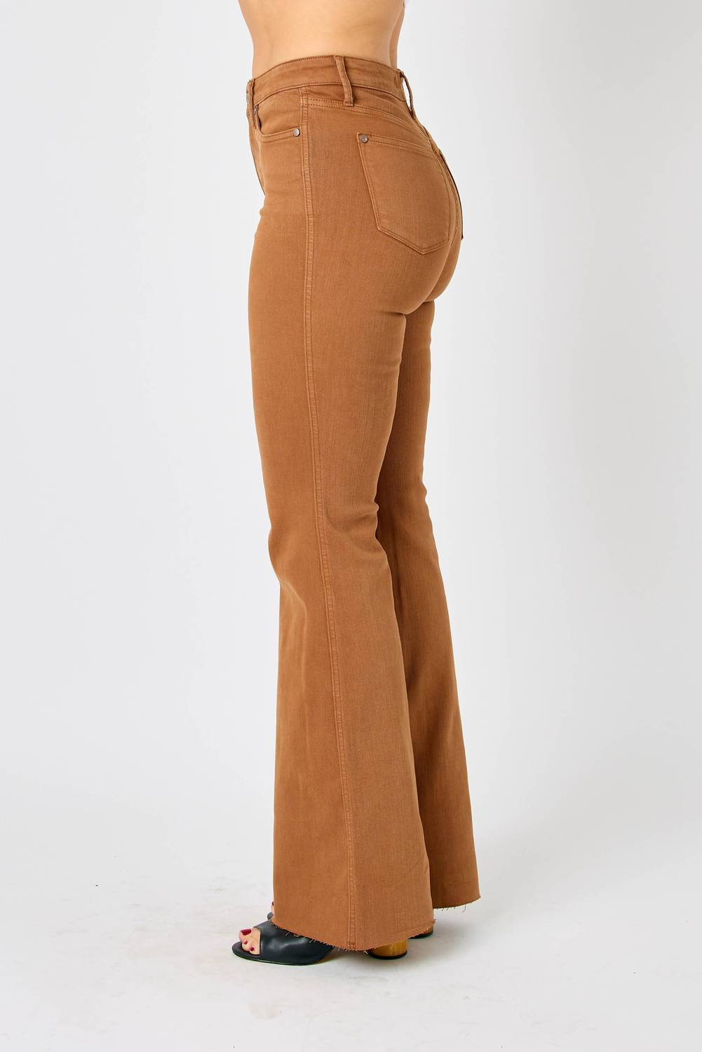 Tuck your favorite tee into these high-waist jeans for a more casual-cool feel. Presenting the Emily High Rise Flare Jeans by Judy Blue, a chic addition to your wardrobe in a garment-dyed brown hue. These women's jeans feature a high rise with a tummy control style for a flattering fit, and a flared leg for a touch of retro charm. Composition: 93% Cotton, 6% Polyester, 1% Spandex. Closure: Zip closure. Designed with pockets for convenience, these jeans boast a medium wash perfect for workwear and versatile occasions such as spring outings and Thanksgiving celebrations. Care: Machine wash and tumble dry for easy maintenance. Rise is 11.25" with an inseam of 33.5".