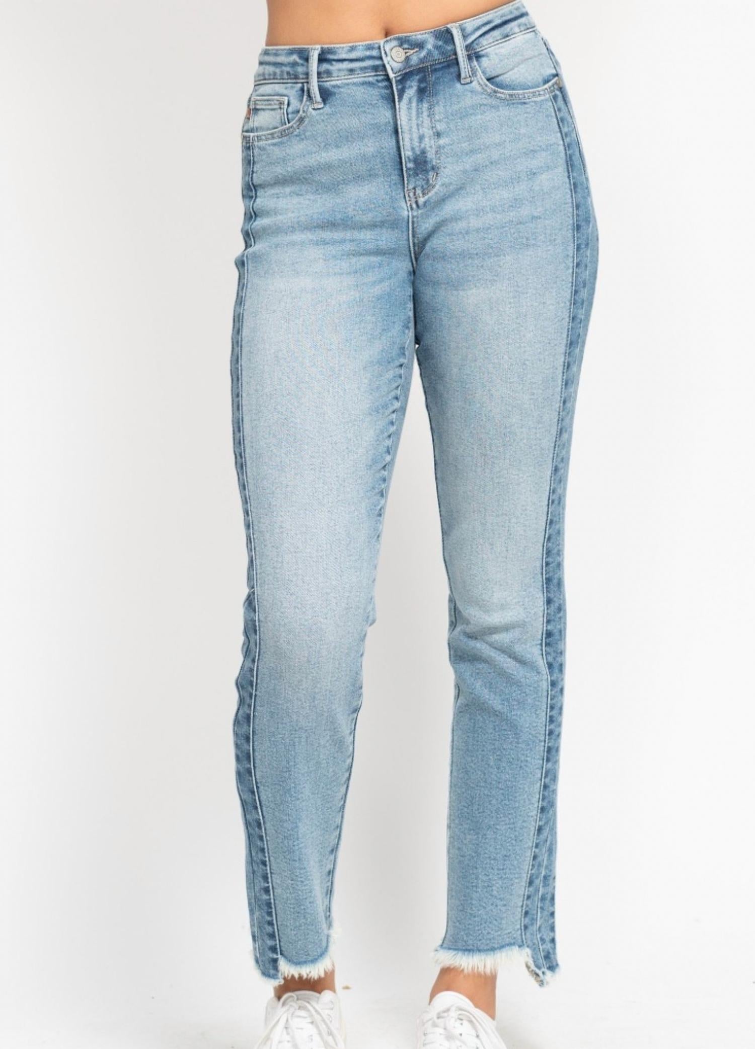 Tuck your favorite tee into these high-waist jeans for a more casual-cool feel. Elevate your denim game with the Judy Blue High Rise Slim Fit Jeans in a vintage wash. These jeans are tailored to highlight your curves with a flattering high rise and feature a 10.75" rise and 29" inseam for a perfect fit. Crafted from a comfortable cotton blend composition of 94% Cotton, 5% Polyester, and 1% Spandex, these jeans include stylish side panel details and an edgy hi/lo fray hem. Closure: Button closure. Care: Machine wash recommended. Ideal for adding flair to your streetwear look this spring or on a 4th of July trip.