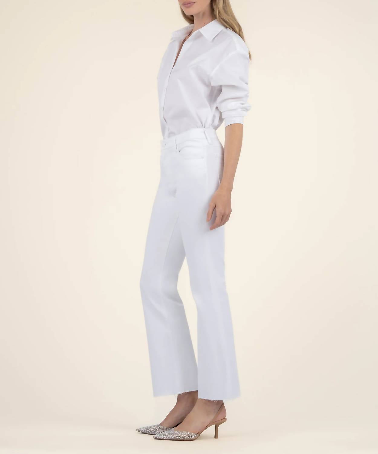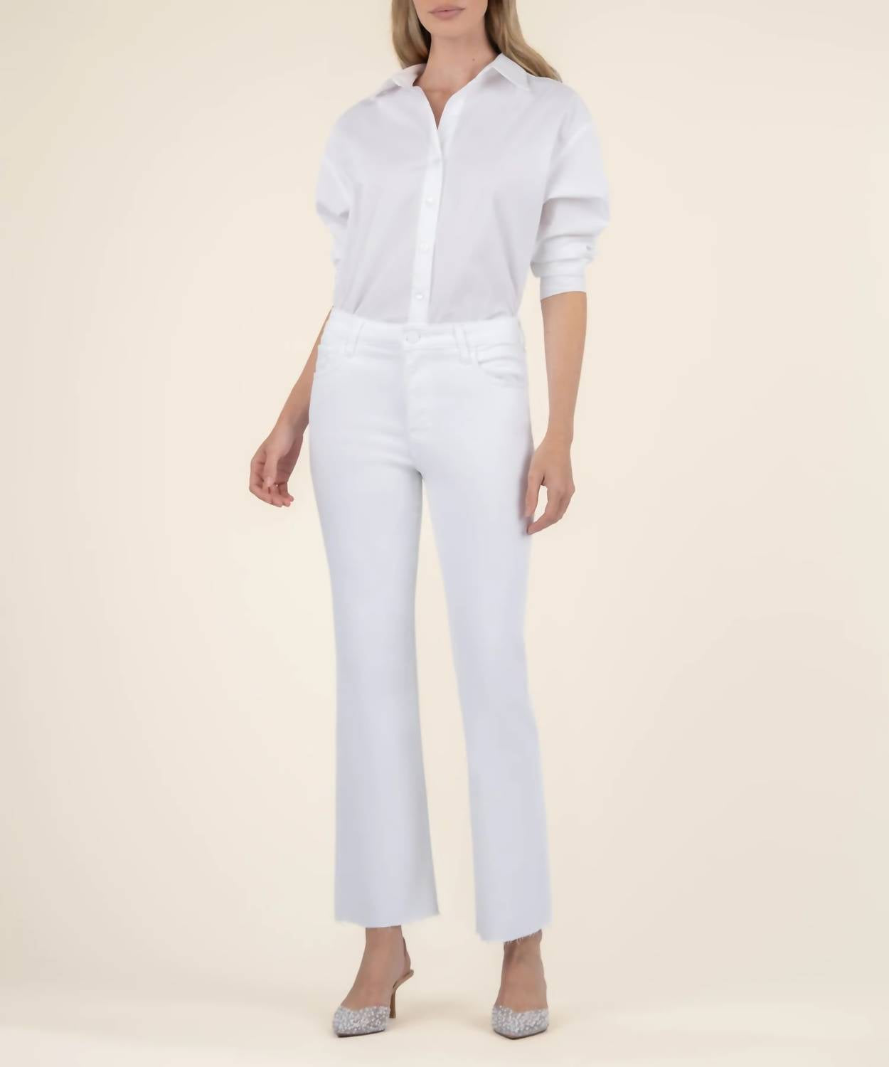 Fit to perfection, we love these high-waist jeans and you will too. Introducing the Kelsey High Rise Ankle Flare Jeans by KUT FROM THE KLOTH, crafted from a comfortable Cotton Blend of 98% Cotton and 2% Spandex. These optic white jeans feature a trendy raw hem with a relaxed fit, high waist, and a flared leg, cropped to an ankle length with an inseam of 27.25 inches and a rise of 10.25 inches. Designed with practicality in mind, they include pockets and feature a button closure. To maintain their fresh look, simply machine wash and tumble dry.