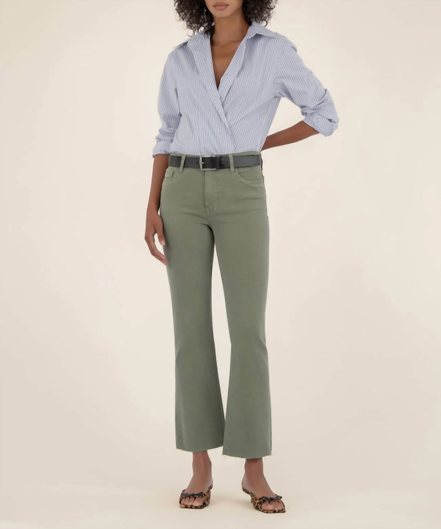 High-waist is here to stay and we especially love this style. Introducing the Kelsey High Rise Fab Ab Ankle Jeans by KUT FROM THE KLOTH, the perfect choice for your spring wardrobe in a chic sage hue. Made from a comfortable cotton blend, these jeans feature a high-rise and relaxed fit with a trendy flared leg. The solid pattern coupled with a button closure and convenient pockets adds both style and functionality. These minimalist jeans are perfect for a holiday party or Thanksgiving celebration, reflecting your sense of elegance and ease.