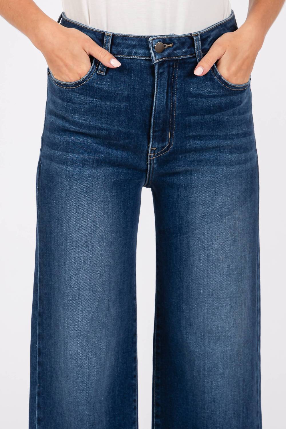 Elevate your style with the Pipa High Rise Superwide Jeans by Letter to Juliet, offering a flattering 11" high-rise waist for a lengthened silhouette. Crafted from comfort-stretch denim composed of 92.6% cotton, 5.5% polyester, and 1.9% spandex, these jeans feature a superwide 24" leg opening and a full-length 32" inseam, perfect for pairing with boots or heels. Made in the USA, they come in a statement dark wash suitable for day-to-night styling, boasting deep pockets and a button closure for added functionality. Care instructions include machine washing and tumble drying.
