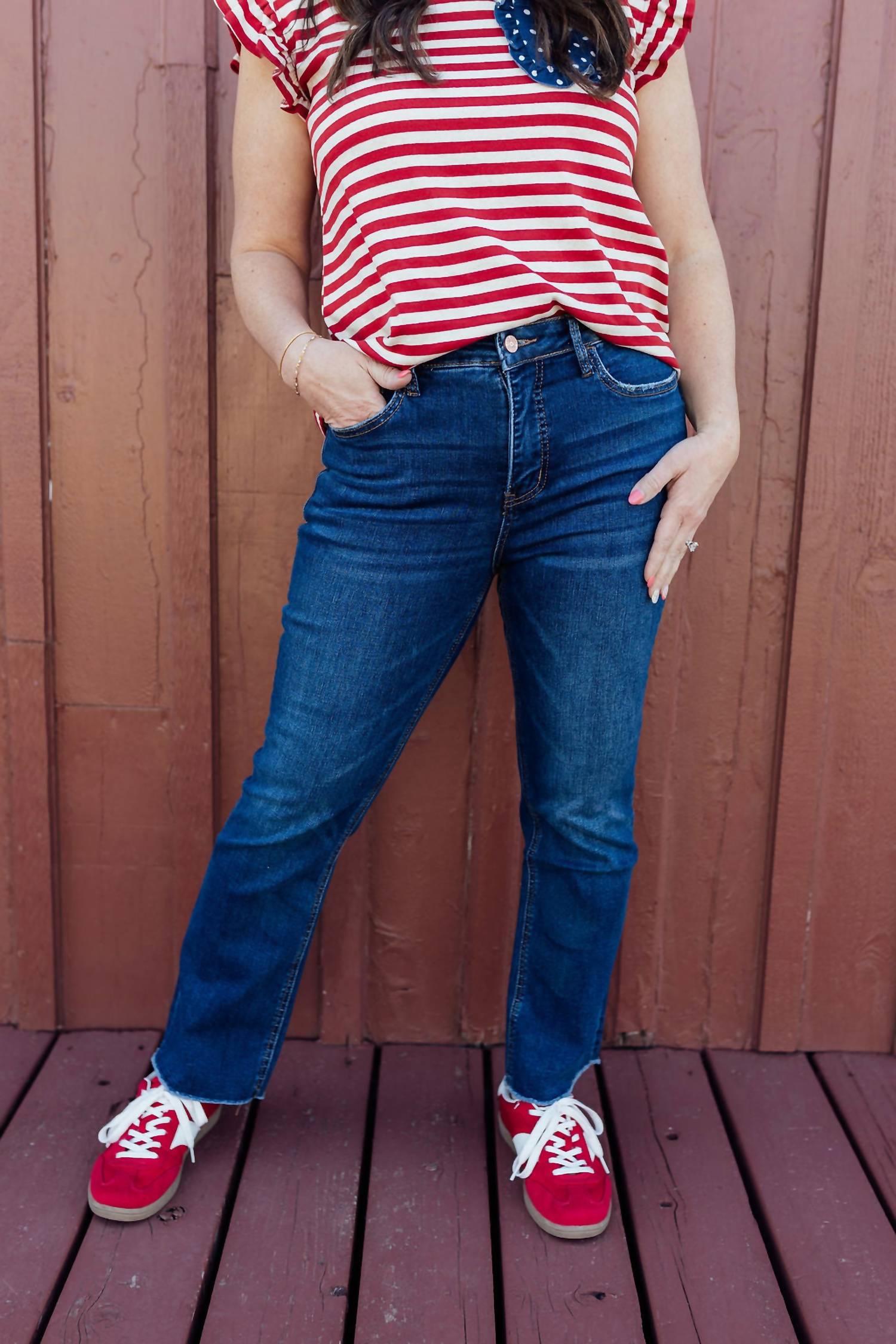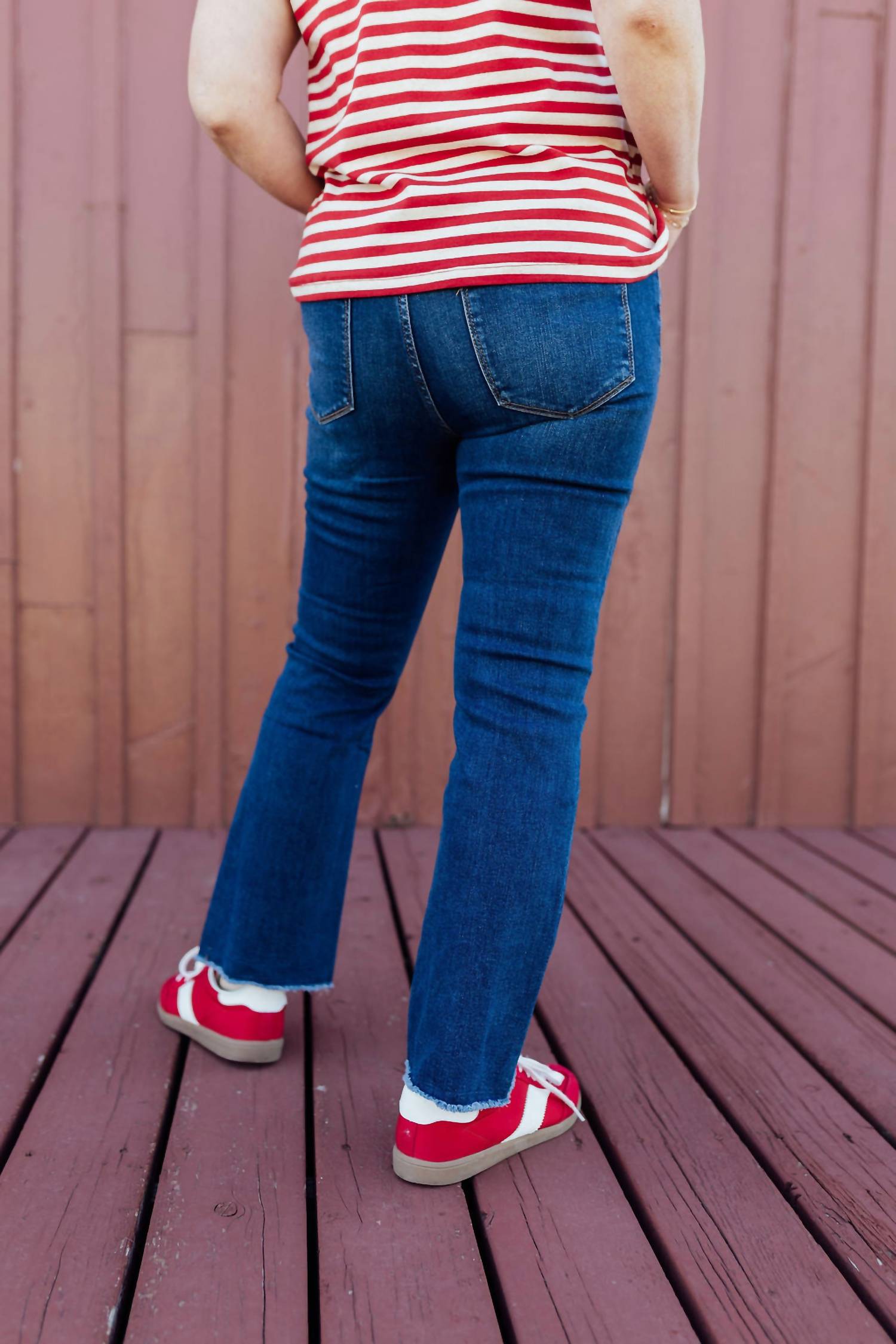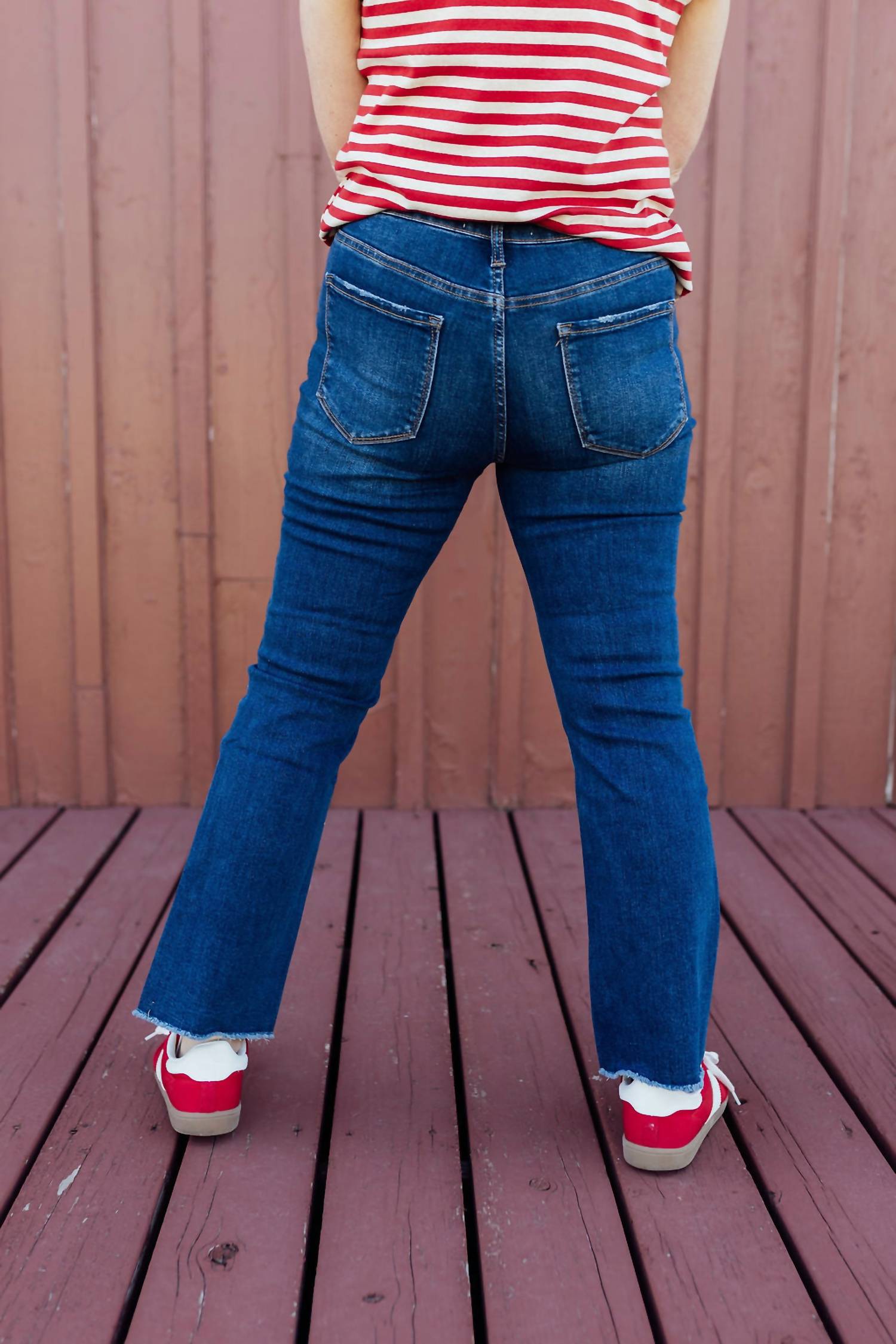 Tuck your favorite tee into these high-waist jeans for a more casual-cool feel. Discover the Seabrook Beach High Rise Jeans by Lovervet, designed to bring coastal flair to your everyday wardrobe. These jeans feature a high rise fit with a flattering flare cut and playful raw hem, all in a chic dark wash. Crafted from a cotton blend of 93% Cotton, 5.4% Polyester, and 1.6% Spandex, they promise comfort and durability. Care: Wash inside out, machine wash cold, do not bleach, tumble dry low, iron low, or dry clean.