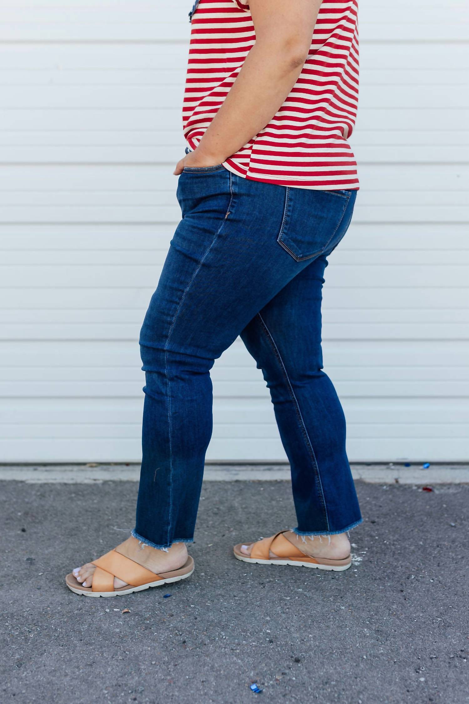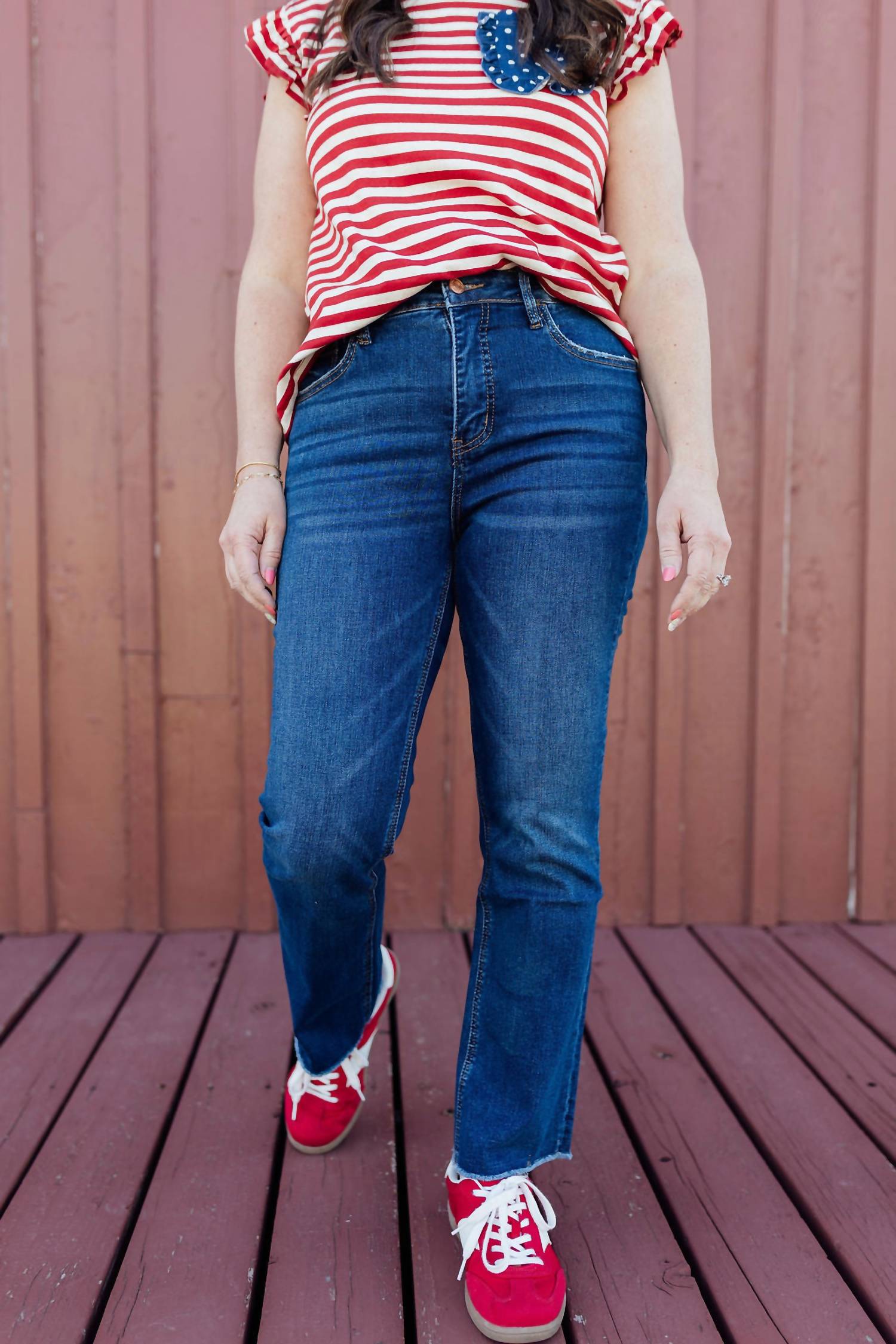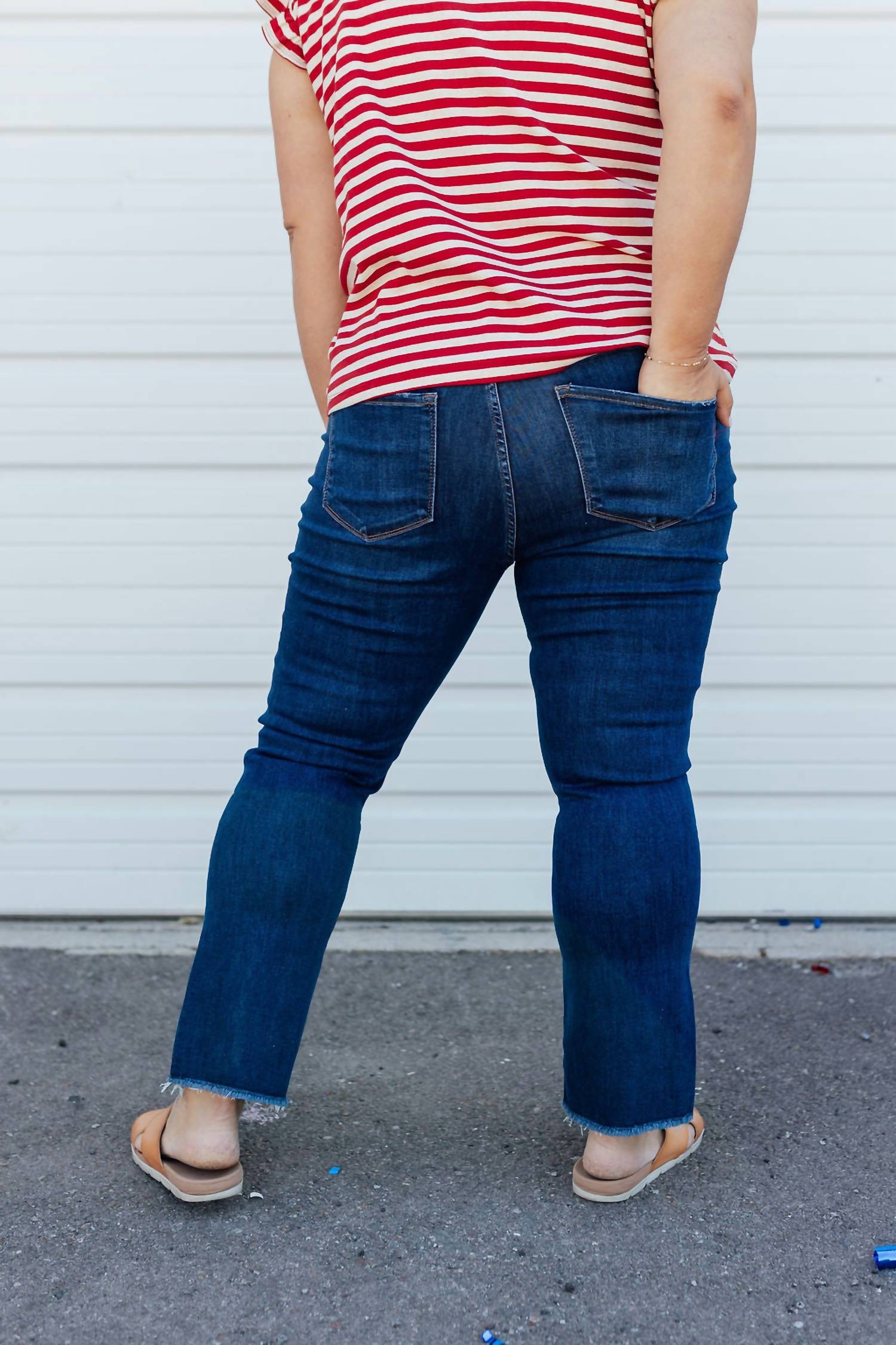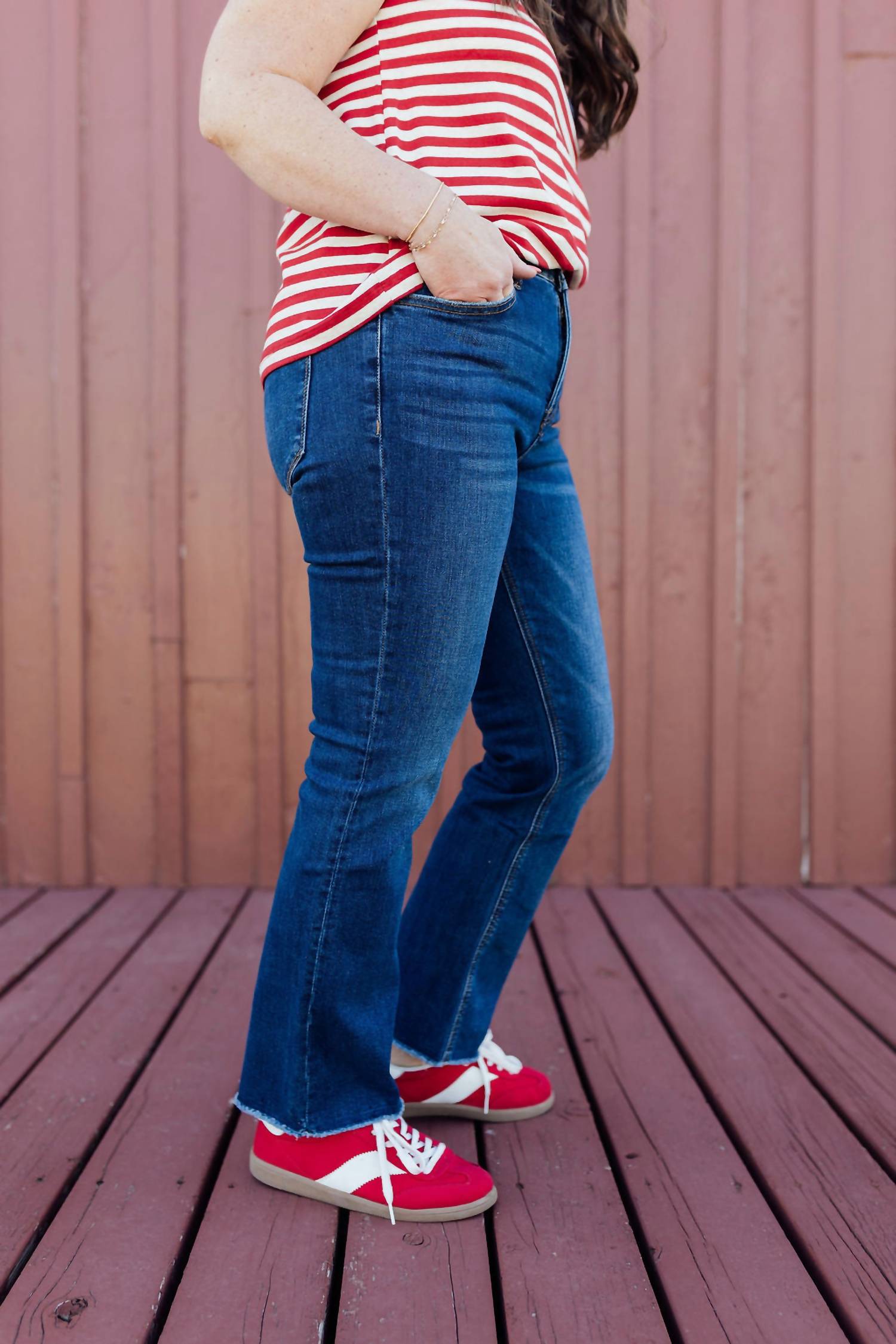 Tuck your favorite tee into these high-waist jeans for a more casual-cool feel. Discover the Seabrook Beach High Rise Jeans by Lovervet, designed to bring coastal flair to your everyday wardrobe. These jeans feature a high rise fit with a flattering flare cut and playful raw hem, all in a chic dark wash. Crafted from a cotton blend of 93% Cotton, 5.4% Polyester, and 1.6% Spandex, they promise comfort and durability. Care: Wash inside out, machine wash cold, do not bleach, tumble dry low, iron low, or dry clean.