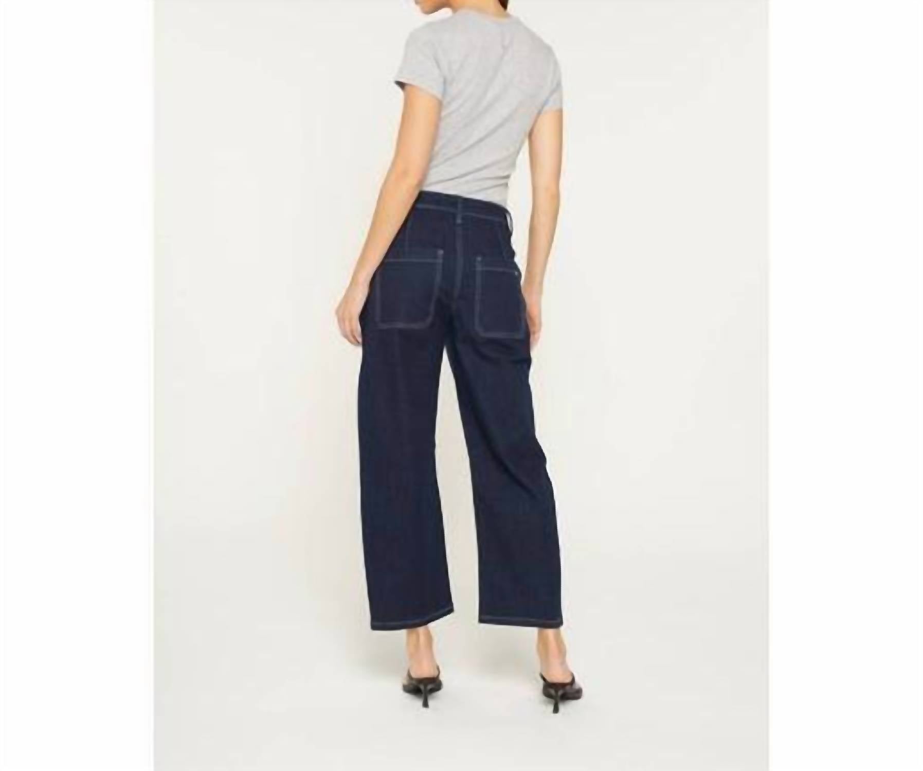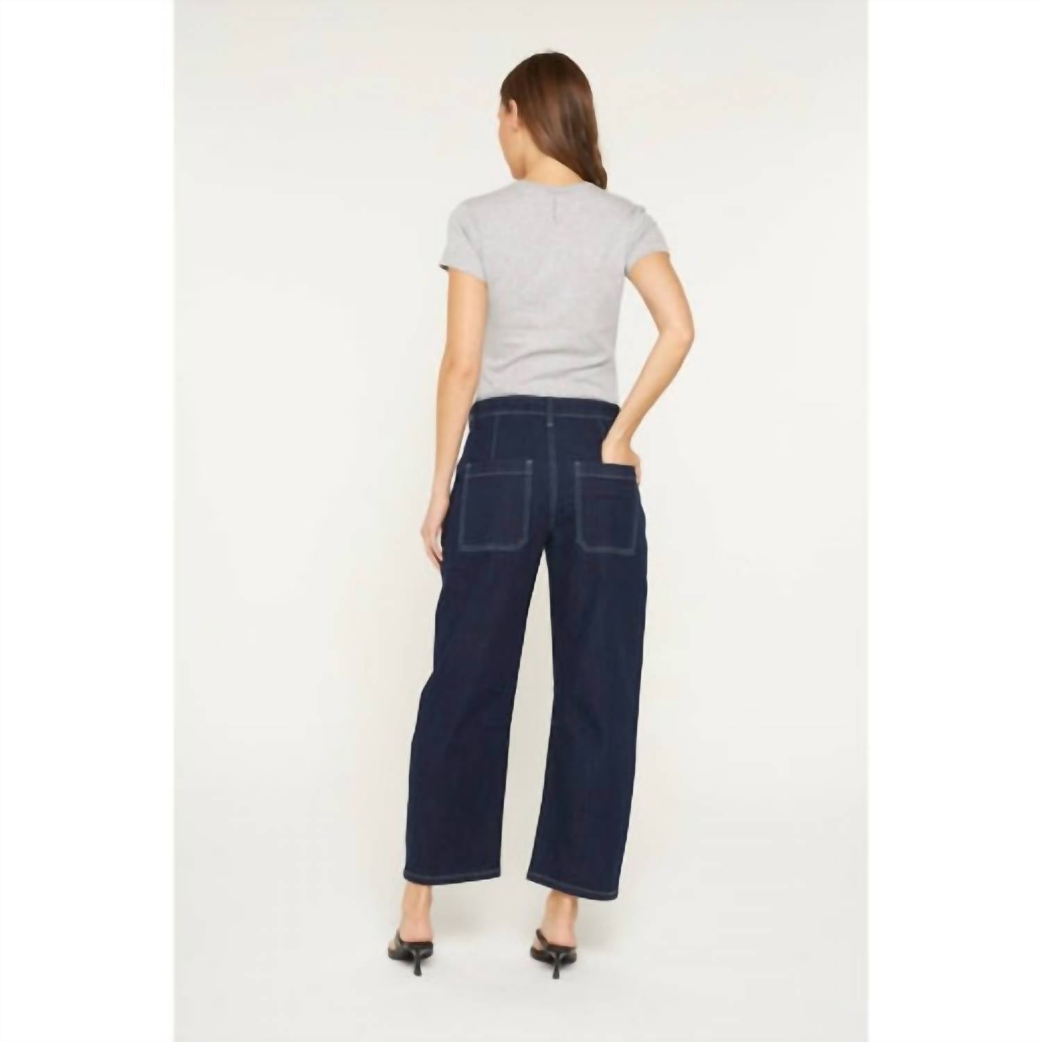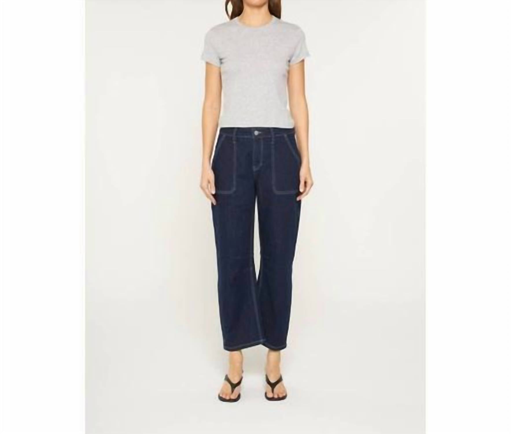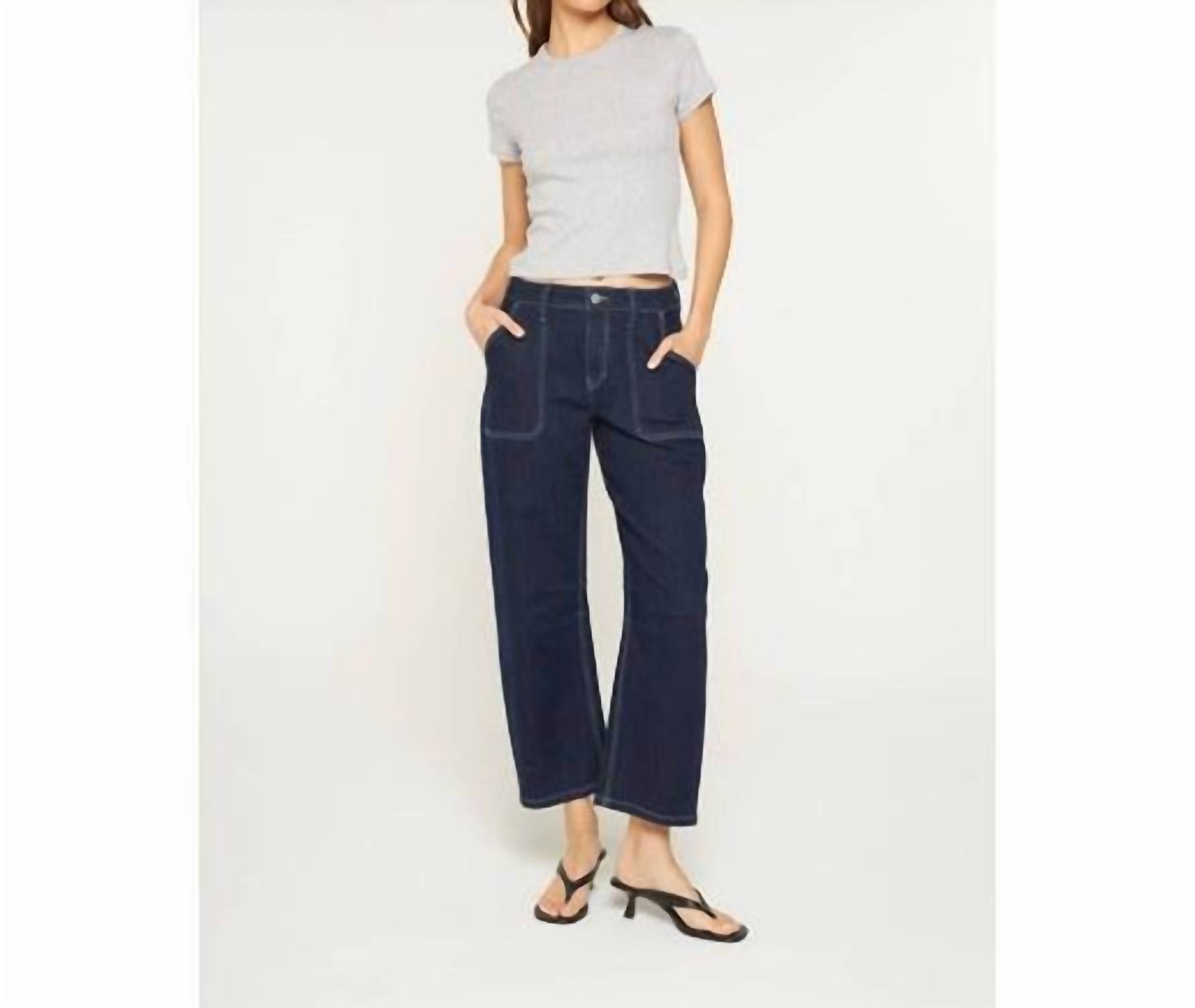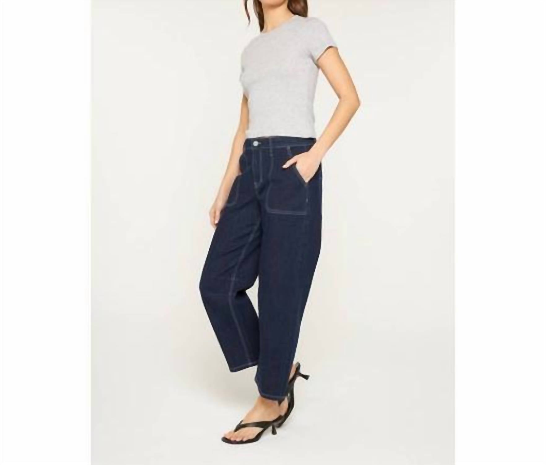 Fit to perfection, we love these high-waist jeans and you will too. Discover the Mica Denim Barrel Leg Jeans in a deep blue shade, designed for ultimate style and comfort. These high-rise jeans feature a flattering 10.5" front rise and trendy barrel leg silhouette with a leg opening of 17", perfect for a modern look. Made from a soft cotton blend, they boast a cropped 26" inseam and a versatile button closure. Whether paired with boots, loafers, or heels, these dark wash jeans are ideal for travel and everyday wear.