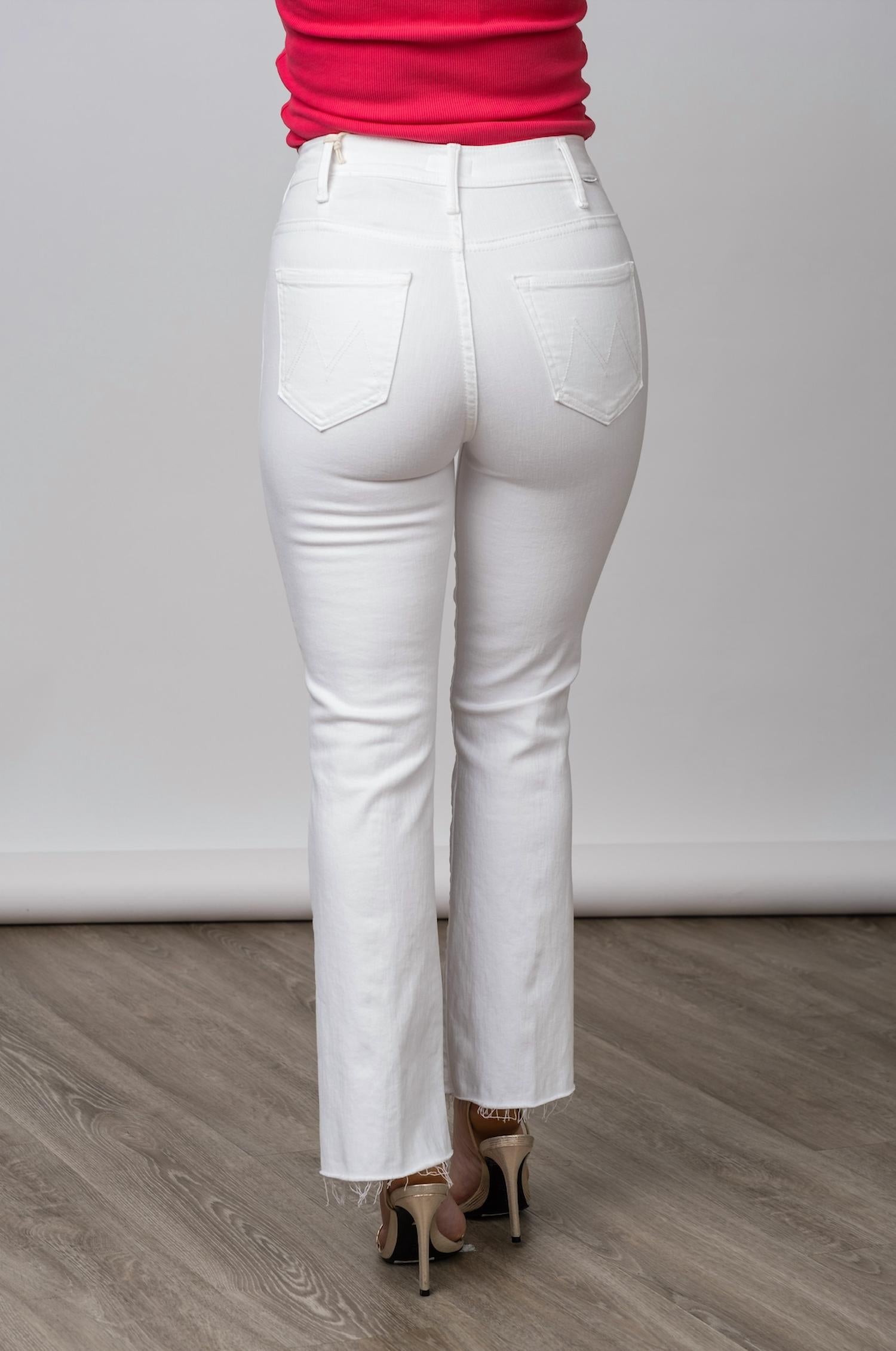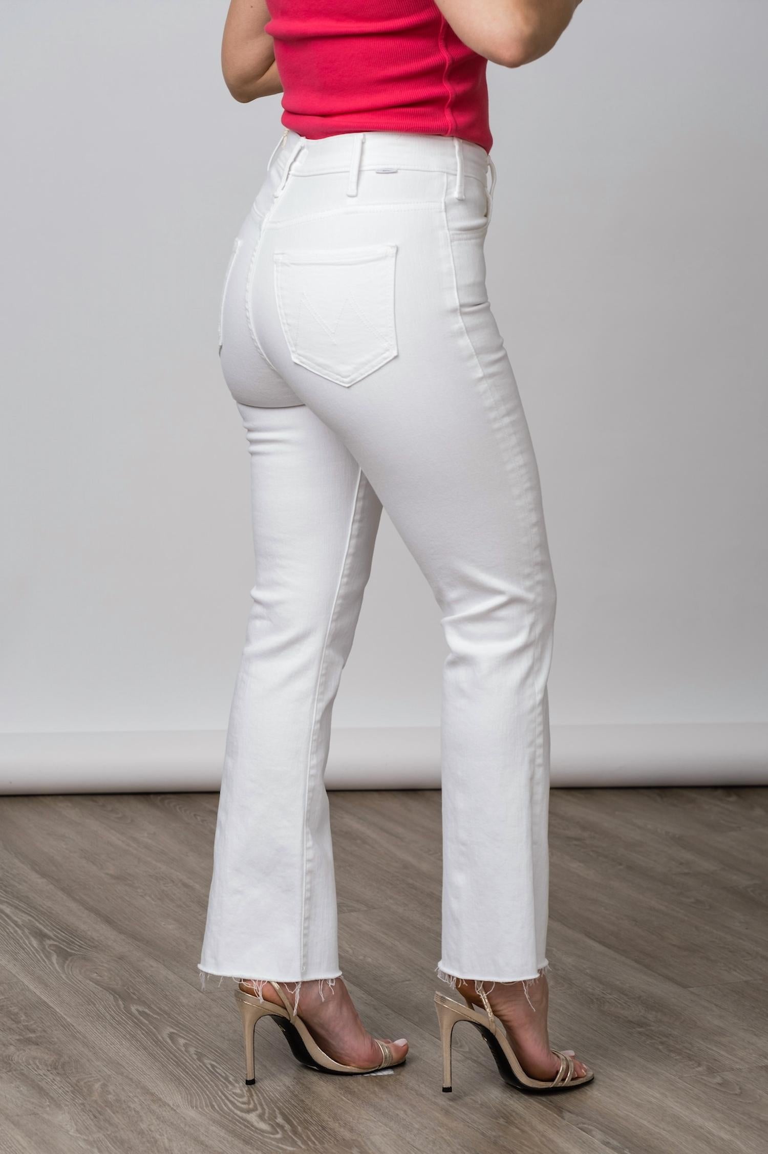 Discover the Hustler Ankle Jeans by Mother in the shade Fairest Of Them All, a top-selling addition to any wardrobe. These high-rise jeans, with an 11-inch rise and a 27.5-inch inseam, showcase a flared leg style and a distinctive raw, ankle-length hem. Crafted from a stretchy cotton blend (94% Cotton, 4% T400, 2% Lycra) and made in Los Angeles, they effortlessly combine comfort with style. The button closure ensures a secure fit, and they are designed for easy care with simple machine wash and tumble dry instructions.