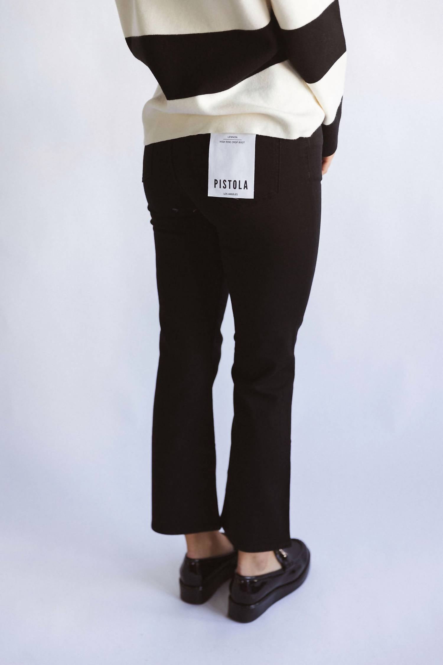 High-waist is here to stay and we especially love this style. The PISTOLA Lennon High Rise Jeans in Noir offer a modern take on denim with a sleek black fabric, perfect for versatile styling day or night. These jeans feature a flattering high-rise silhouette and subtle distressing, combining elegance with a playful edge. Made from classic denim with a bootcut leg and practical front and back pockets, they ensure both style and functionality. Closure: Zip closure. Care: Machine wash, tumble dry. Ideal for achieving a minimalist look this spring, whether on vacation or for everyday wear.
